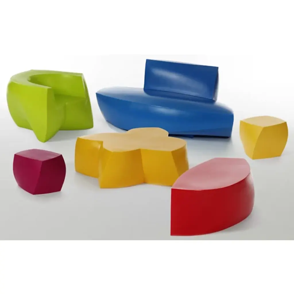 The signature sharp angles and curved planes of Frank Gehry's architecture are evident in the Heller Furniture Frank Gehry Sofa. This is made possible by putting a tough, waterproof polymer through a specialized roto-molding process. Mix and match the sofa with other pieces in the Frank Gehry collection for a playful, colorful look indoors or out.