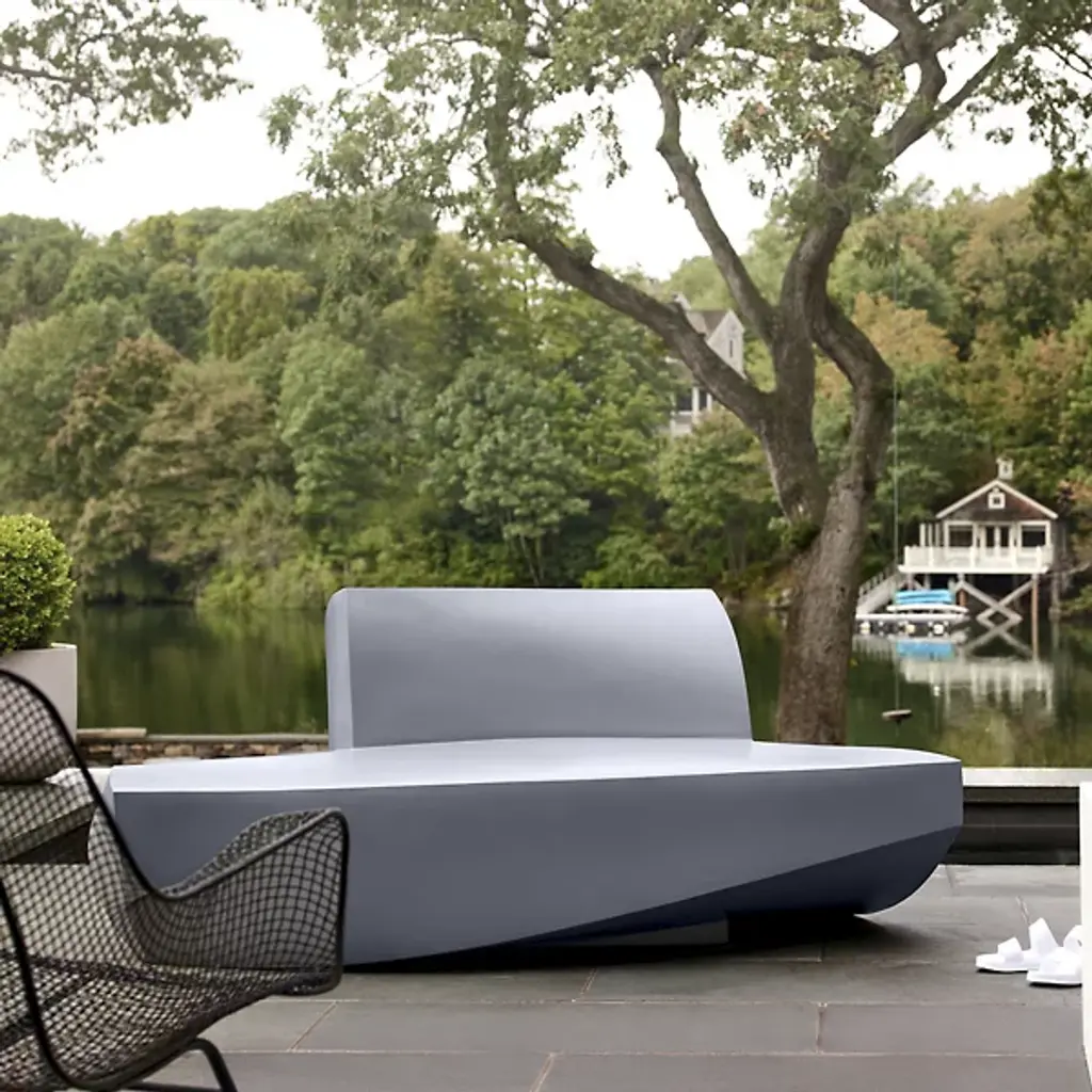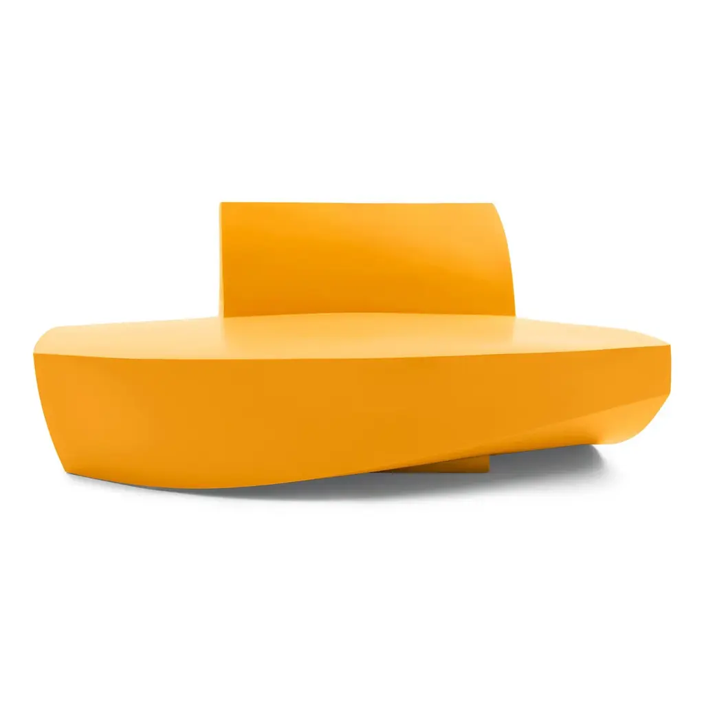 The signature sharp angles and curved planes of Frank Gehry's architecture are evident in the Heller Furniture Frank Gehry Sofa. This is made possible by putting a tough, waterproof polymer through a specialized roto-molding process. Mix and match the sofa with other pieces in the Frank Gehry collection for a playful, colorful look indoors or out.