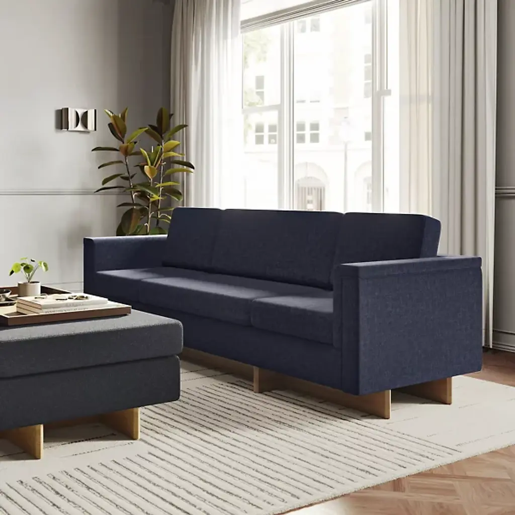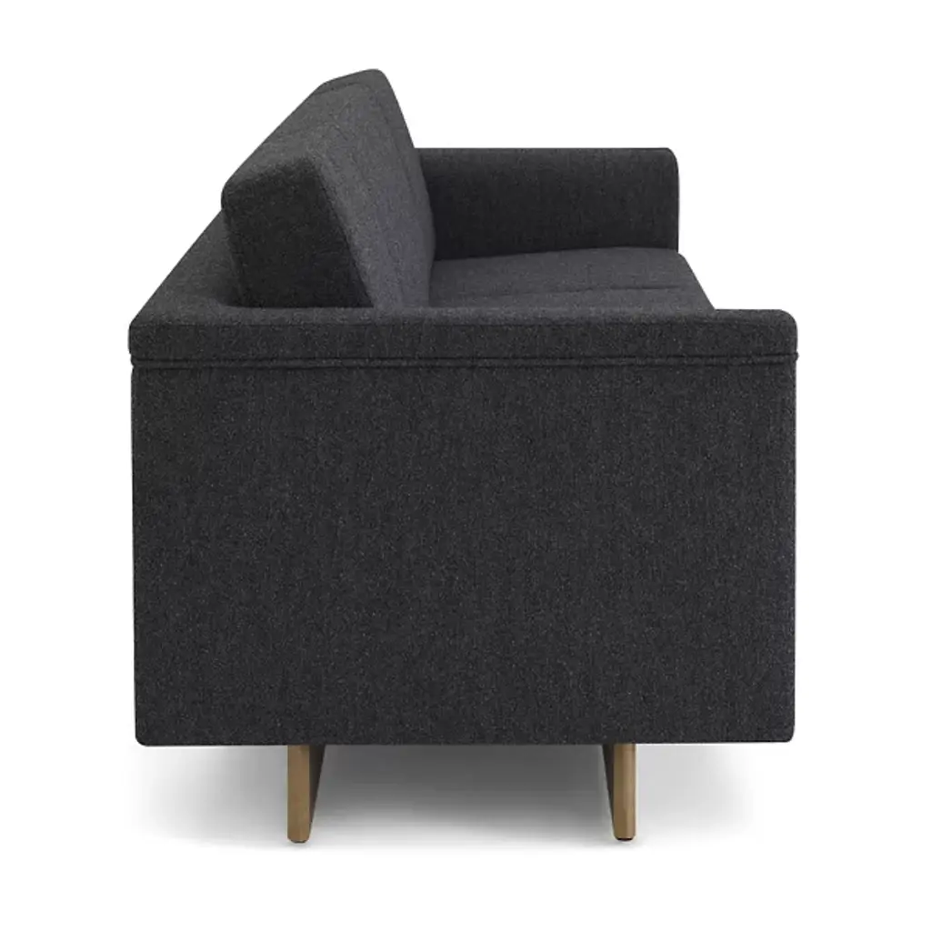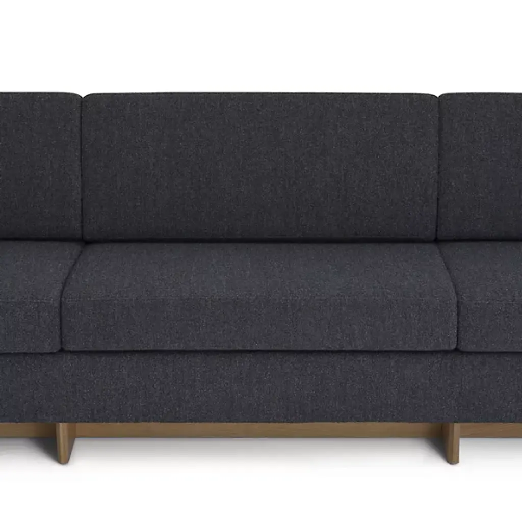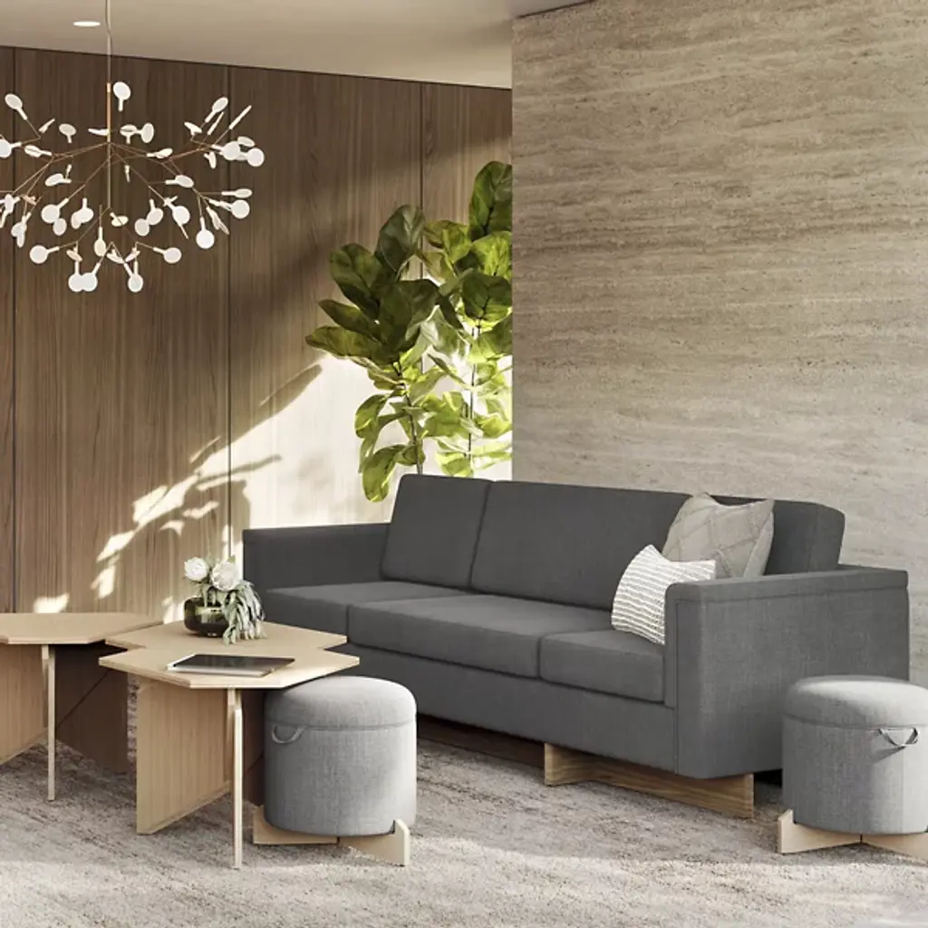 The Frank Lloyd Wright Galesburg Sofa from Steelcase merges architectural inspiration with minimalist design. The natural oak base features a crosshatched construction, accented with angular details at each beam's end introducing a bit of intricate detail to the otherwise straightforward structure, updated for the modern world but still retaining Wright's distinctive style. Cushions with plush padding rest on a wooden upper frame enveloped in soft fabric that is meticulously tailored around the corners. This detailed tailoring softens the direct lines of the sofa and contrasts beautifully with the natural wood grain of the base, creating an elegant and inviting piece.