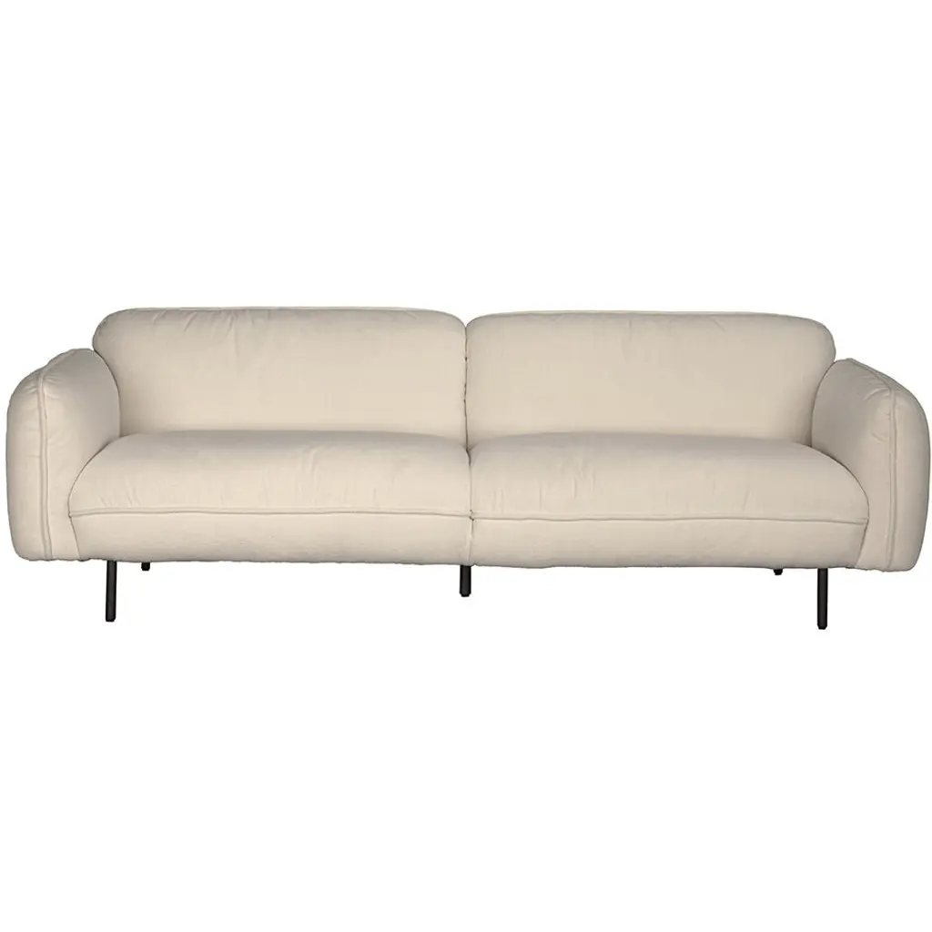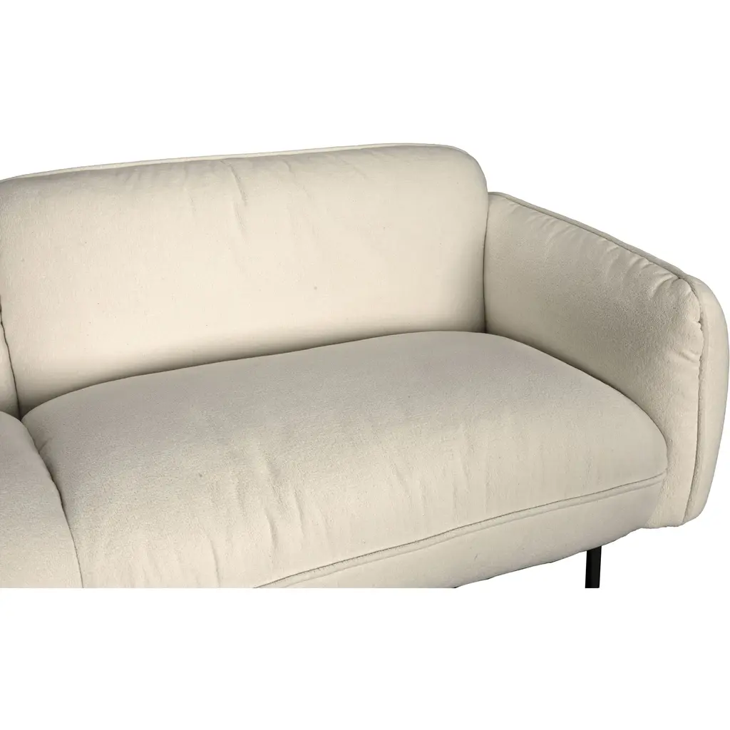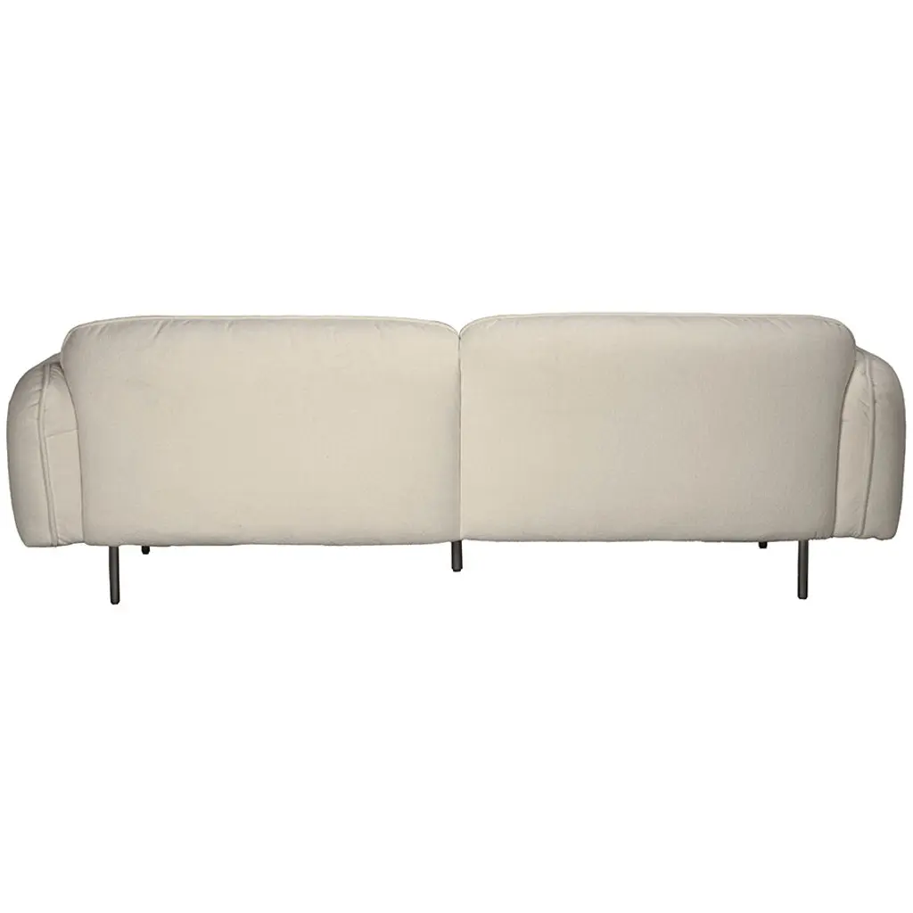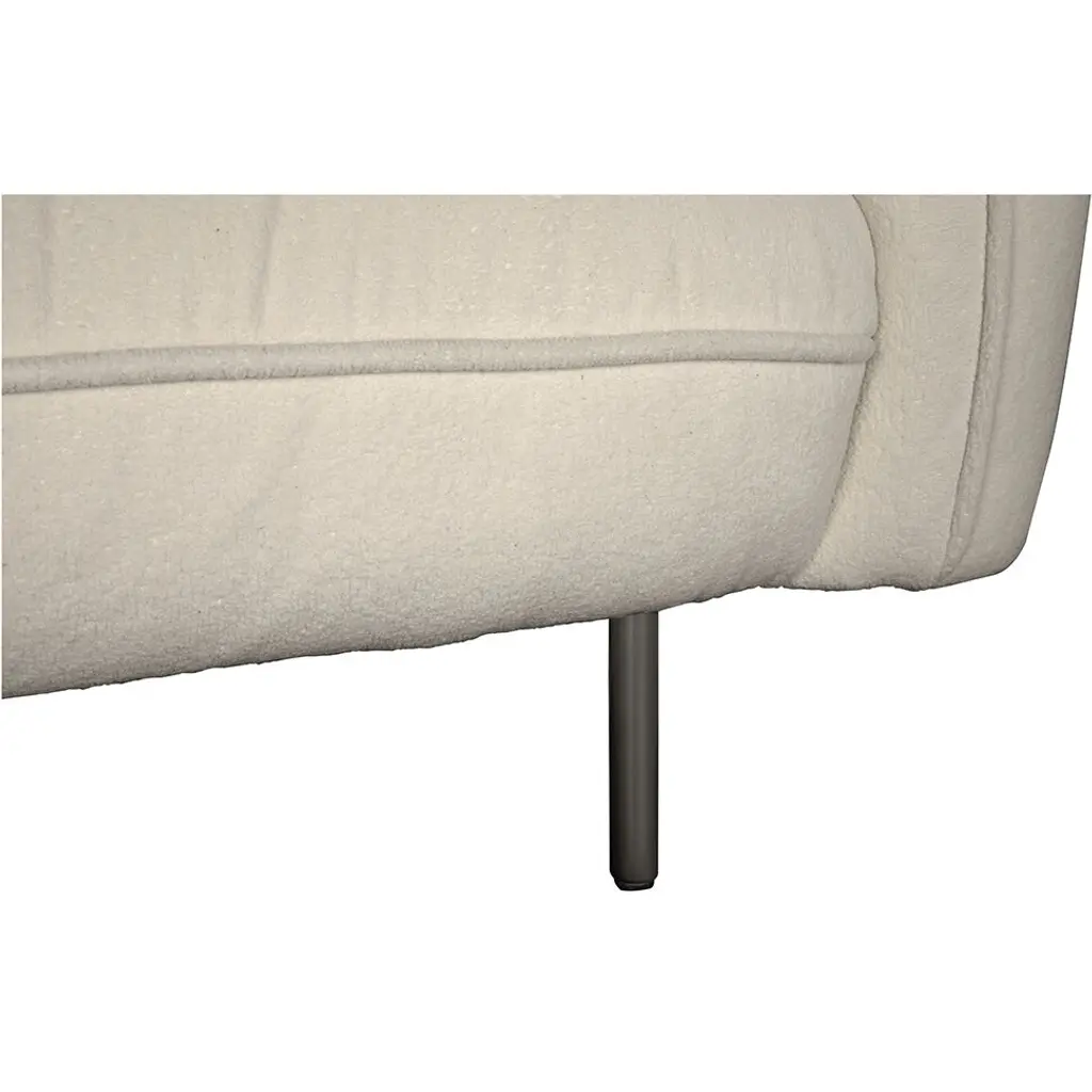 Upholstered in soft, off-white performance chenille, its textured surface contrasts beautifully with a subtle iron grey powder-coated base.