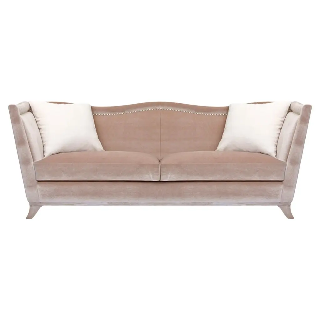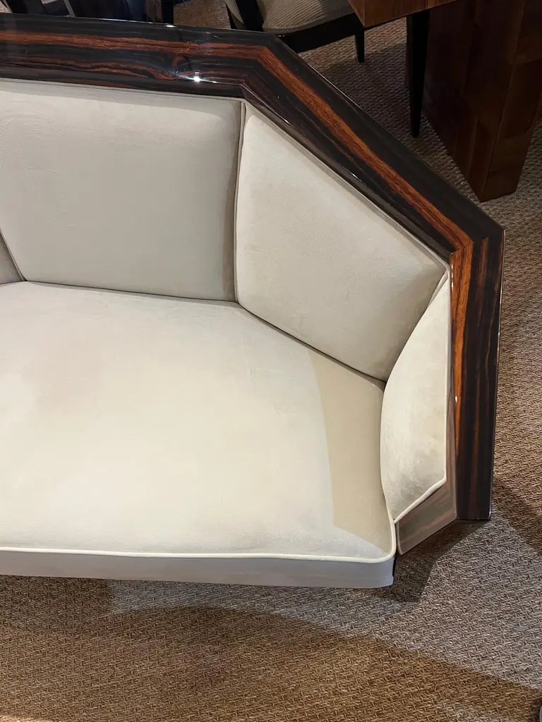 French Art Deco Sofa in the style of Pierre Chareau The sofa is made out of walnut wood, re-upholstered with a light color velvety fabric. Resting on elongated rectangular legs. The condition is very good. Restored. Farnce, c. 1930 70” x 31” x 31”, seat height is 17”