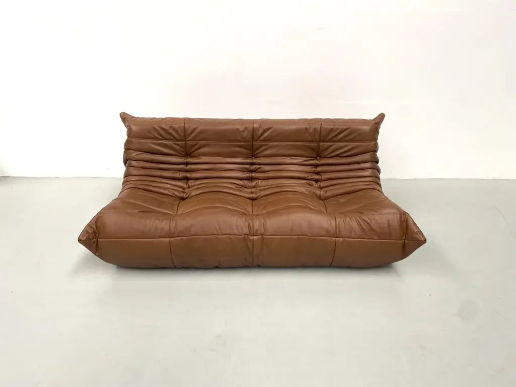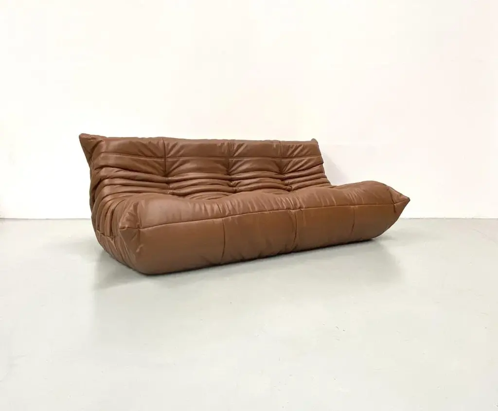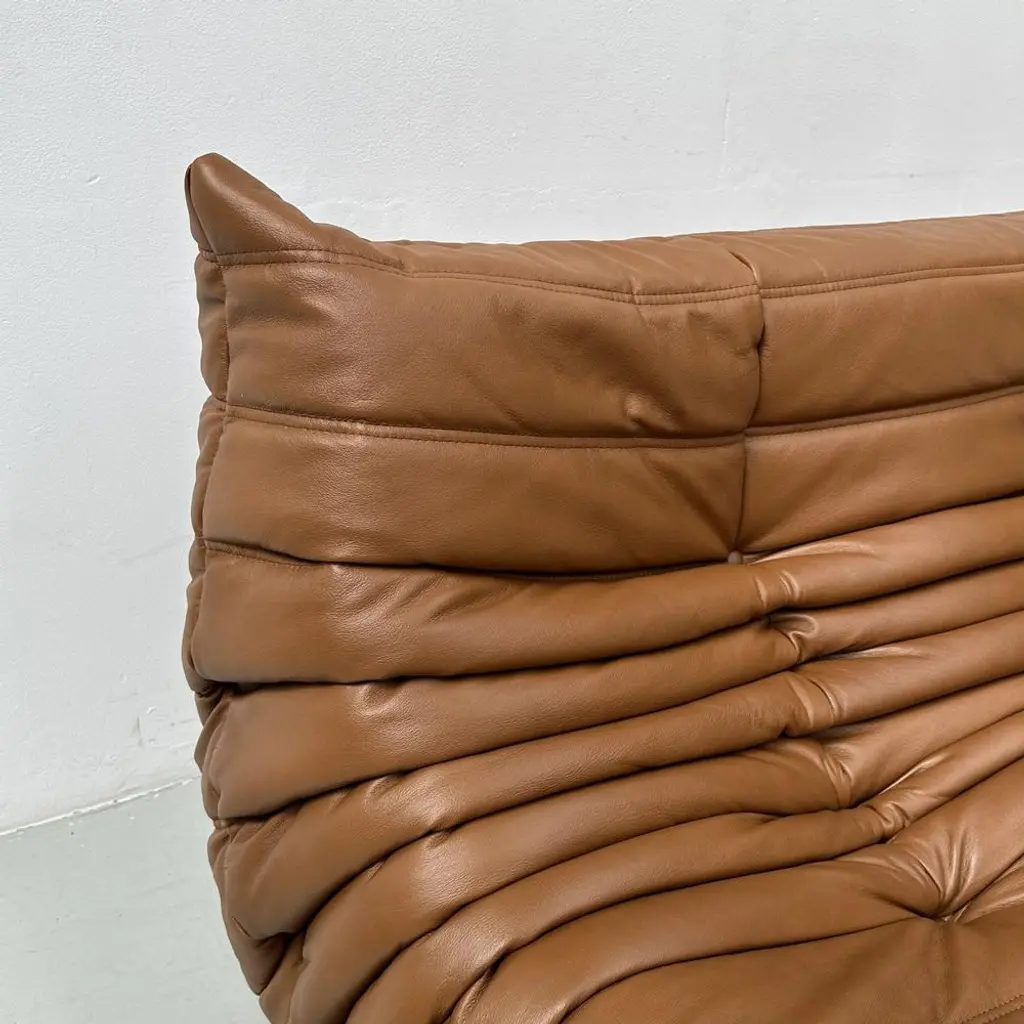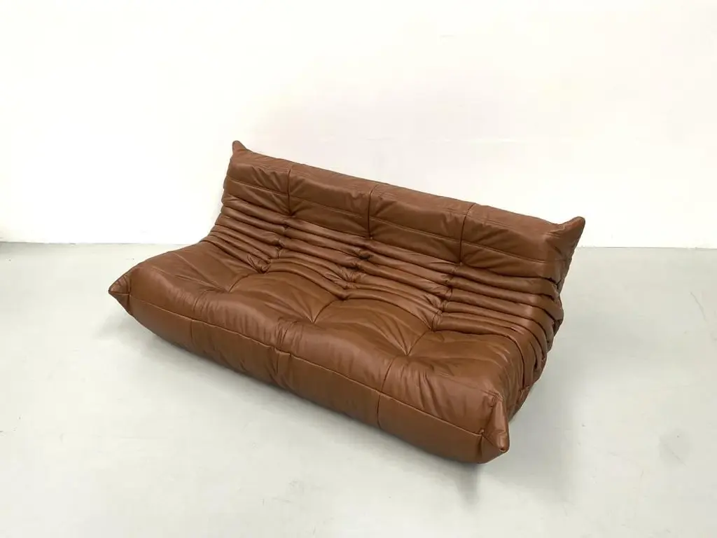 French Togo Sofa In Dark Cognac Leather Attributed To Michel Ducaroy For Ligne Roset