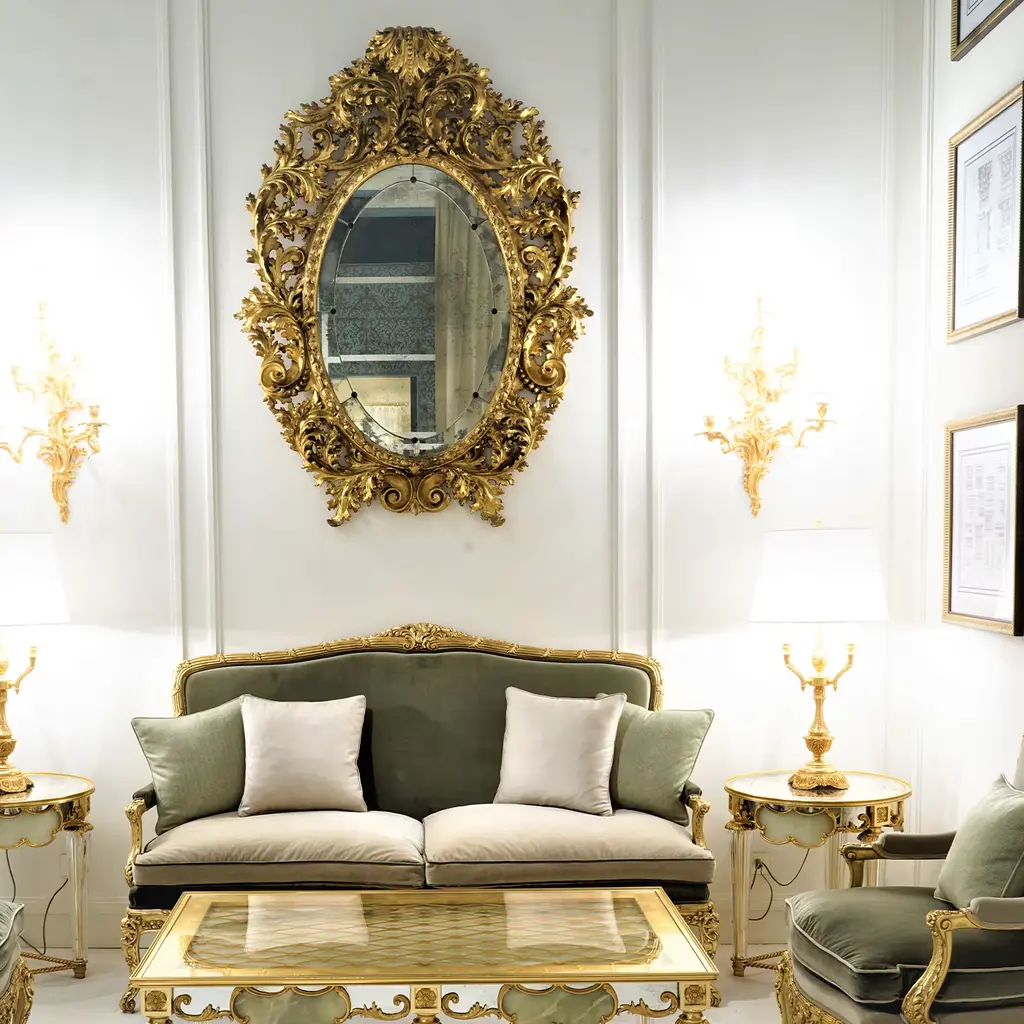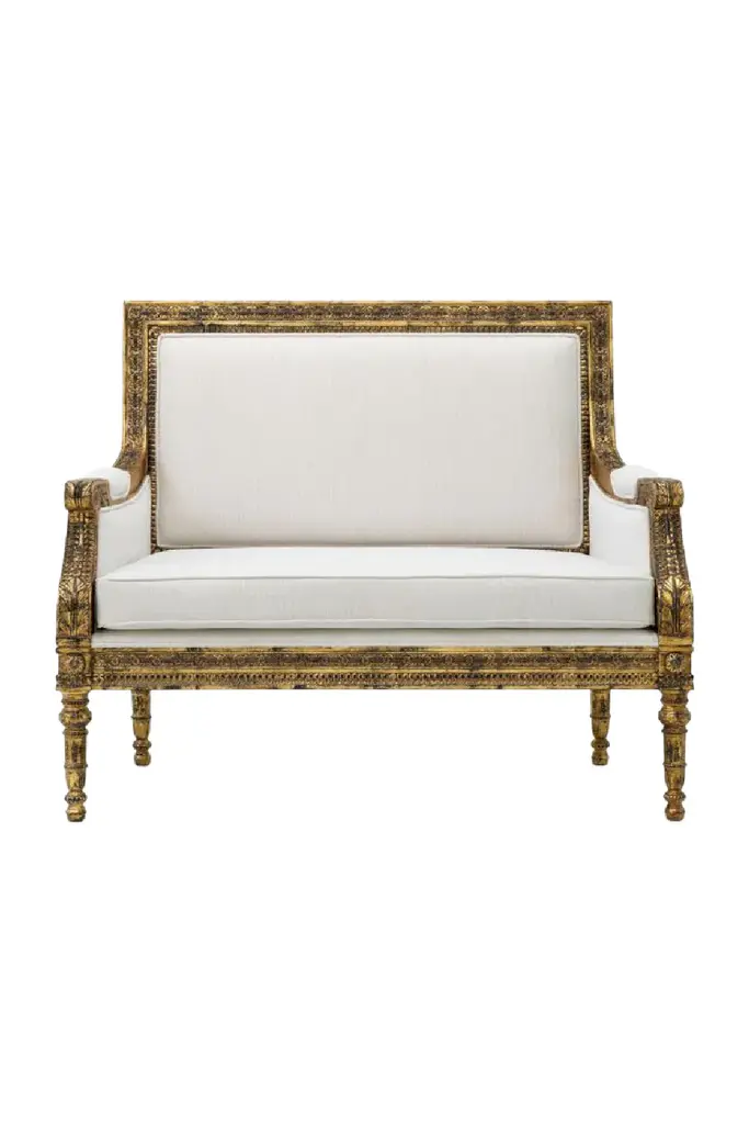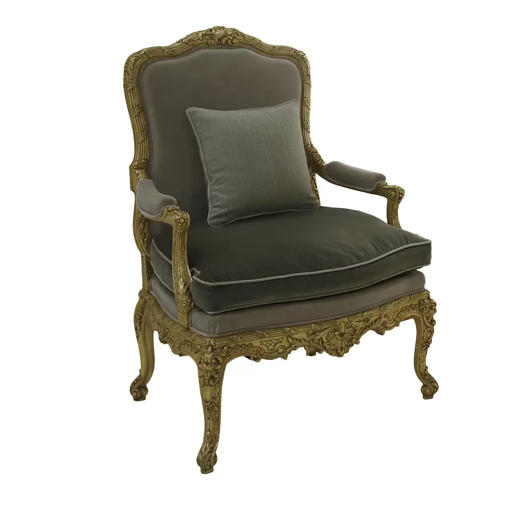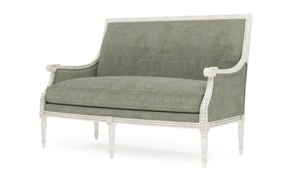 A marvelous showcase of cabinetmaking artistry in impeccable French Transition style, this sofa will complement plush classic interiors, from private to hospitality contexts. Superb floral motifs are deftly hand-carved from a solid beech frame splendidly accented with satin gold leaf. Richly padded and upholstered in fine, shaved, green-hued velvet - also with soft inserts along the recessed armrests - it comes with fluffy seat cushions. Cabriole legs complete the structure.