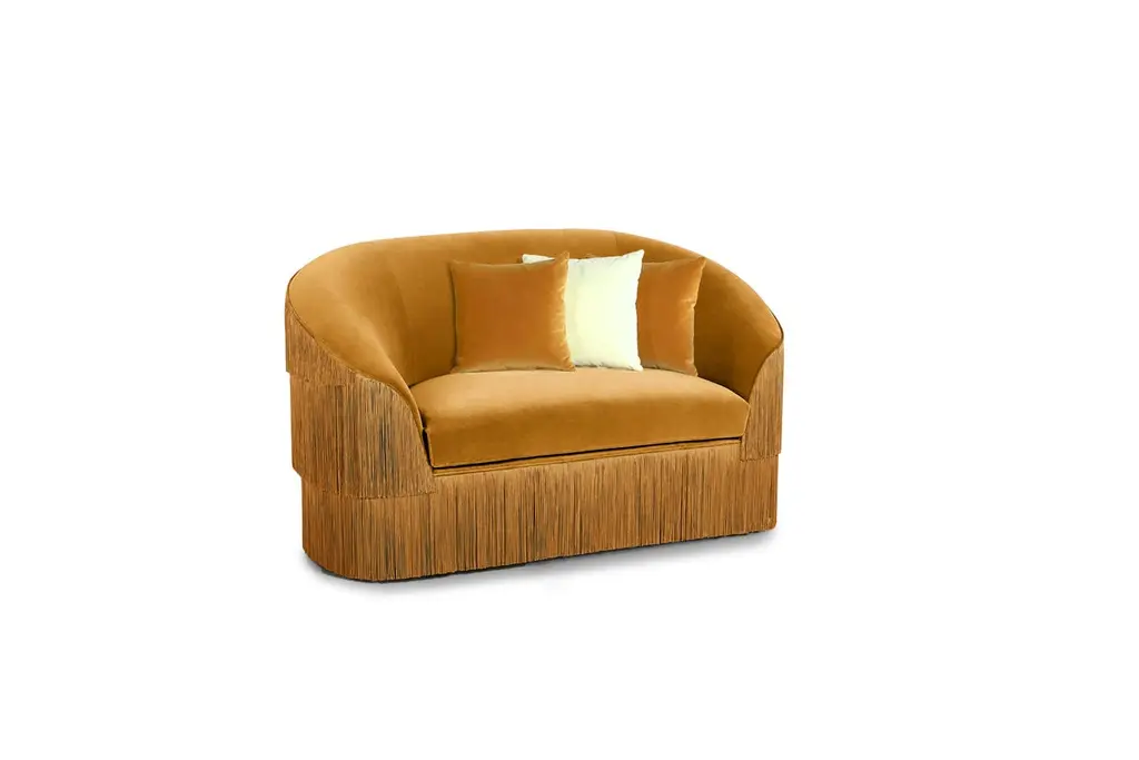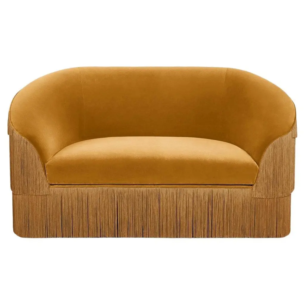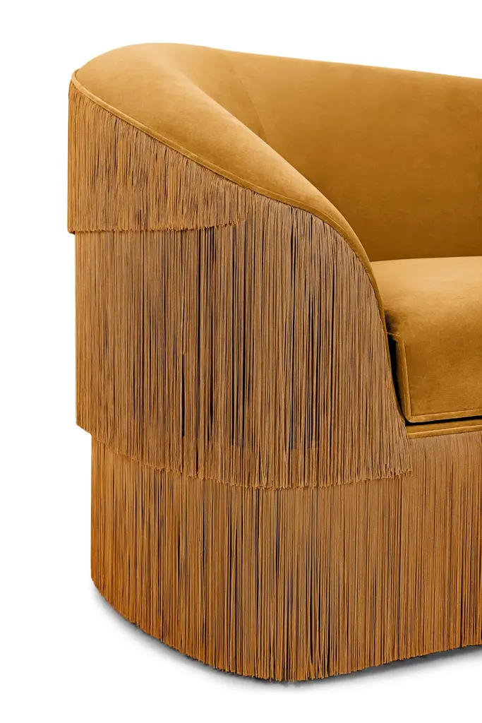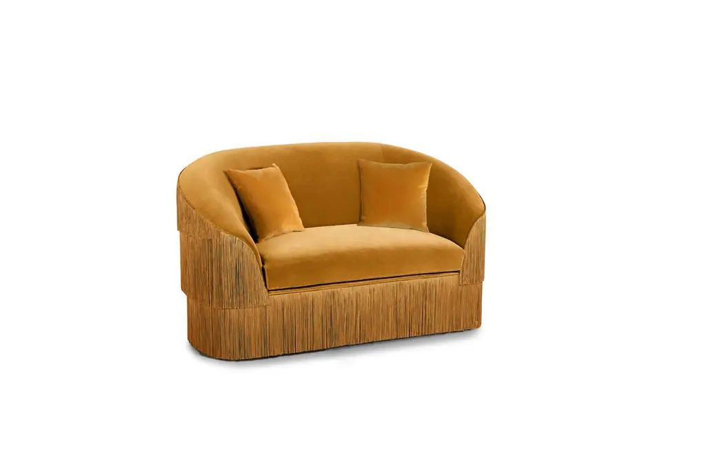 Fringes 2 Seat Sofa by MunnaDimensions: D 100 x W 165 x H 91 cm. SH: 47 cm.Materials: Wood, foam, and upholstery.Finish: Cotton Velvet upholstery and fringes.Available in all Munna fabrics except Wild silk, Leather, and Classic Leather.Available in client’s own material. Available in all Munna fringes. Not available in the client’s material. Handmade in Porto. Please contact us.Established in Porto in 2008, Munna is a furniture design brand renowned for creating handmade upholstery with unmatched craftsmanship, seamlessly blending noble materials and timeless design, for both commercial and residential projects.Made by hand in Porto, Munna’s pieces honor the profound heritage of craftsmanship, while drawing inspiration from history’s most influential artistic periods. Munna’s pieces are made of the finest fabrics such as cotton velvet, twill, leather, and silk; the finest wood veneers, such as ebony, walnut, and rosewood; sumptuous gold, silver, and copper leaves, metal details in brass, nickel, and copper, and superior lacquers.