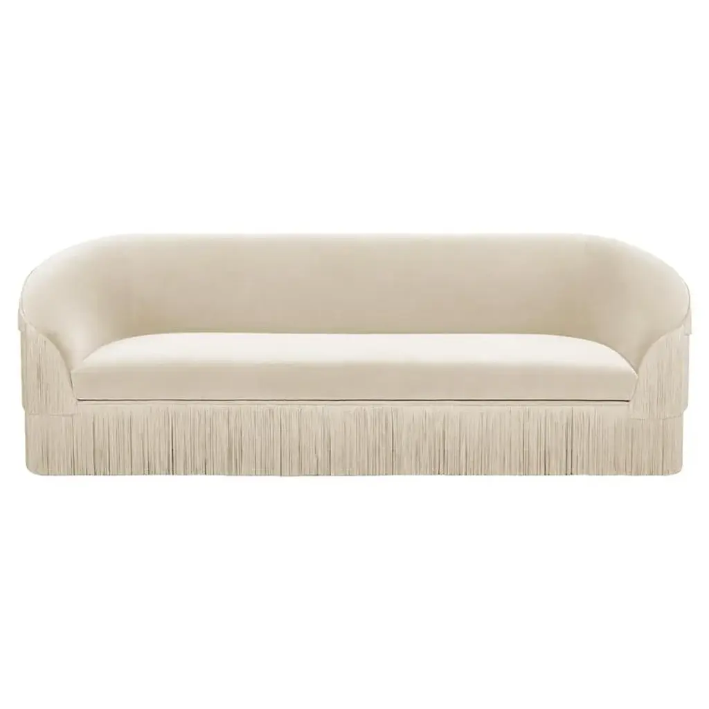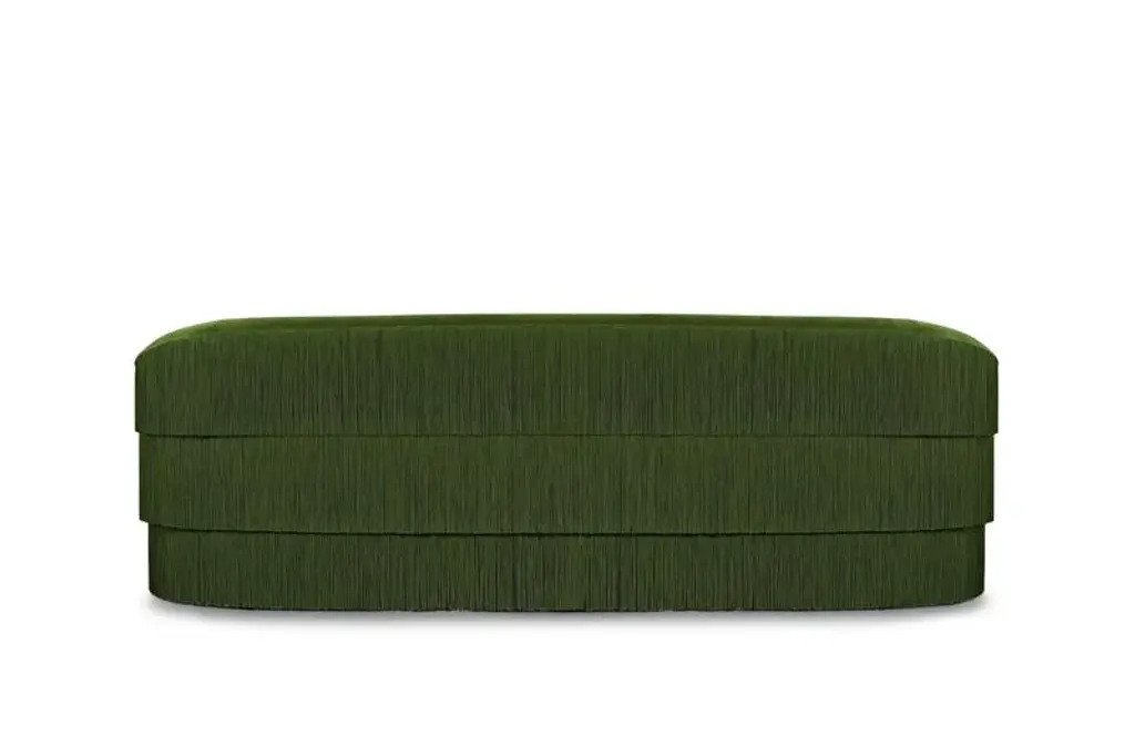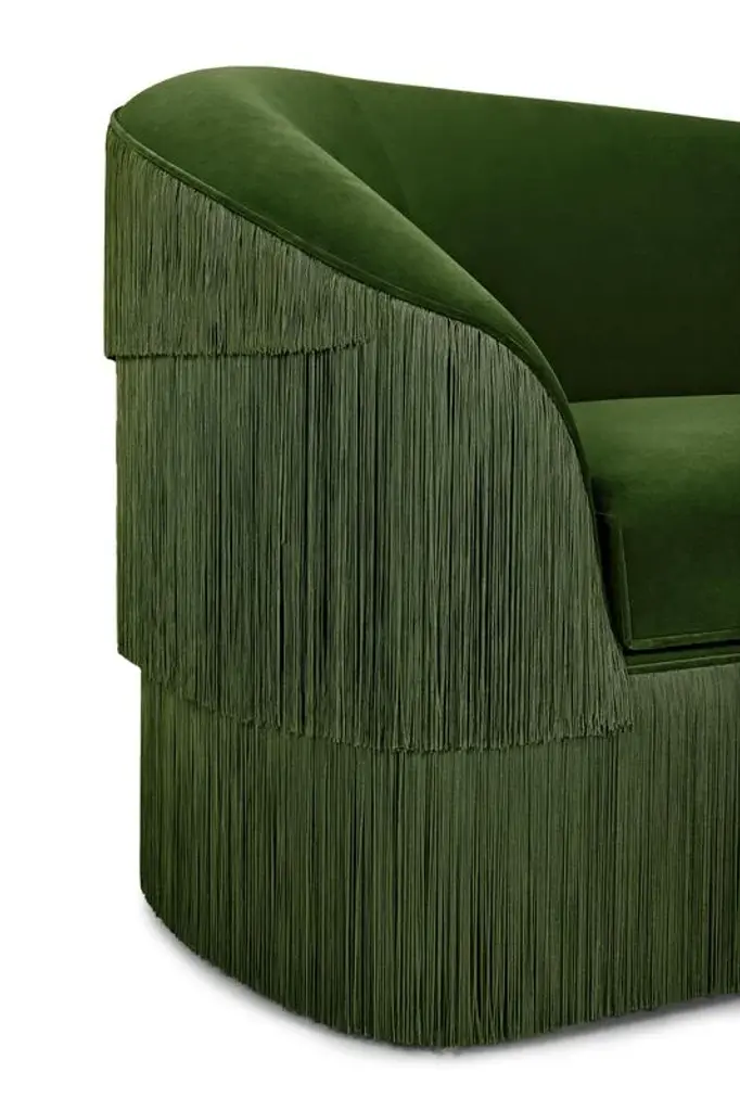 Fringes 280 sofa by munna dimensions: d 100 x w 280 x h 91 cm. Sh: 47 cm. Materials: wood, foam, and upholstery. Finish: cotton velvet upholstery and fringes.