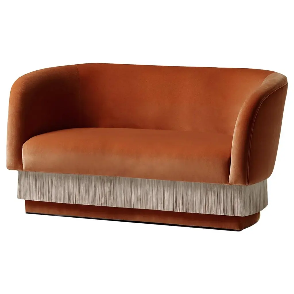 Fringes 280 sofa by munna dimensions: d 100 x w 280 x h 91 cm. Sh: 47 cm. Materials: wood, foam, and upholstery. Finish: cotton velvet, ref. Antique pink, cv28 upholstery, and antique pink fringes.