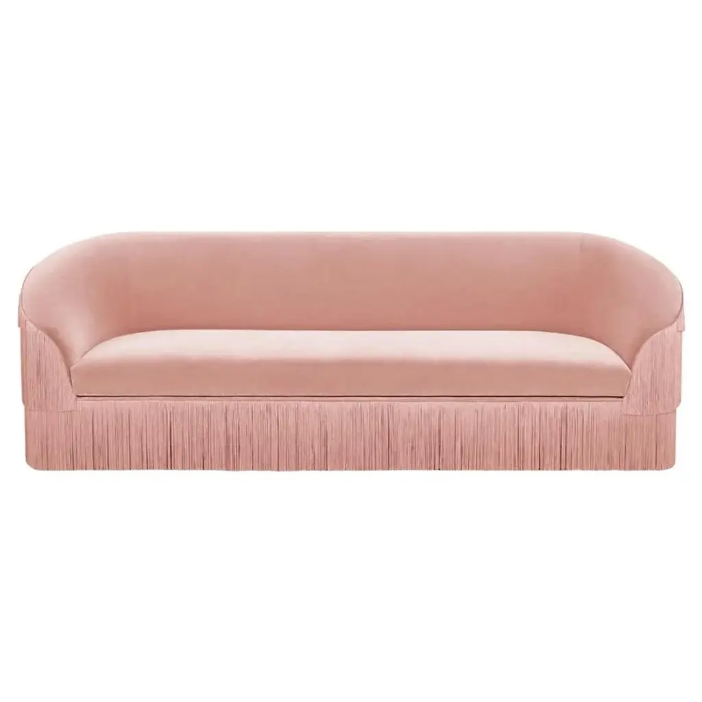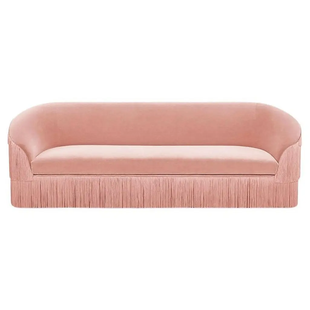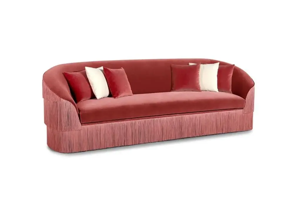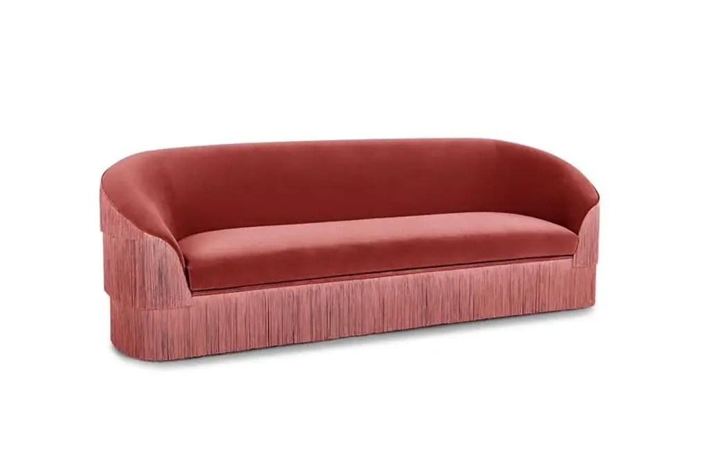 Fringes 280 sofa by munna dimensions: d 100 x w 280 x h 91 cm. Sh: 47 cm. Materials: wood, foam, and upholstery. Finish: cotton velvet upholstery and fringes.