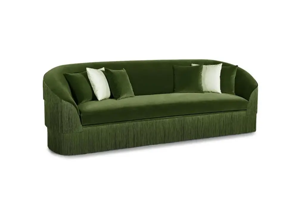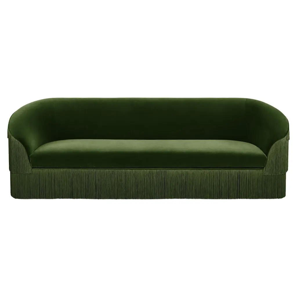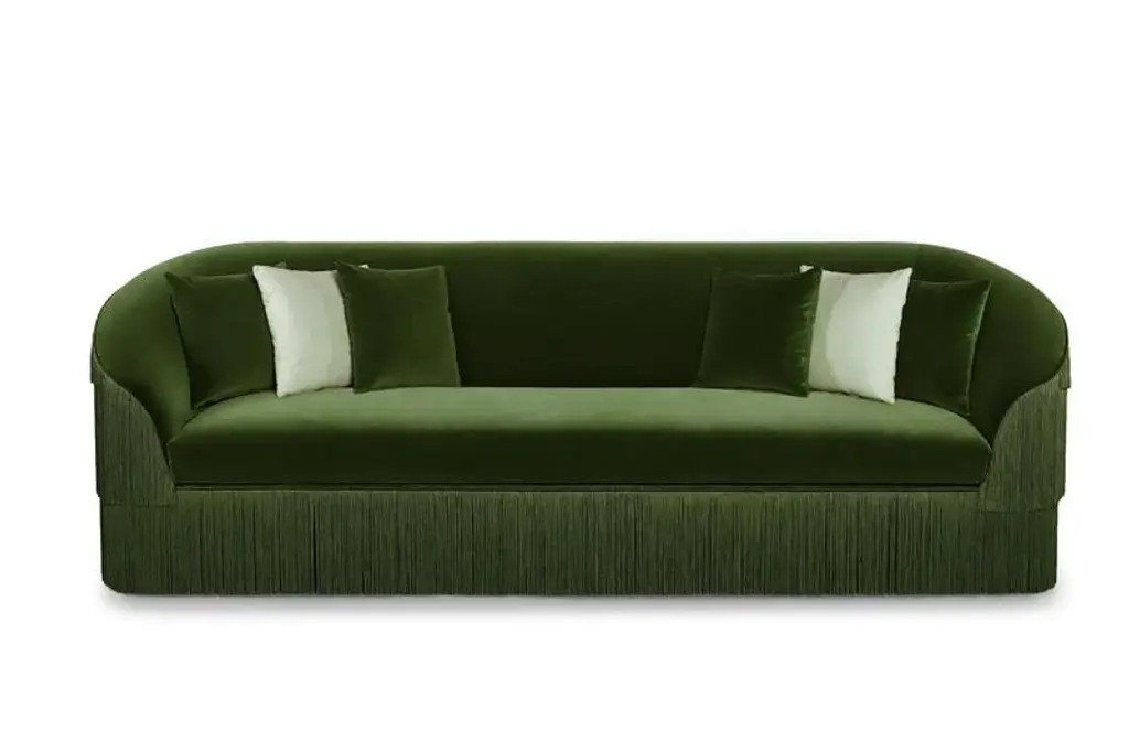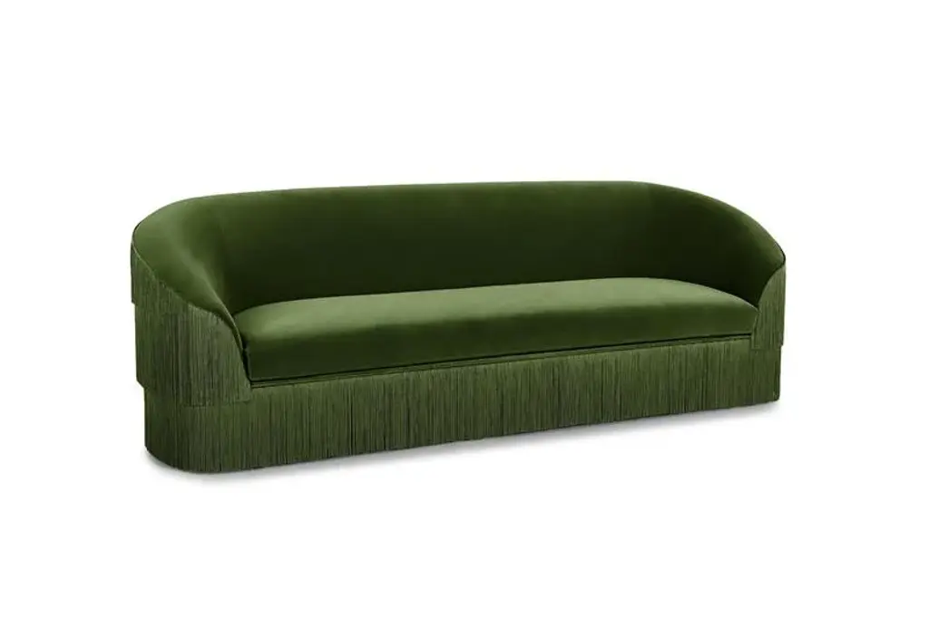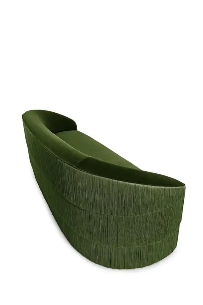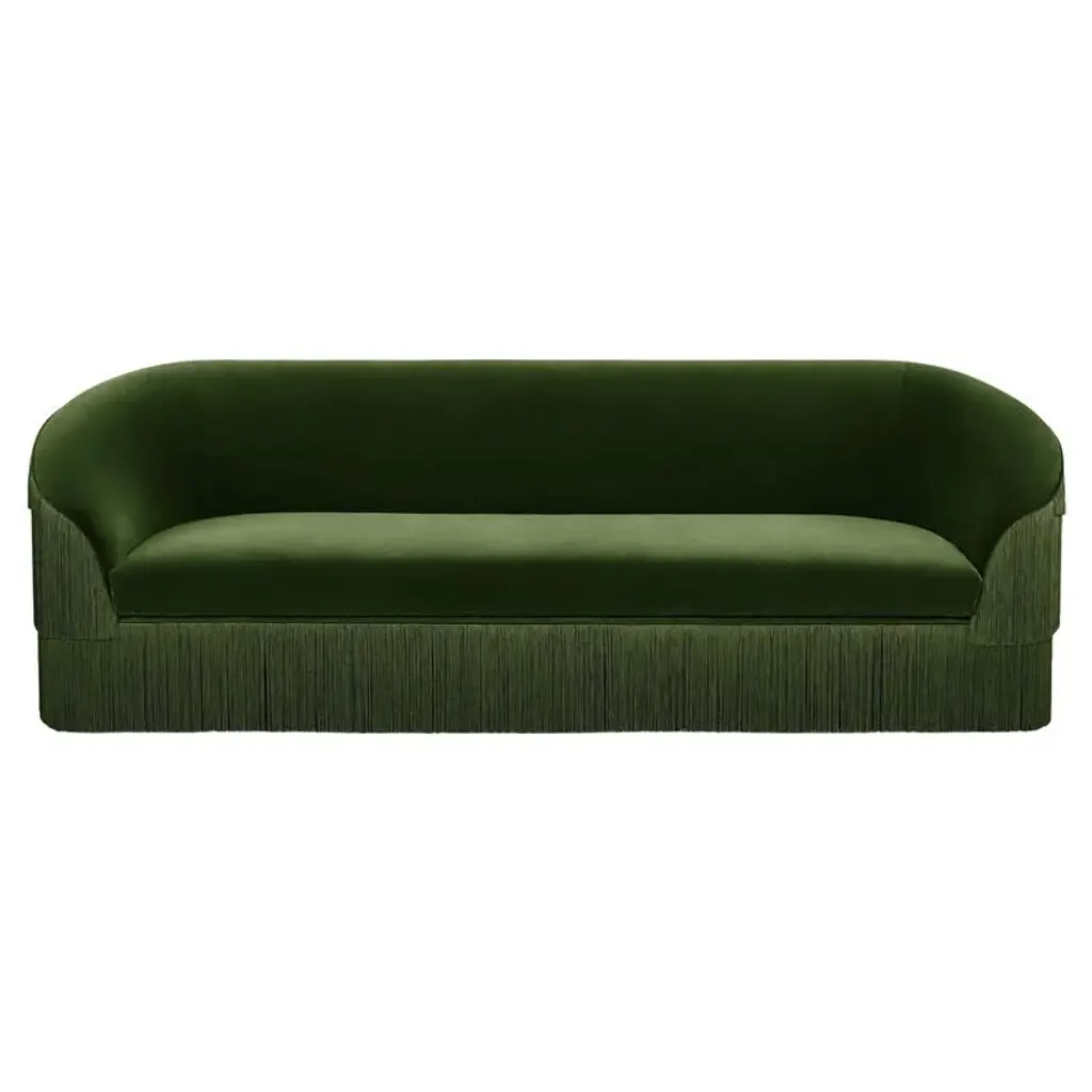 Fringes 280 sofa by munna dimensions: d 100 x w 280 x h 91 cm. Sh: 47 cm. Materials: wood, foam, and upholstery. Finish: cotton velvet upholstery and fringes.