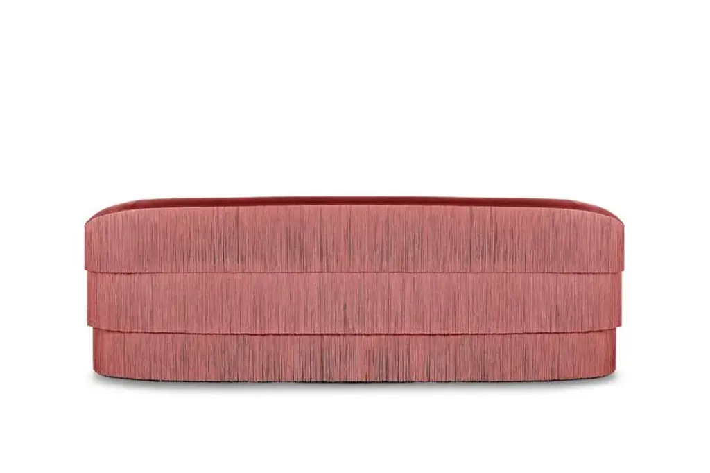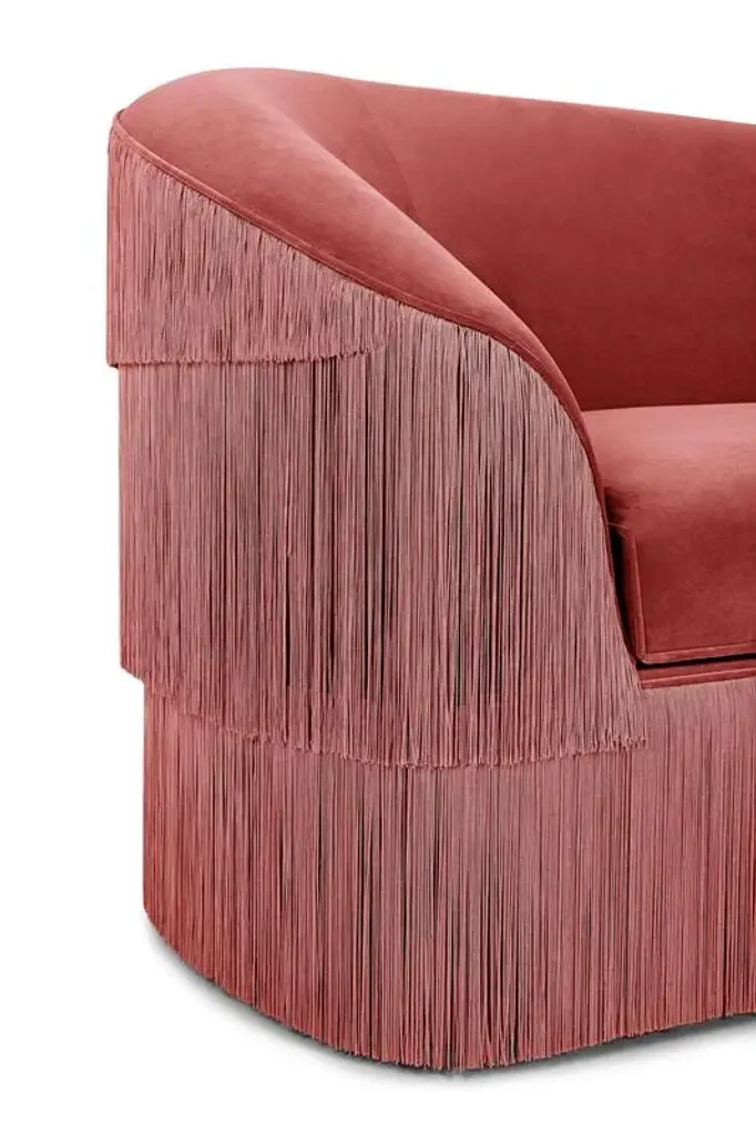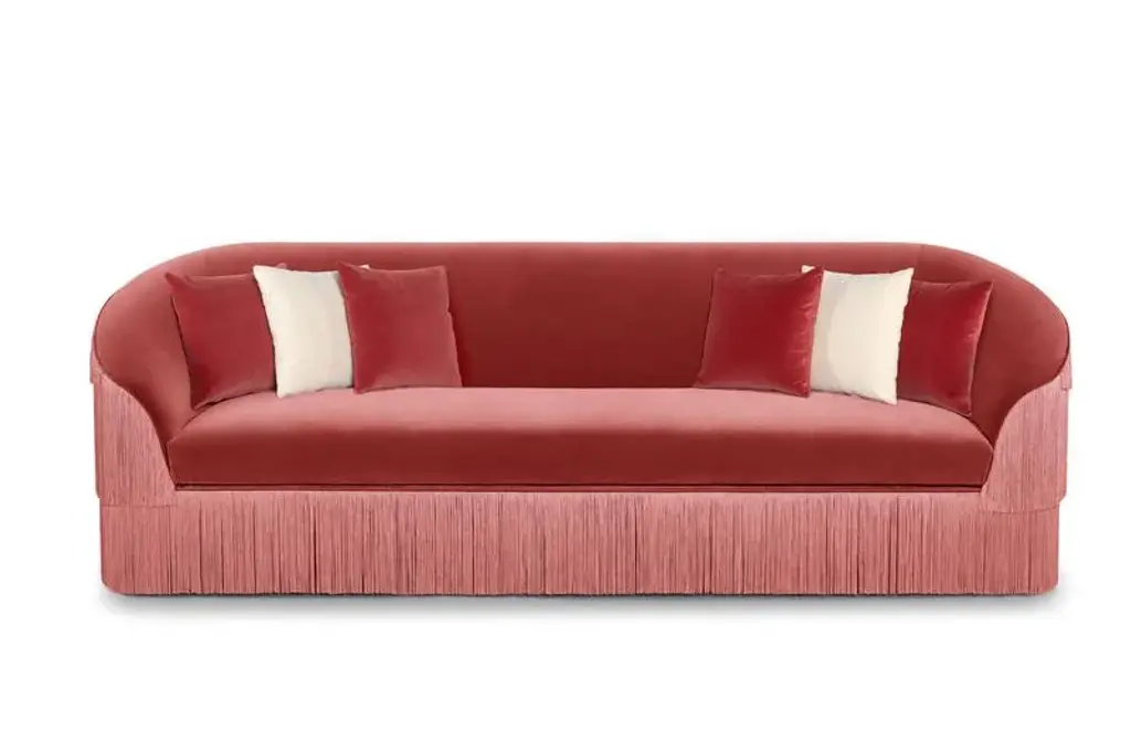 Fringes 280 sofa by munna dimensions: d 100 x w 280 x h 91 cm. Sh: 47 cm. Materials: wood, foam, and upholstery. Finish: cotton velvet upholstery and fringes.