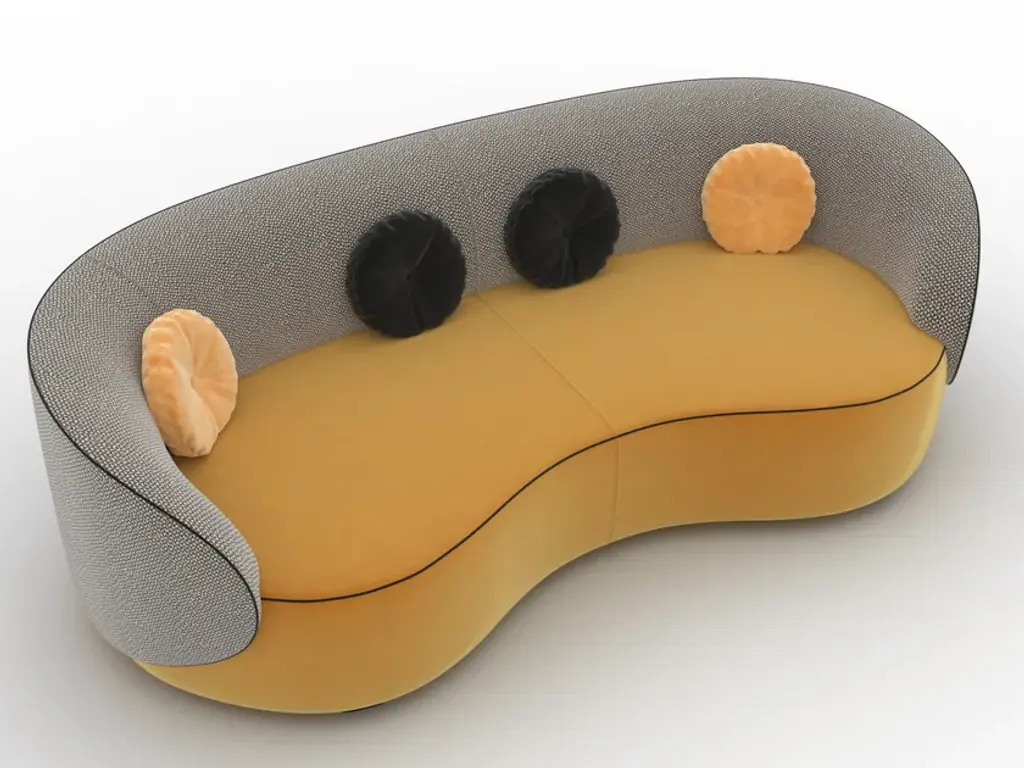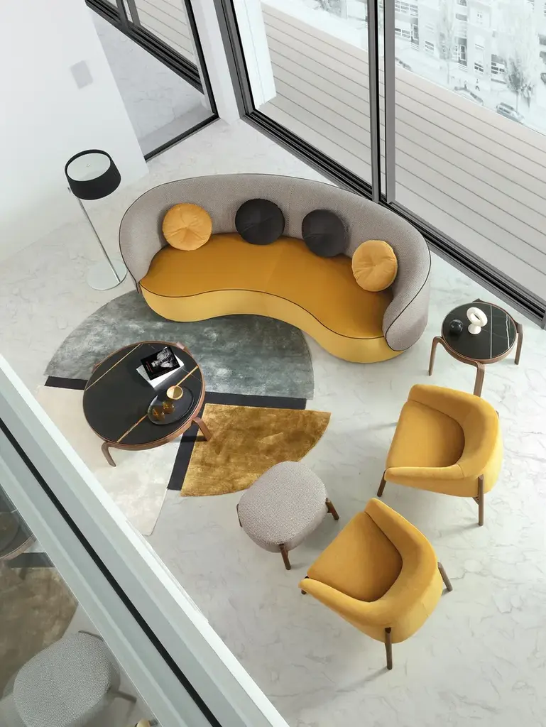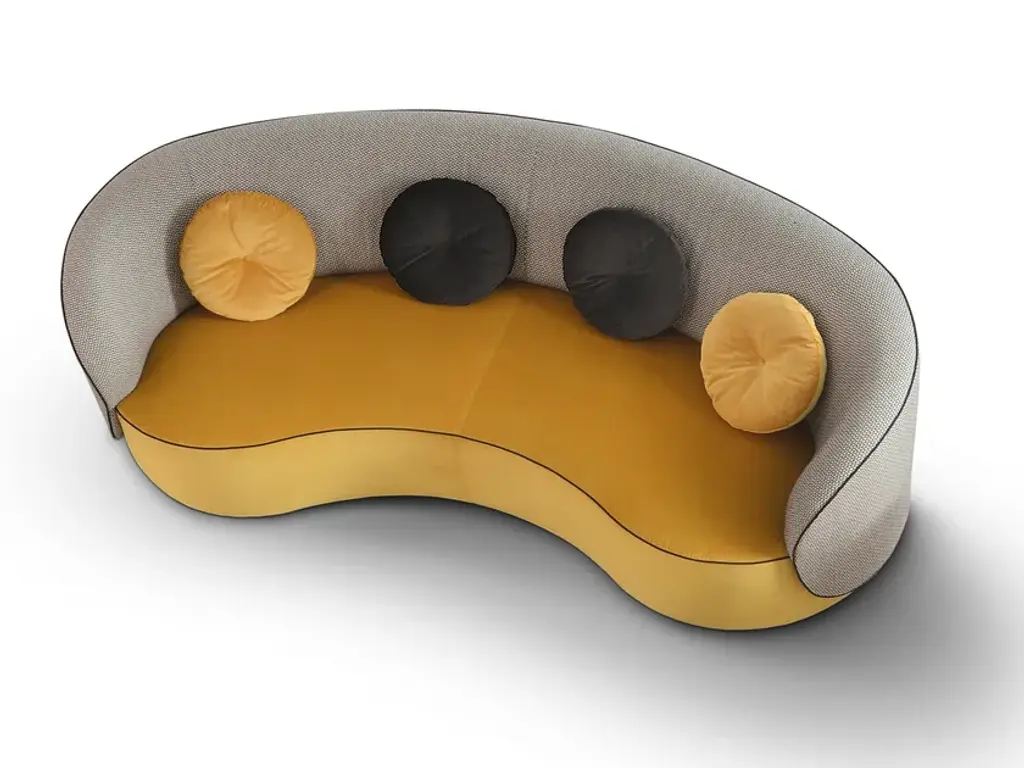 Fusion arises from the finest workmanship, a sofa with slightly curved line. AFrame: solid wood and curved multi-ply, elastic webbing suspension. Padding: seat and backrest in T40 and T25 differentiated density polyurethane foam covered with 150gr/m2 resin coupled with velveteen. Cover: leather, Nubuck or fabric. The sofa comes in two versions, with base or with feet. The base and feet are made of stained or lacquered beech wood in the available colours.