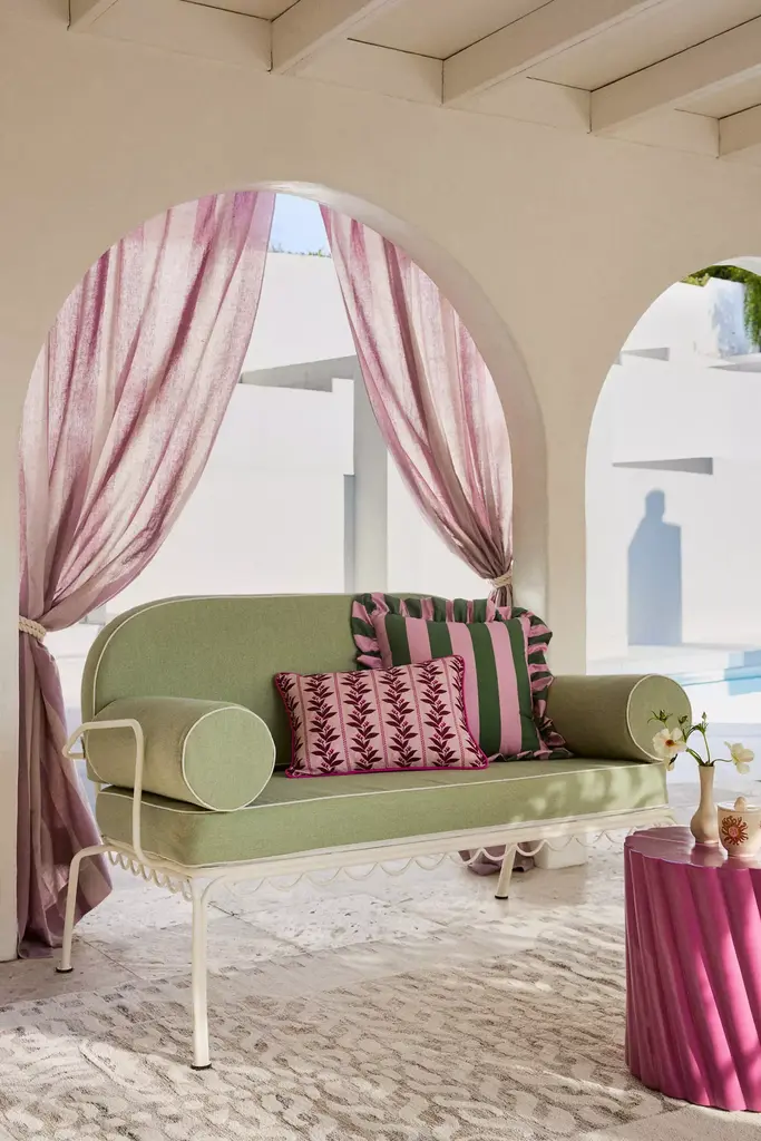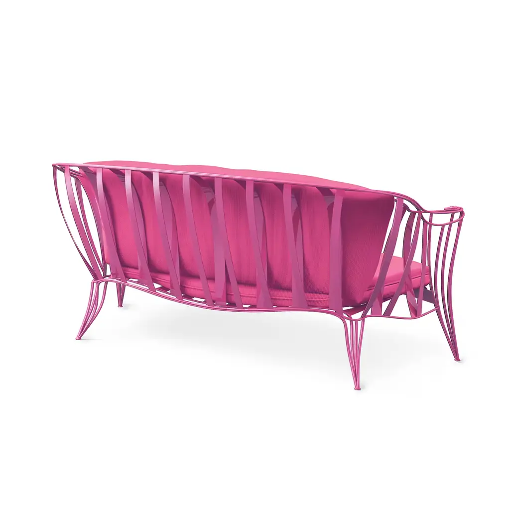 Romantic and airy, this garden sofa by Carlo Rampazzi will add a glamorous accent to any outdoor space. Its enveloping iron frame is bent by hand and enriched with a special rust-resistant treatment allowing the vivid fuchsia lacquer to preserve its beauty untouched. Supplied with cushions, the color of its lacquer can be customized by contacting the Concierge.