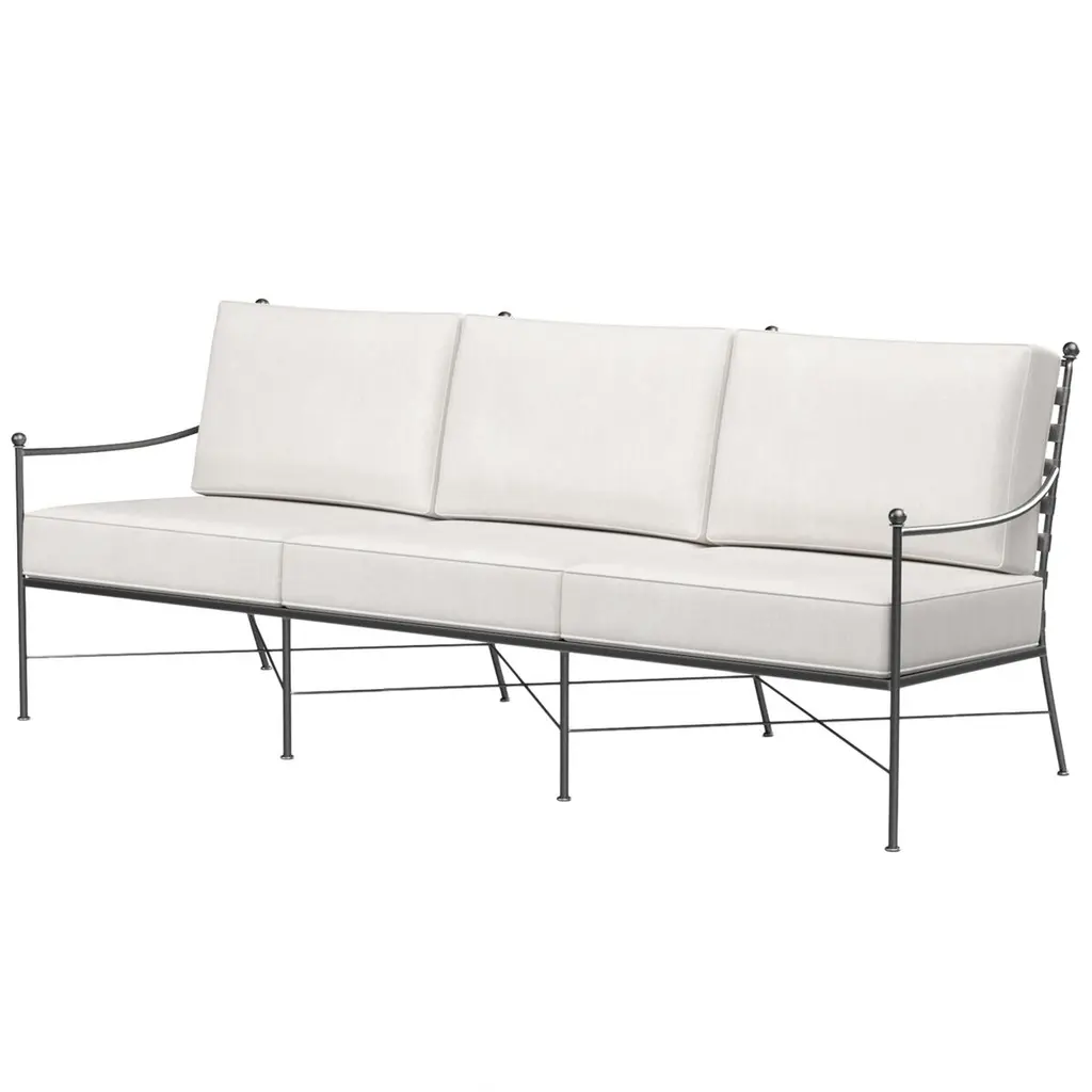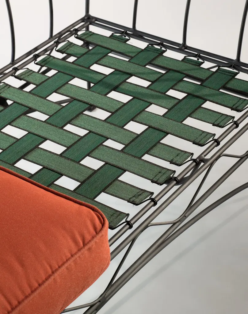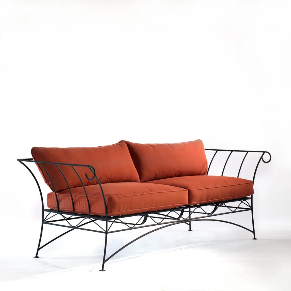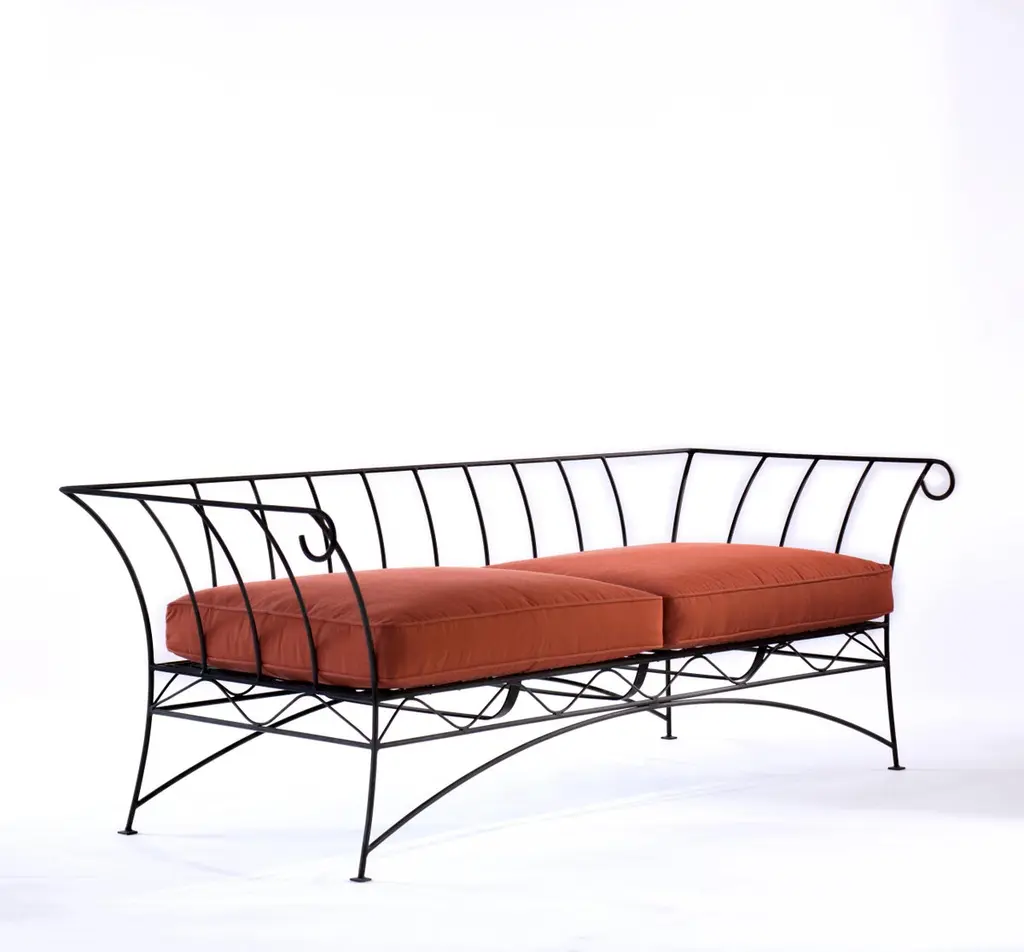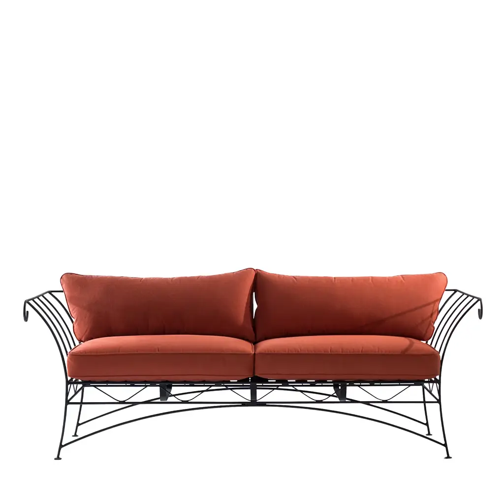 An ebonized steel frame garden sofa with water resistant cushions.B.B - The decorative light framework holds an elasticated webbed base giving the cushions a comfortable springiness. This sofa sits well in the garden or on a terrace and also works well in pairs as an external sitting area. I love the contours, which look great viewed from any angle.