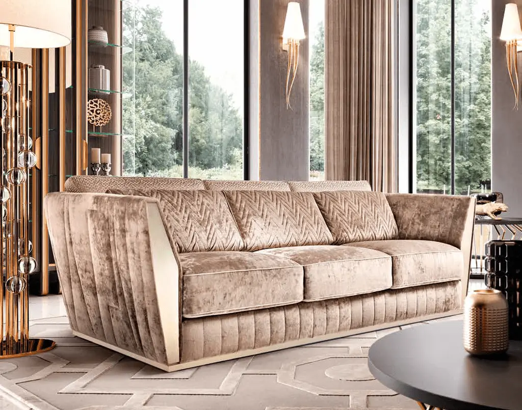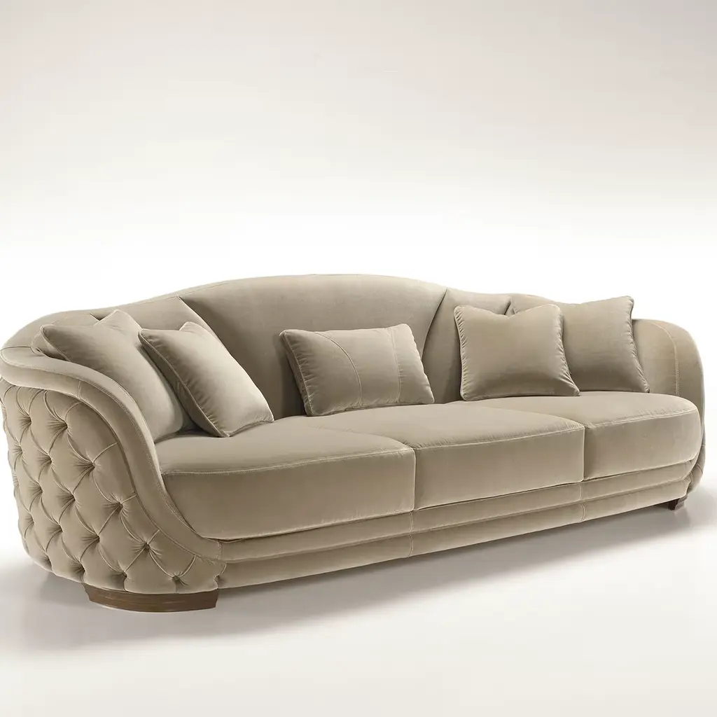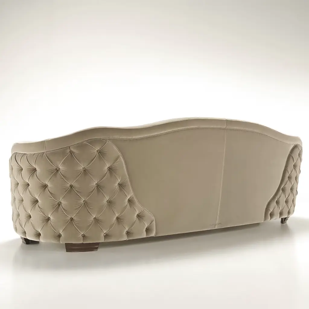 Generous volumes padded with polyurethane and outlined by harmonious curves define this sofa's distinctive elegance. Fine velvet in a delicate beige hue entirely covers the piece, for a perfectly smooth feel only interrupted by tufted detailing on the sides and back that state its precious sartorial quality.