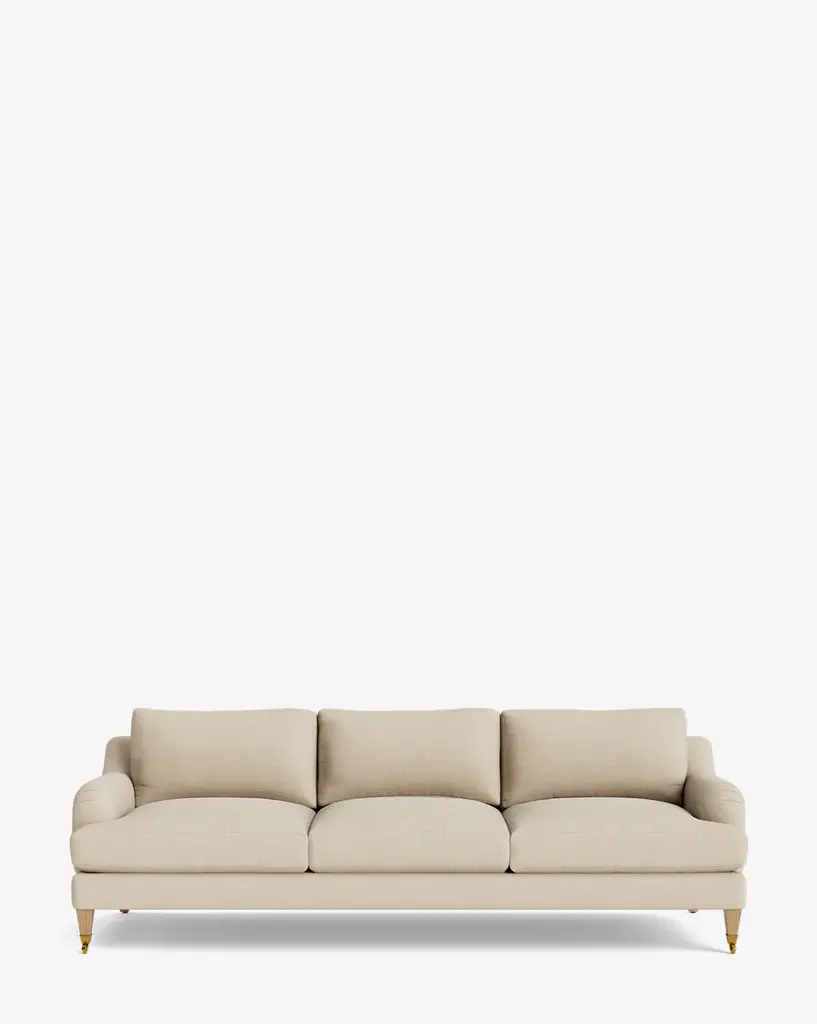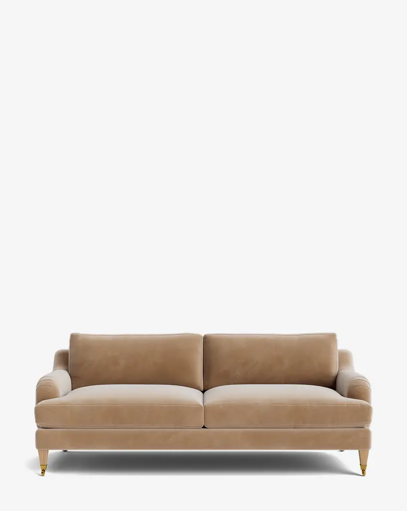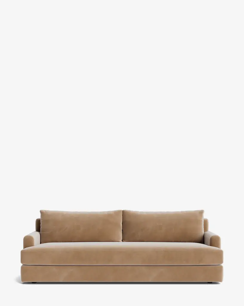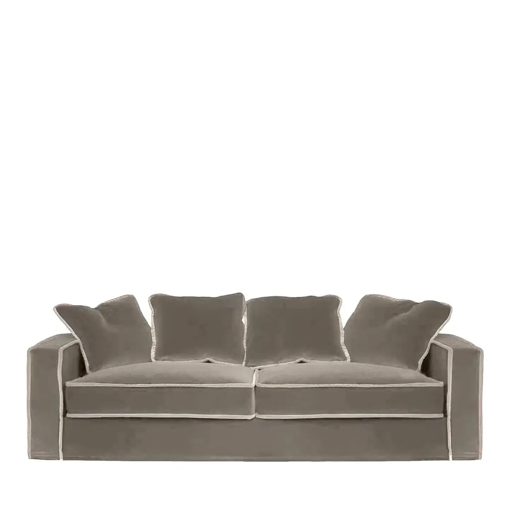 Generous volumes padded with polyurethane and outlined by harmonious curves define this sofa's distinctive elegance. Fine velvet in a delicate beige hue entirely covers the piece, for a perfectly smooth feel only interrupted by tufted detailing on the sides and back that state its precious sartorial quality.