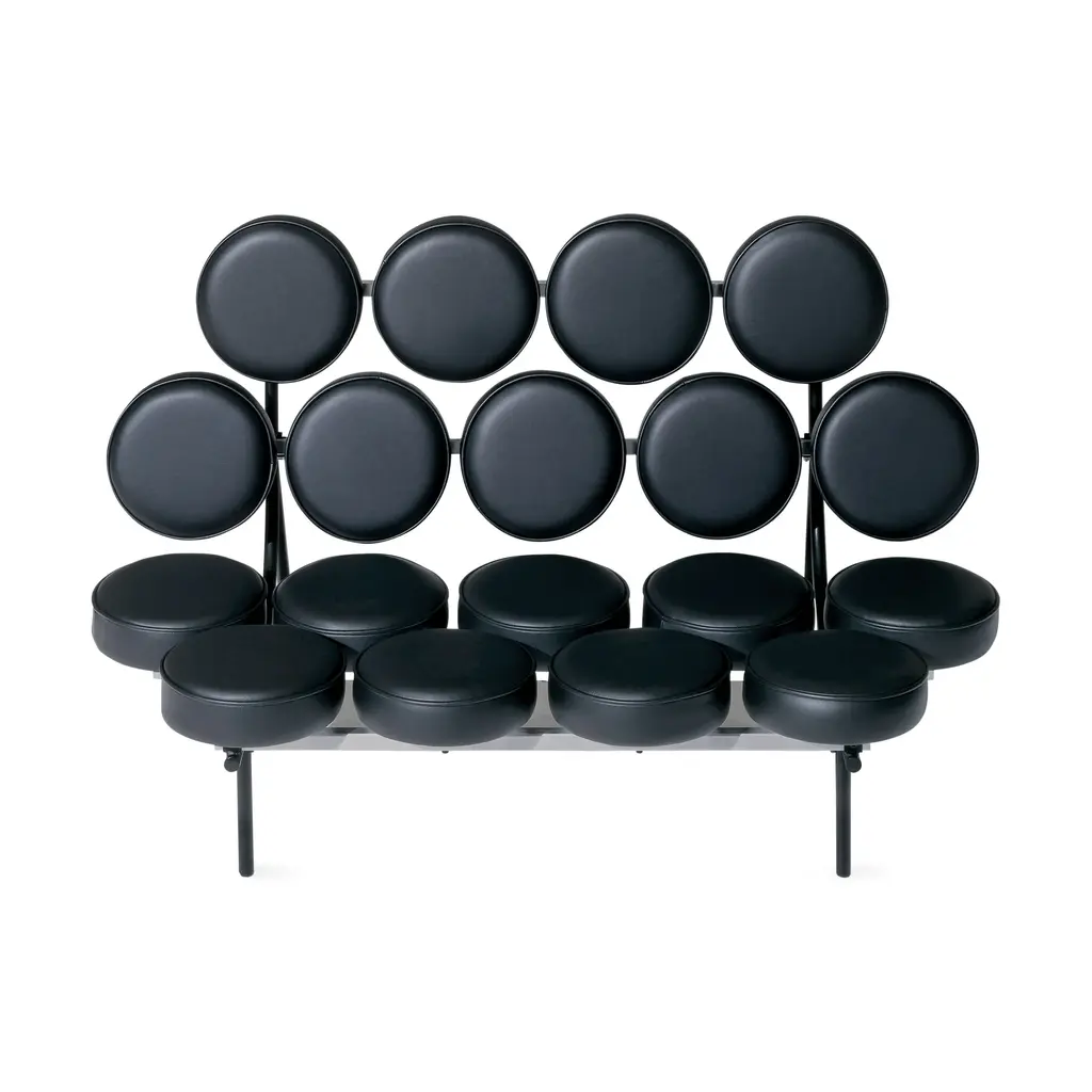The iconic Marshmallow Sofa was designed by Irving Harper for George Nelson after Nelson was approached by an inventor that had designed the couch's plastic discs. Harper took 18 of the discs and arranged them atop a steel frame to create this sofa's unique appearance. Made of a steel frame and legs with leather discs. Both George Nelson and the sofa's manufacturer, Herman Miller©, are represented in MoMA's collection.
