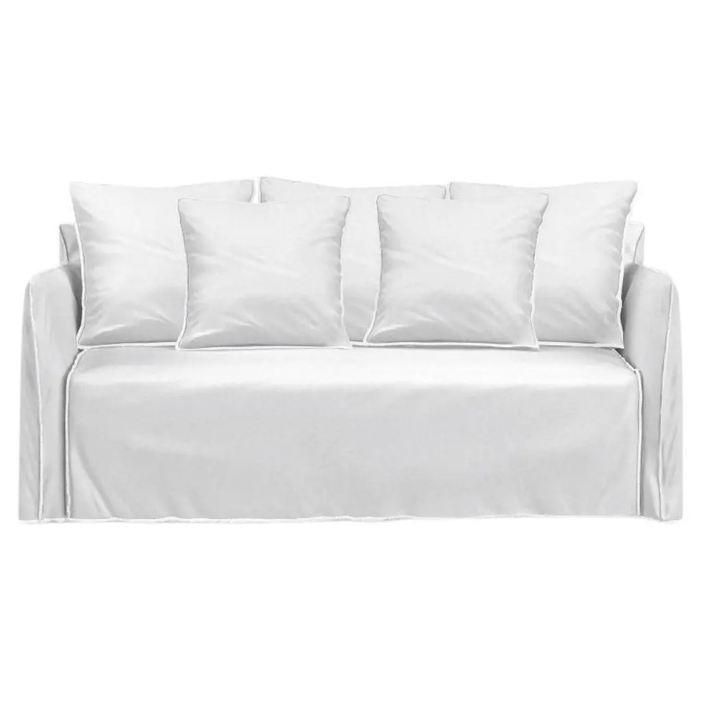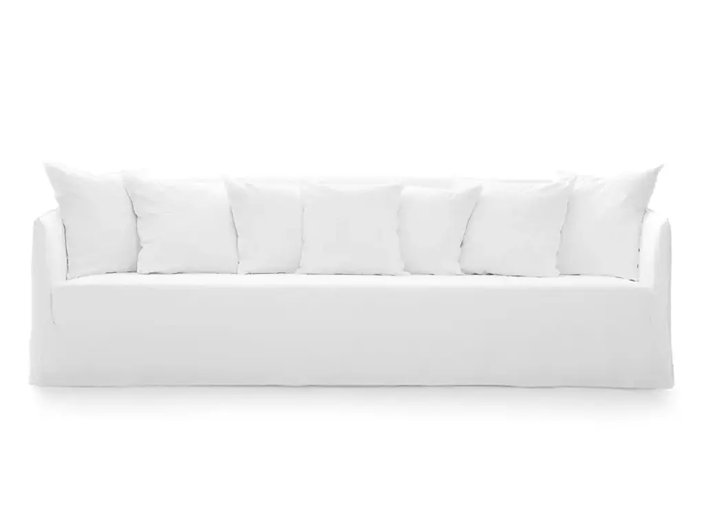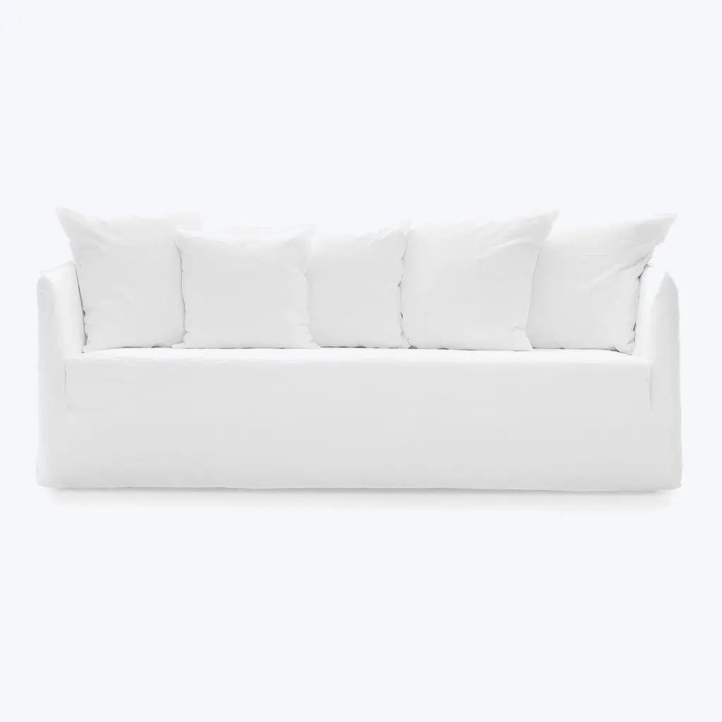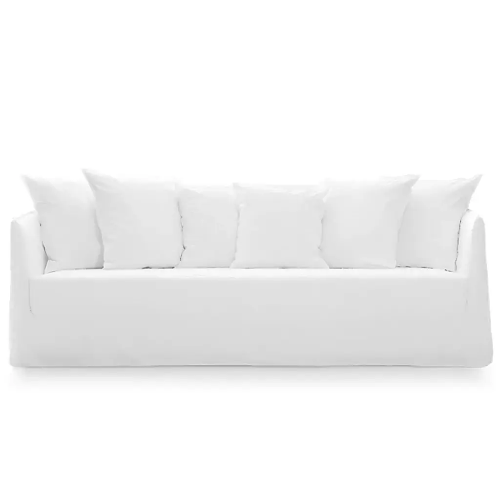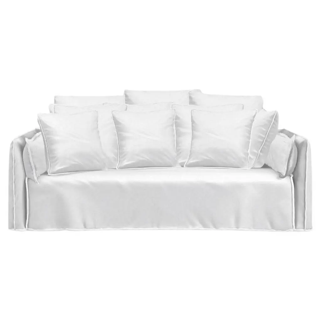 Family of padded sofas with removable upholstery, Ghost Out 10/12/16 boast a comfortable and enveloping seat that develops around a light body with essential volumes. Designed to resist water and sunlight and to maintain their shape and aesthetics over time, they are available in various sizes, two-seater or three-seater and with different seat depths. They are characterised by a geometric structure in which the softness is accentuated by loose cushions. The main feature is the upholstery: an oversized housse whose profile is underlined by the visible stitching, to let itself be undressed with ease and take on a different image each time.Upholstered sofa, removable covers.Additional Information:Material: UpholsteryUpholstery: Aspen 03 Cat. C (R1700)Dimension: 220 W x 85 D x 80 H cmSeat height: 42 cmArmrest height: 68 cmAvailable in other upholstery options: Cat. I, Cat. H, Cat. B, Cat. D, Cat. EAvailable in other structural optionQuick ship: Ghost Out 10 / 12 with removable cover in aspen 03. Available with shipping the week after the order receipt, upon confirmation of availability.
