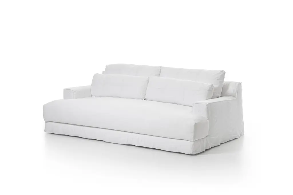 A proposal that tells a story of contemporary comfort, made special by the attention to detail, the quality of the materials and the uniqueness of the craftsmanship, such as the profile of the sofas underlined by the characteristic sew/cut seam which, like a light line drawn by hand, follows the essential geometries and soft lines of the collection. The solid wood structure with polyurethane foam shell is combined with large seat and back cushions made with a soft layer of channelled goose down, recovering the traditional technique of using pocket springs in the seat cushions for enhanced comfort. In all its versions, the covers of the LOLL collection are completely and easily removable. Sofa upholstered with polyurethane foams, seat and back cushions in dacron and down, removable covers. Two lumbar cushions in dacron and down 100 x 40 cm.Additional Information:Material: Upholstery, foamUpholstery: White Linen Cat. CDimension: 238 W x 140 D x 72 H cmSeat height: 45 cmArmrest height: 59 cmAvailable in other upholstery options: Cat. I, Cat. H, Cat. B, Cat. D, Cat. EAvailable in other structural optionsQuick Ship: Loll 10 / 12 with removable cover in lino bianco. Available with shipping the week after the order receipt, upon confirmation of availability.