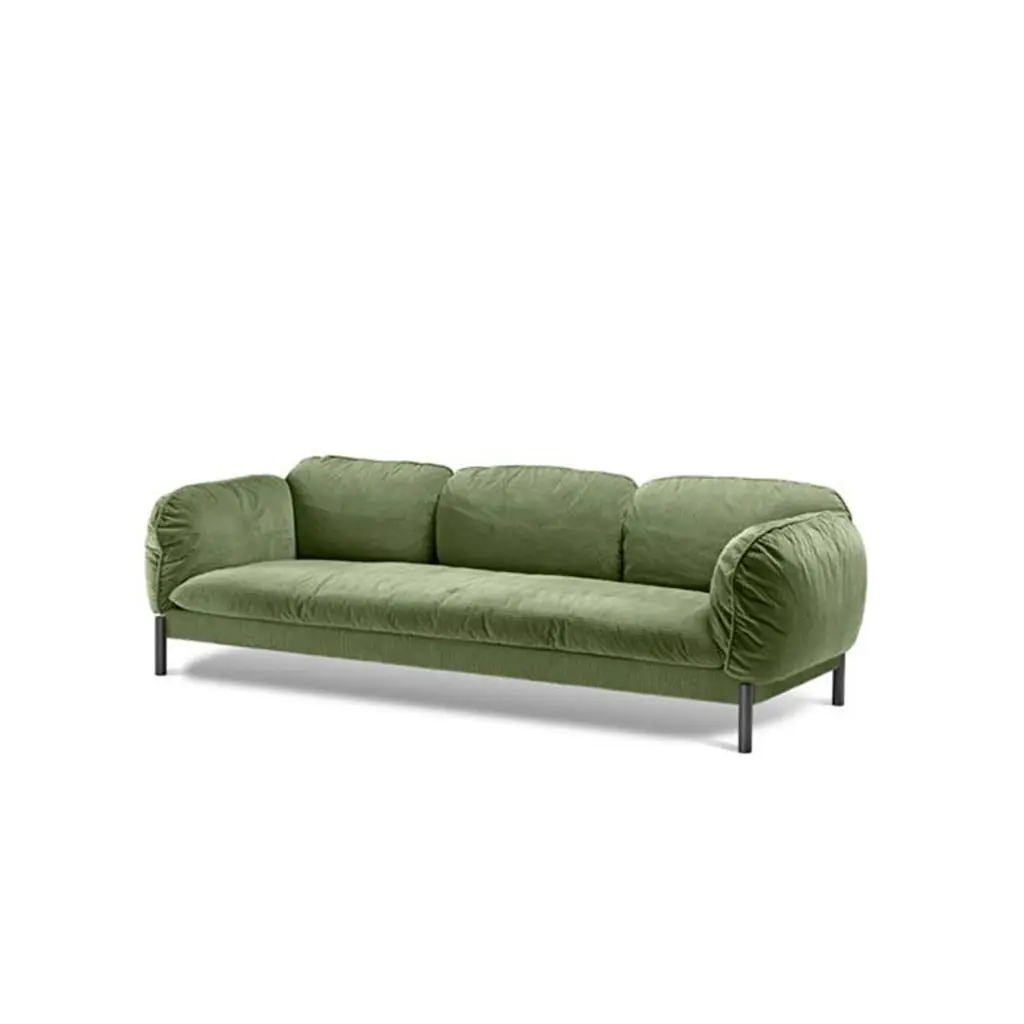 Soft and welcoming, this sofa is inspired by the 1970s, a decade that changed our culture forever through freedom and self-discovery. The sofa invites you to a world of fantasy where you can indulge in the comfort and coziness of your passions. Tarantino, as if following a skillful plot, lends itself to composing various original and alternative solutions integrated by the soft goose down cushions covered with textured cotton corduroy proposed in colors inspired by the 1970s.Materials: Black gold brass, fabricDimensions: W 270 x D 110 x H 79 cmAvailable in other upholstery options: Nappa leather, Nabuk leather, natural leather, velvetAvailable in 2-seat sofa versionAvailable in other finish options: Polished brass, satin brass, light burnished brass, brown burnished brass, dark burnished brass.