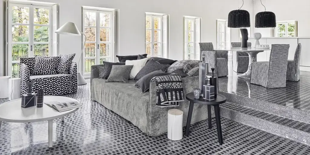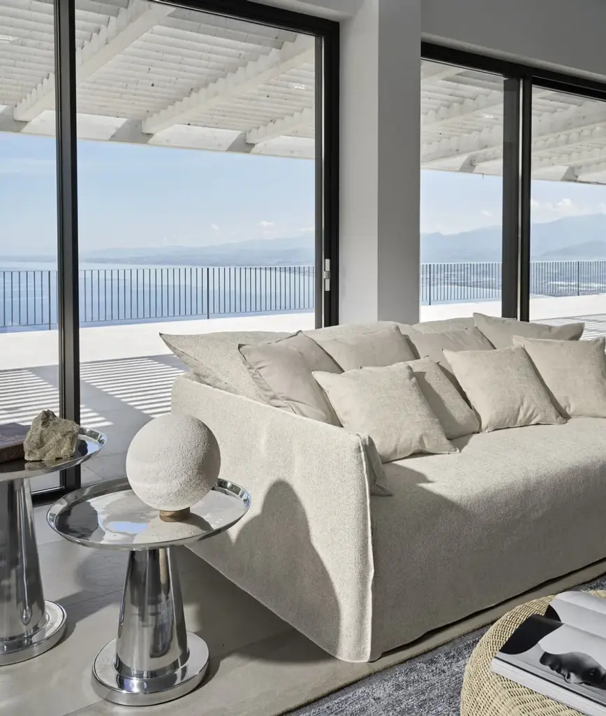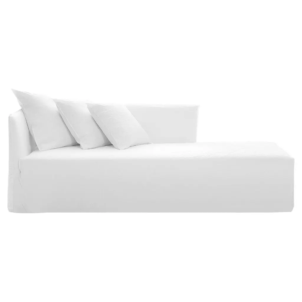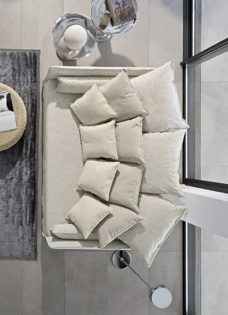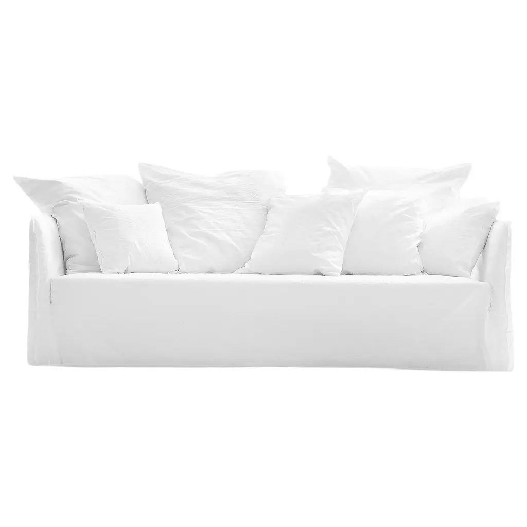 Ghost 16 is the sofa, upholstery with polyurethane foams, removable covers. Three back cushions 80 x 80cm, four 60 x 60 cm, four 50 x 50 cm; two arm cushions. Supplement for sewing in special colour. Supplement for fire retardant foams. Surcharge for fire retardant interliner.Ghost, a sofa created with a light body and essential volumes. Made from a thin, minimal structure padded with polyurethane foam, Ghost contains soft loose cushions in mixed down. The main feature of the Ghost sofas is the removable cover, an oversize housse whose shape is underlined by the visible stitching, allowing it to be put on and taken off in a flash. A textile product that easily changes appearance, allowing you to go from a formal to an informal look with ease and speed.Comfort and versatility are the keywords that define Ghost, a collection of seats that are as comfortable and enveloping as their upholstery. The name of the collection is inspired by the white version which, thanks to the soft falling fabric, brings to mind the common imagination of ghosts. The large collection Ghost seats is developed around a light body with essential volumes that contains soft cushions. The main feature is the upholstery: an oversized housse whose profile is underlined by the visible stitching. Sofas, armchairs, ottomans, chairs and beds are undressed and dressed in a flash, like a change of clothes, taking on a different image each time, simple or sophisticated, depending on the personality of those who choose and live them.