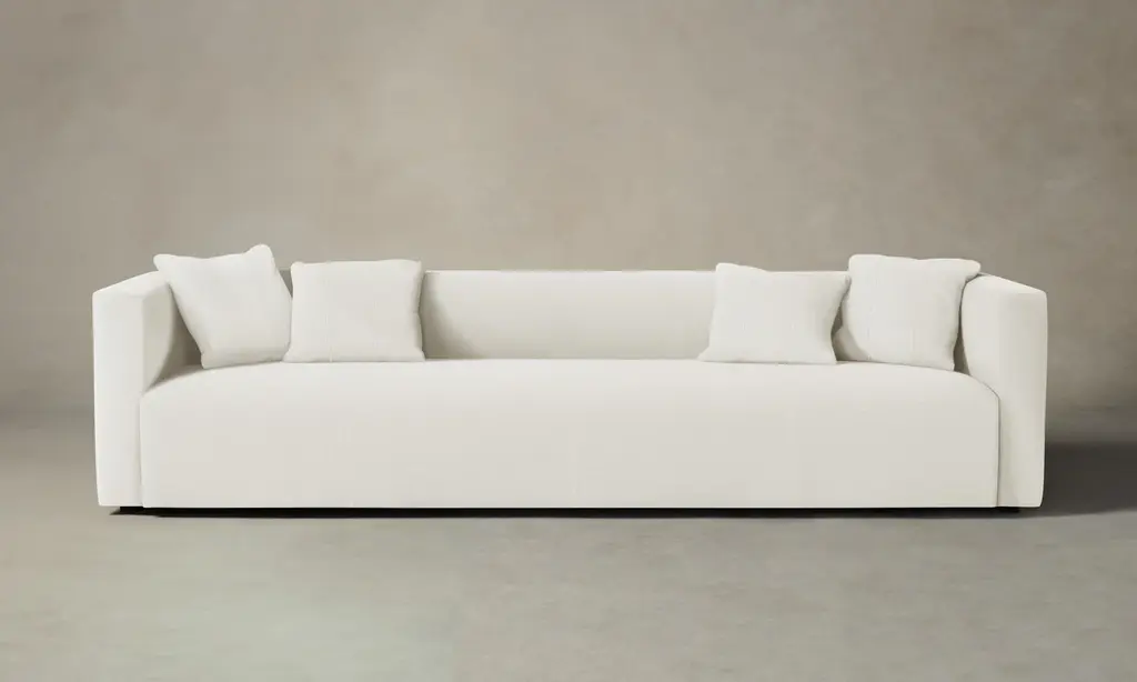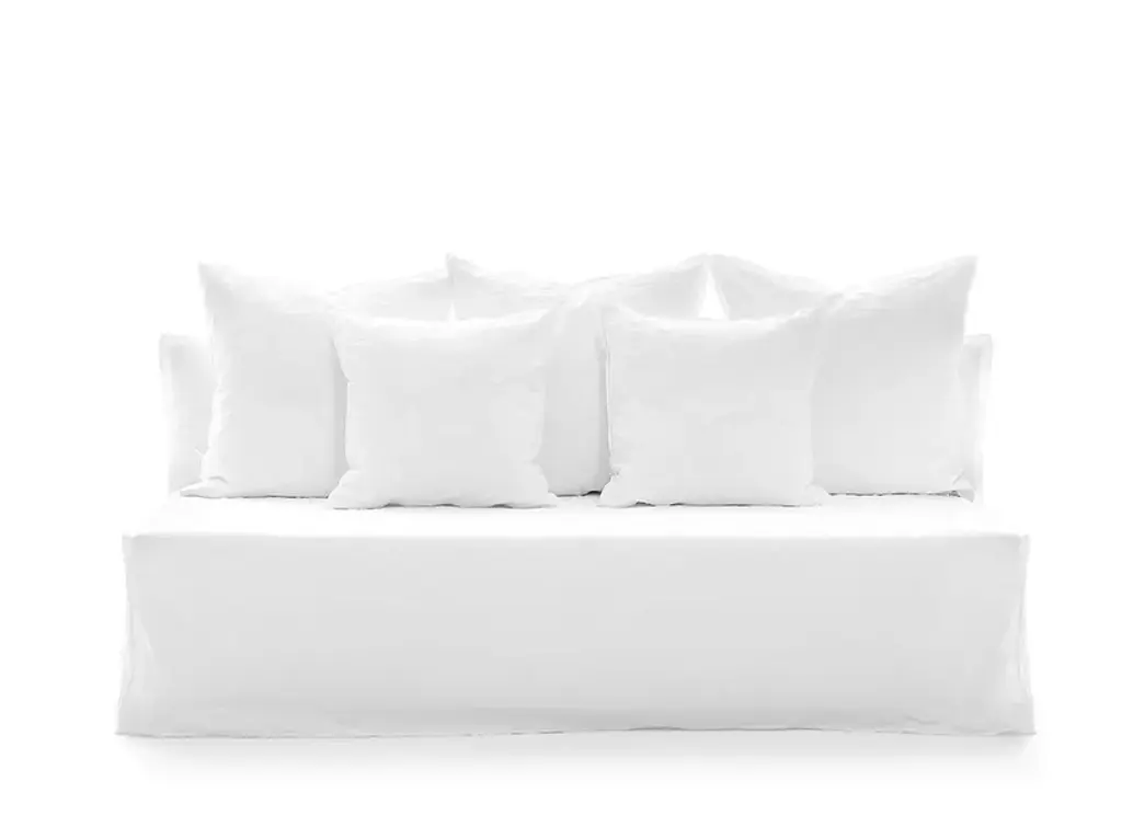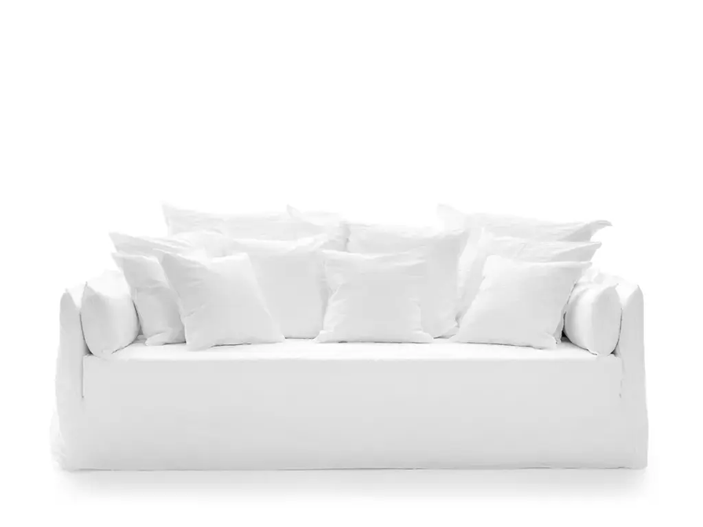 Ghost 32 L-R is a modular sofa, one left (L) or right (R) armrest, upholstered with polyurethane foams, removable covers. Four back cushions in dacron and down 60 x 60 cm and two 50 x 50 cm.Ghost, a sofa created with a light body and essential volumes. Made from a thin, minimal structure padded with polyurethane foam, Ghost contains soft loose cushions in mixed down. The main feature of the Ghost sofas is the removable cover, an oversize housse whose shape is underlined by the visible stitching, allowing it to be put on and taken off in a flash. A textile product that easily changes appearance, allowing you to go from a formal to an informal look with ease and speed.Comfort and versatility are the keywords that define Ghost, a collection of seats that are as comfortable and enveloping as their upholstery. The name of the collection is inspired by the white version which, thanks to the soft falling fabric, brings to mind the common imagination of ghosts. The large collection Ghost seats is developed around a light body with essential volumes that contains soft cushions. The main feature is the upholstery: an oversized housse whose profile is underlined by the visible stitching. Sofas, armchairs, ottomans, chairs and beds are undressed and dressed in a flash, like a change of clothes, taking on a different image each time, simple or sophisticated, depending on the personality of those who choose and live them.