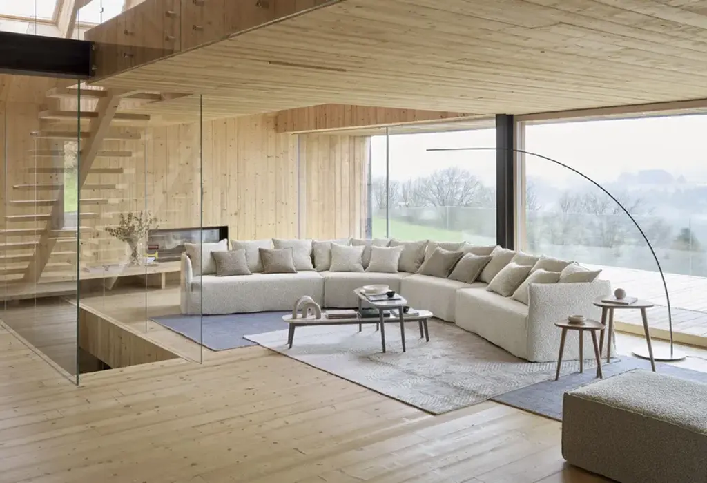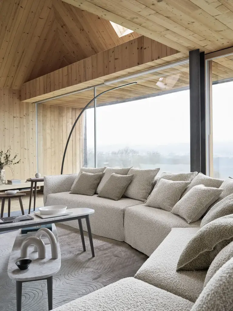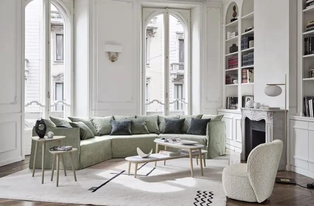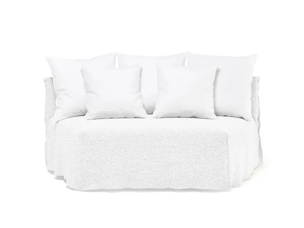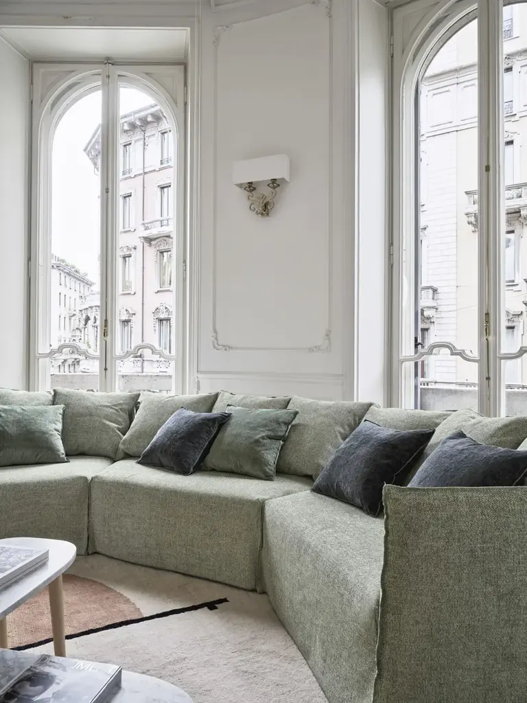 Ghost 34 is the modular sofa with polyurethane foam padding. Removable cover. Fly cushions in feather blend.Ghost, a sofa created with a light body and essential volumes. Made from a thin, minimal structure padded with polyurethane foam, Ghost contains soft loose cushions in mixed down. The main feature of the Ghost sofas is the removable cover, an oversize housse whose shape is underlined by the visible stitching, allowing it to be put on and taken off in a flash. A textile product that easily changes appearance, allowing you to go from a formal to an informal look with ease and speed.Comfort and versatility are the keywords that define Ghost, a collection of seats that are as comfortable and enveloping as their upholstery. The name of the collection is inspired by the white version which, thanks to the soft falling fabric, brings to mind the common imagination of ghosts. The large collection Ghost seats is developed around a light body with essential volumes that contains soft cushions. The main feature is the upholstery: an oversized housse whose profile is underlined by the visible stitching. Sofas, armchairs, ottomans, chairs and beds are undressed and dressed in a flash, like a change of clothes, taking on a different image each time, simple or sophisticated, depending on the personality of those who choose and live them.