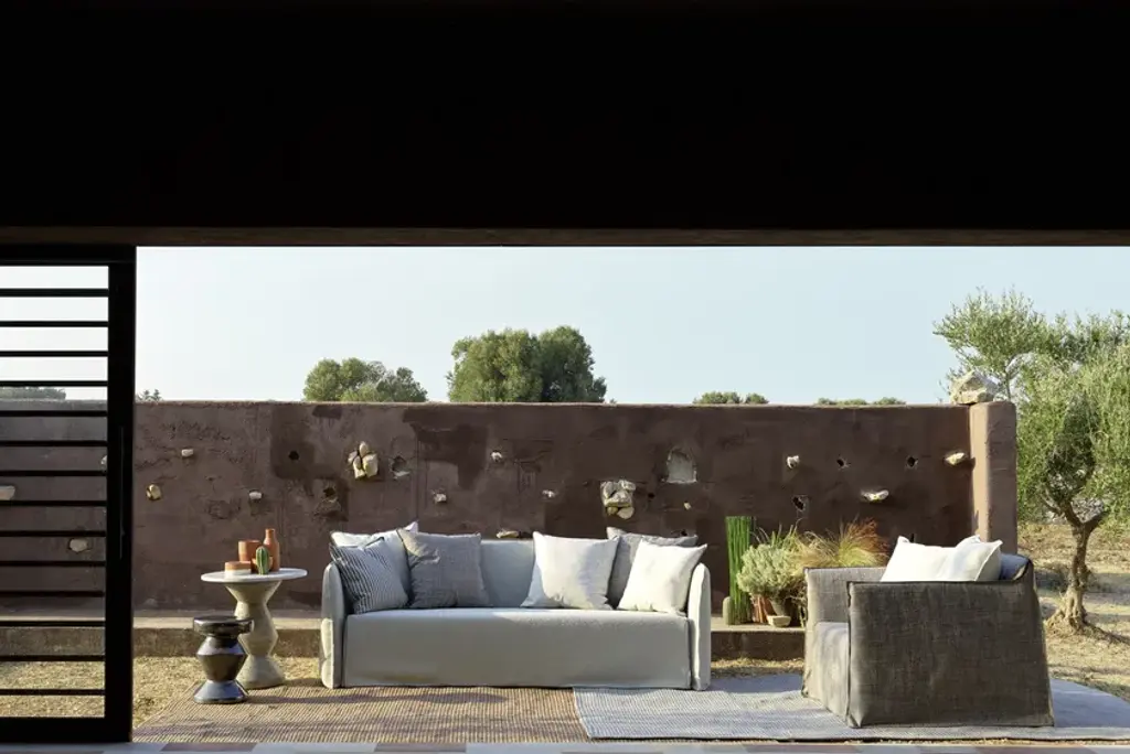 Ghost Out 12 is a sofa for outdoor use, upholstered with water repellent polyurethane foams, removable covers. Four back cushions 60x60 and two 50x50 cm.Family of padded sofas with removable upholstery, Ghost Out 10/12/16 boast a comfortable and enveloping seat that develops around a light body with essential volumes. Designed to resist water and sunlight and to maintain their shape and aesthetics over time, they are available in various sizes, two-seater or three-seater and with different seat depths. They are characterised by a geometric structure in which the softness is accentuated by loose cushions. The main feature is the upholstery: an oversized housse whose profile is underlined by the visible stitching, to let itself be undressed with ease and take on a different image each time.The Gervasoni Outdoor collection is the result of a careful selection of natural and technical materials worked with skillful craftsmanship and innovative technologies. The company’s products adapt to different styles of outdoor living, furnishing – with absolute ease, elegance and free customisation – terraces, gardens or swimming pools, from the most urban and contemporary to the most sophisticated or surrounded by nature. Each place has its own unique character that must be respected and enhanced. The key features of the range are, as always, attention to detail, excellent workmanship and in-depth research into materials.