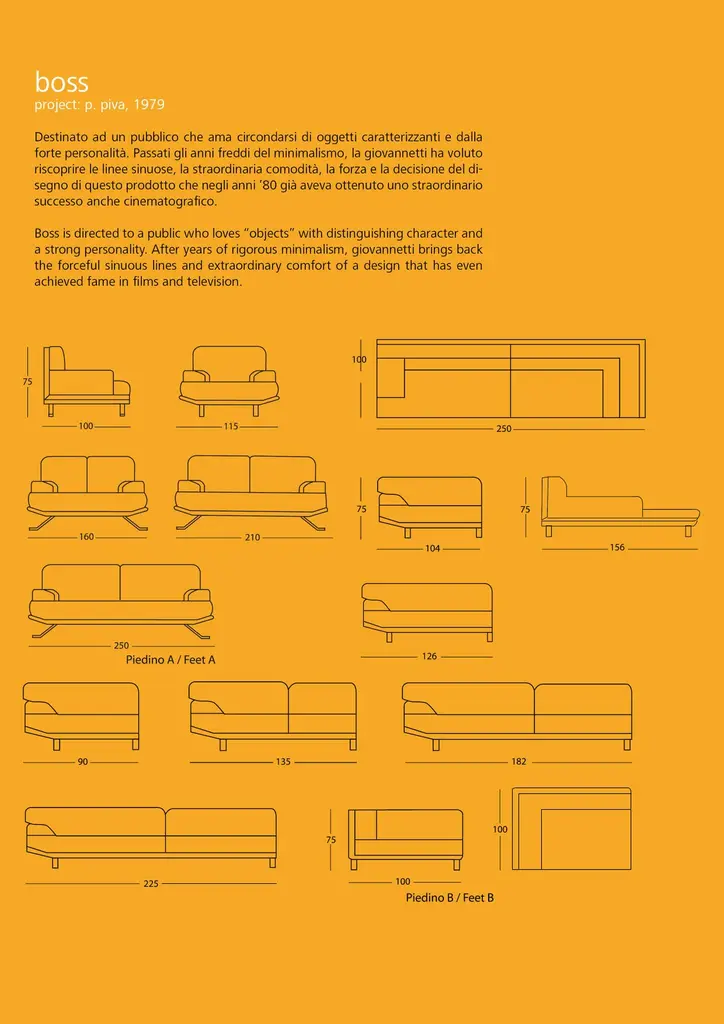 Boss is directed to a public who loves "objects" with distinguishing character and a strong personality. After years of rigorous minimalism, Giovannetti brings back the forceful sinuous lines and extraordinary comfort of a design that has even achieved fame in films and television.Available in different colors and sizes.Frame in tubular steel, padding in polyurethane foam covered with protective lining.Seat and back cushion/armrest: polyurethane foam pad-ding, covered with acrylic thermo-welded fibre Springing with steel plasticized bogie and spiral springs Feet A: painted steel profileFeet B: black PVC.Removable cover.