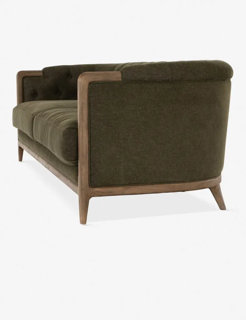 Instantly transform the look of your room with the Parisian appeal of this living room sofa. Wrapped in richly-textured, earthy olive green upholstery, its exposed wooden frame immediately catches the eye. Button tufting, a curved back, and rolled arms finish the traditional look, making this sofa a perfect fit for more formal living spaces.