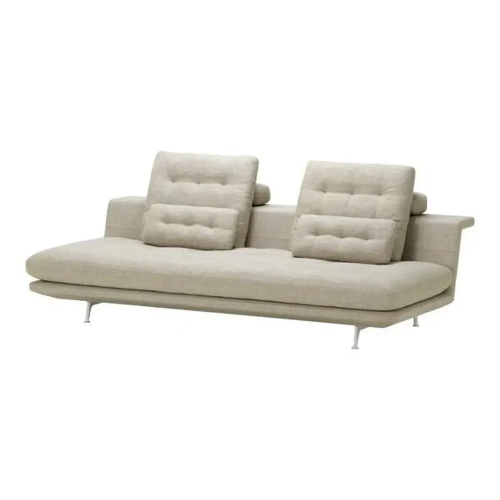 ****Please Note: This product is not FR compliant and cannot be shipped to the following places: Anchorage, California, D.C., Maine, Maryland, Minnesota, New Hampshire, Rhode Island, San Francisco, Vermont, Washington, Canada. Contact us for information on complaint versions.**** Grand Sofa is Antonio Citterio's interpretation of luxurious comfort and contemporary design. The designer's Italian flair for lightness and elegance is united with the trademark quality and precision of the Swiss company Vitra. The clean lines and geometric forms of the generously dimensioned sofa elements create a spacious platform for sitting or reclining. Despite its expansive proportions, Grand Sofa has a graceful silhouette: the slim, fabric-covered body is doubly angled to form a cascading seat, backrest and rearward ledge. The body is supported at two points under each end of the seat surface and behind the backrest by a bridge-like aluminium base frame, making the sofa appear to float above the floor. The seating elements are open on the sides, which emphasises the horizontal planes of Grand Sofa. Consumers can choose between a full-length backrest or a shortened version. This makes it possible to produce large seating arrangements with gaps and viewpoints a sofa landscape with an almost topographical character, conveying an expression of lightness and variability.