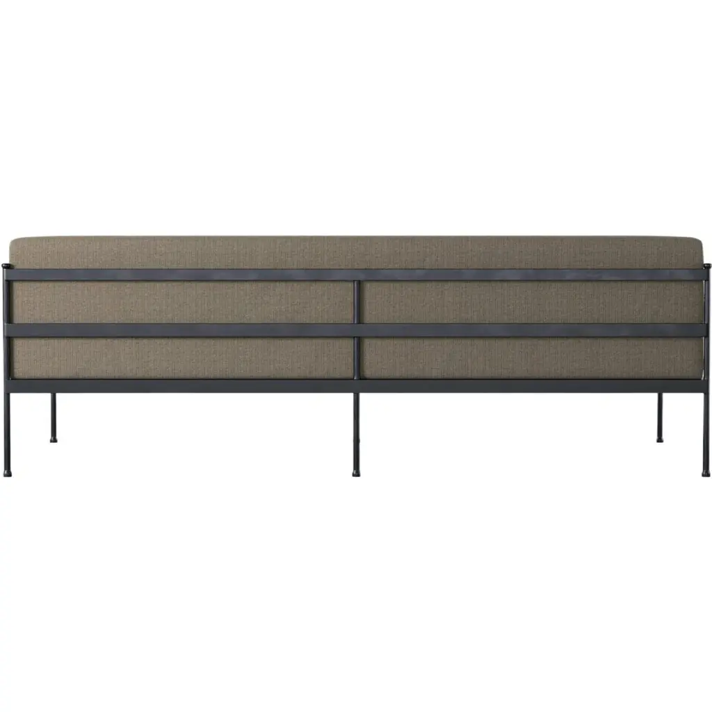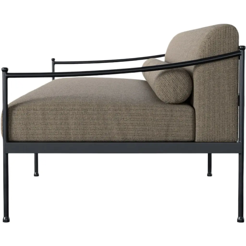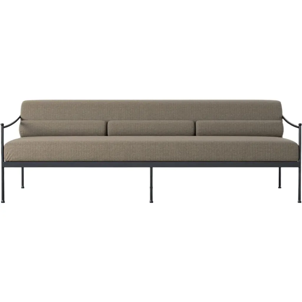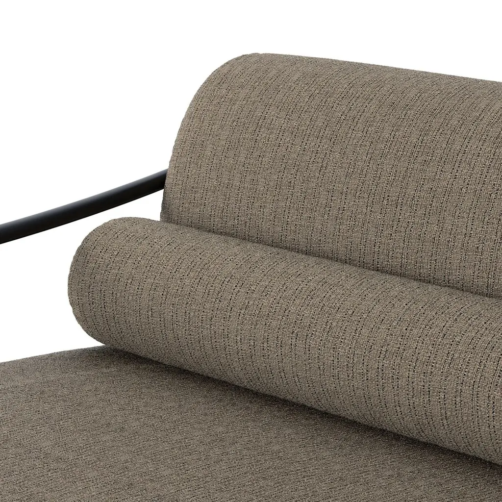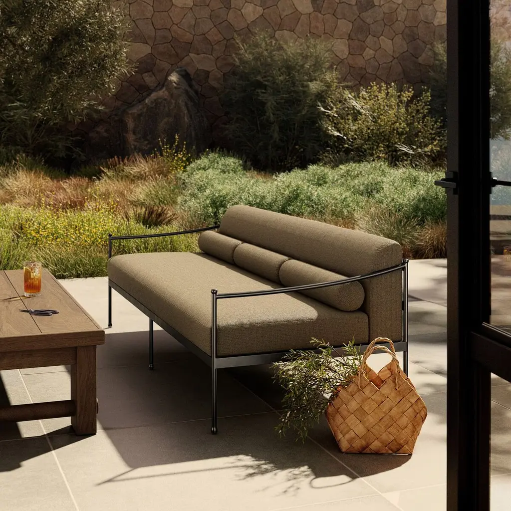 French vintage inspiration embodies the streamlined silhouette of this metal-framed outdoor sofa. A low profile with understated turned leg details supports washable cushions, complemented with three bolster back pillows for an updated look. Cover or store inside during inclement weather and when not in use.