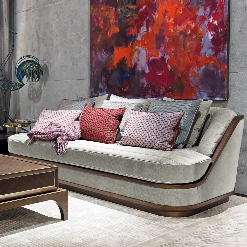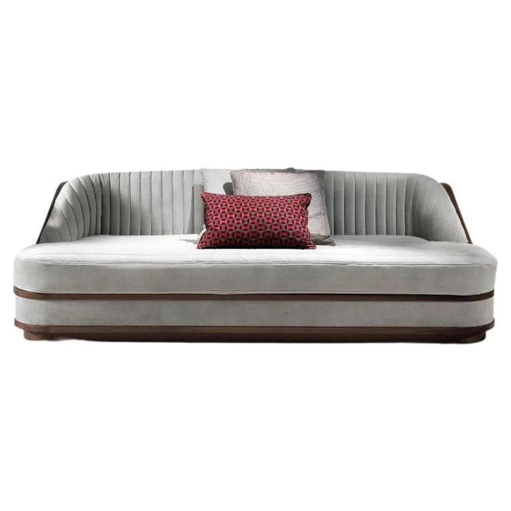 A refined design to make a stately and iconic accent in a modern style interior, this three-seat sofa features a clean and inviting silhouette. Boasting a precious Canaletto walnut frame, it is distinguished by a gray velvet upholstery, elegantly quilted on the backrest. It includes three cushions, please ask the Concierge for details.