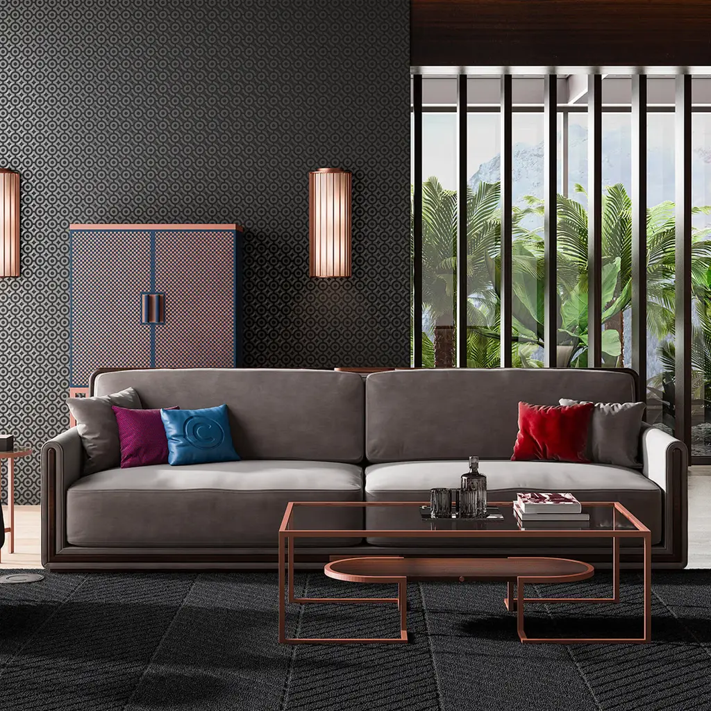 The sleek and modern design of this sofa will complement any interior, brightening a neutral ensemble or balancing a vibrant decor. The oversized cushions of seat and back are supported by a U-shaped frame featuring a wood insert along the entire profile, which gives it a distinctive mark and enhances the architectural silhouette. Upholstered in soft leather (cat. C) in a sophisticated dove-gray color, this dynamic sofa will bring elegance to an office decor or a contemporary living room.