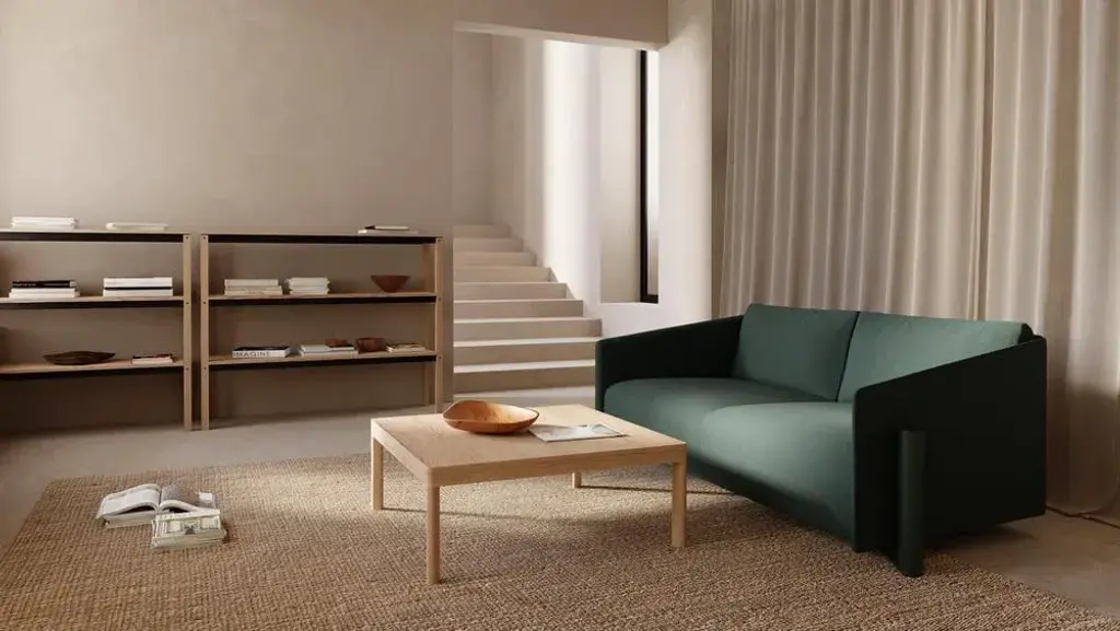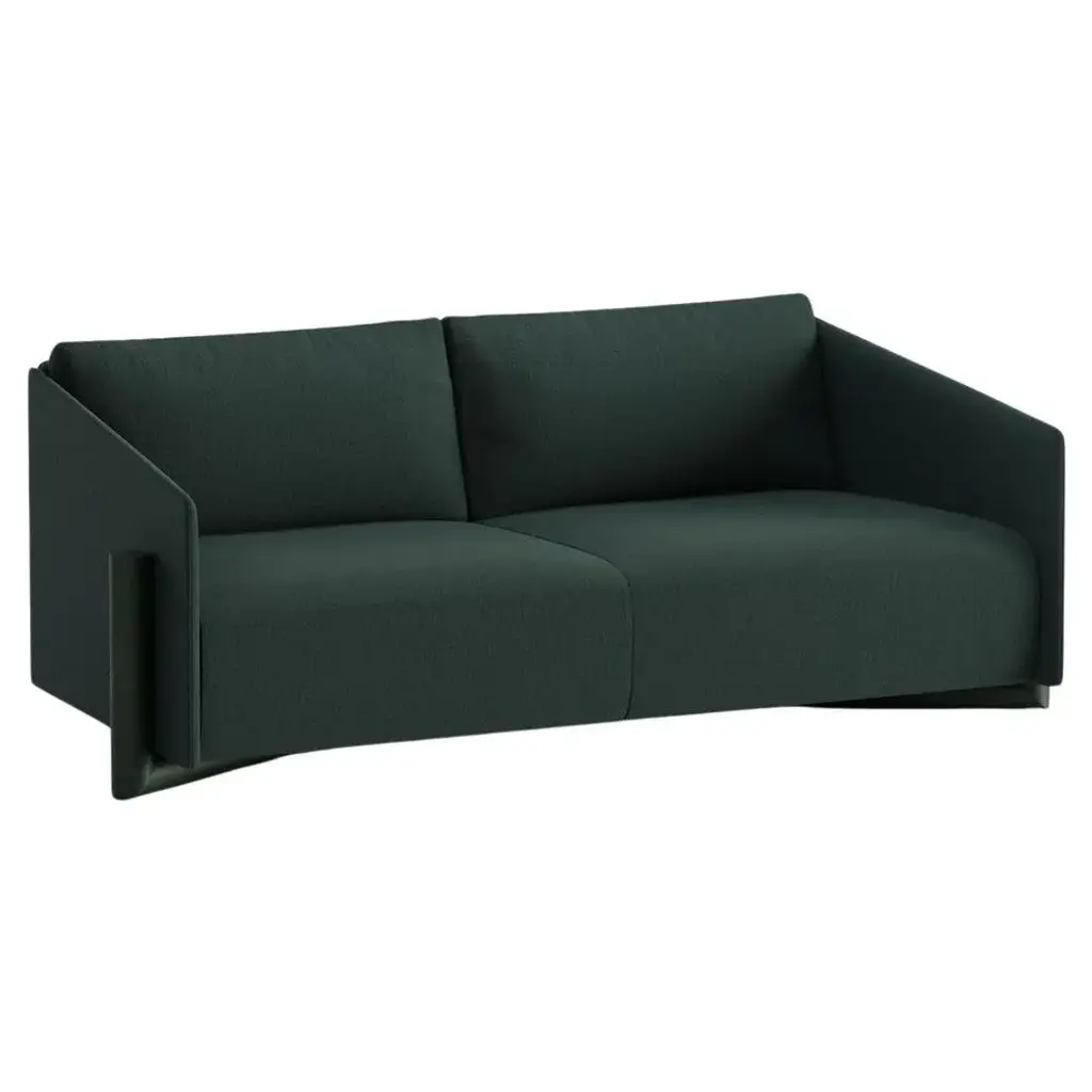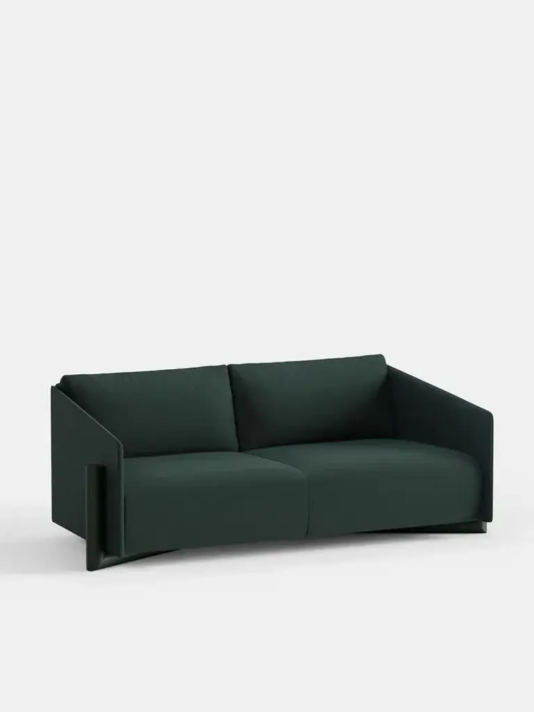 Green timber 3 seater sofa by kann design dimensions: d 104.5 x w 200 x h 75 cm. Materials: solid wood, elastic belts, hr foam, fabric upholstery kvadrat vidar 1062 (94% wool, 6% nylon). Available in other fabrics. the strong presence of textile in the timber collection gives it the appearance of a comfortable cloud that seems to levitate above the ground. The wooden structure disappears under the furniture to appear only at the back and on each side of the armrests, playing on the resemblance to the roots of a tree. The character and dynamism of the furniture is reinforced by the choice of a two-color between the textile and the wood.