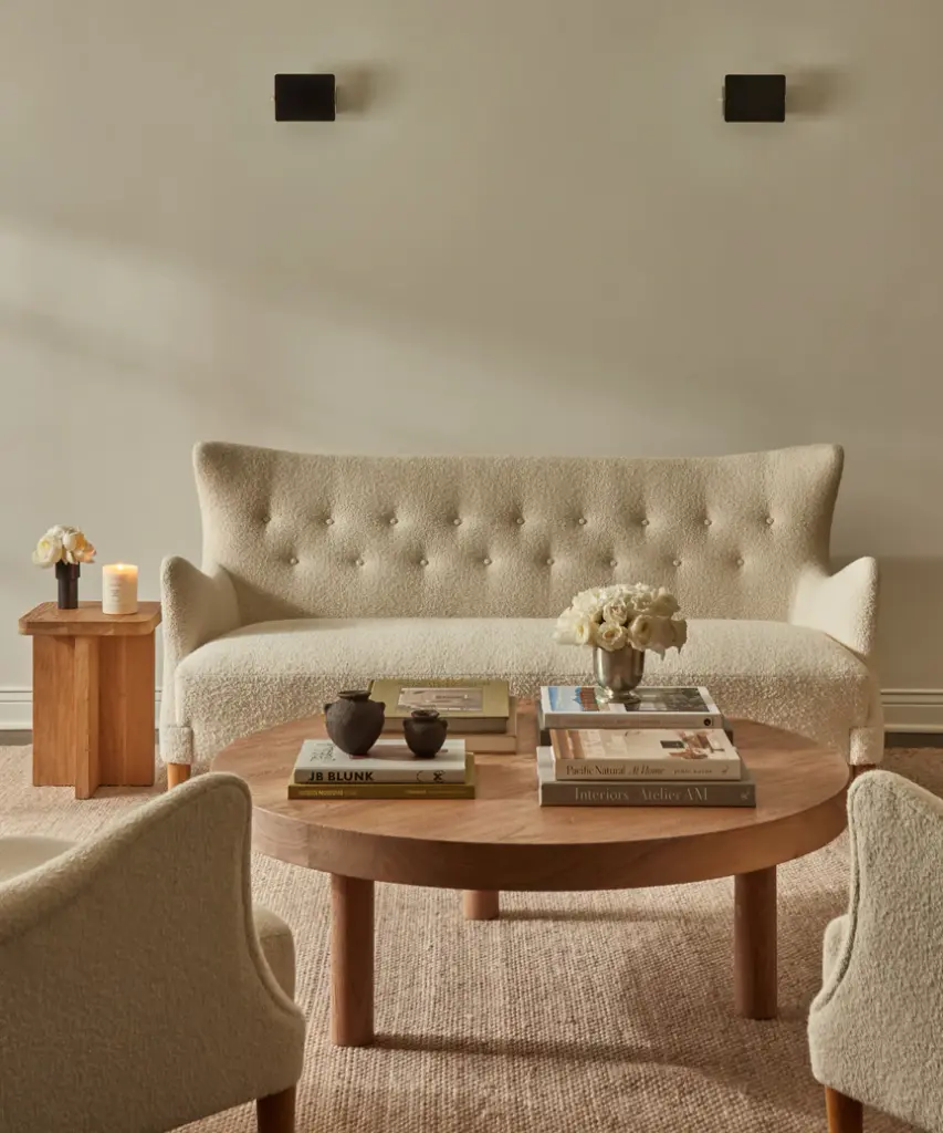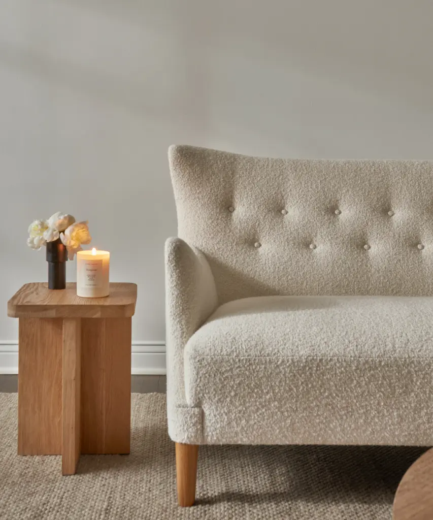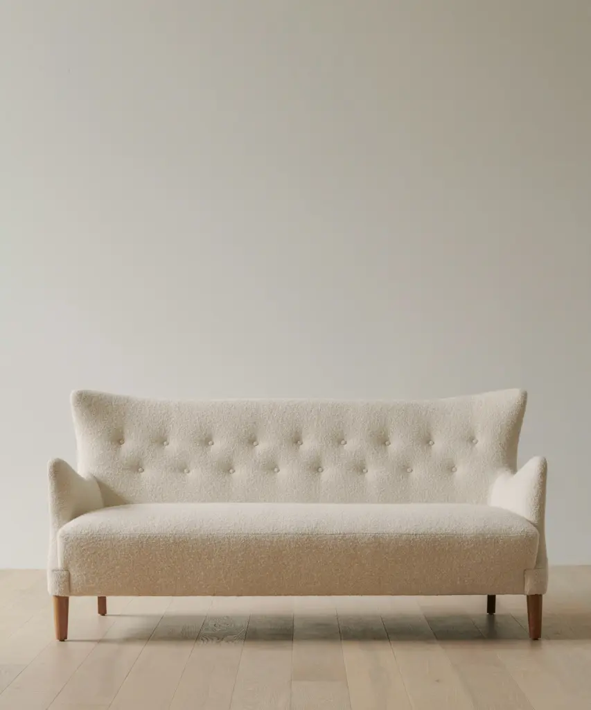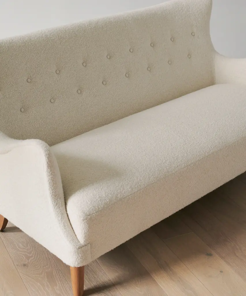 Greenwich Sofa Oyster Mini BoucleInspired by one of Jenni’s beloved antiques, this low-profile statement sofa is the perfect touch of timeless luxury. Tufted tight-seat sofa featuring White Oak legs and Italian Mini Boucle: 51% cotton, 17% viscose, 15% acrylic, 9% linen, 8% polyester. Handmade in the United States. For furniture purchases, please refer to our furniture inspection policy here, and for help styling this piece in your space, contact styling@jennikayne.com for a complimentary consultation.