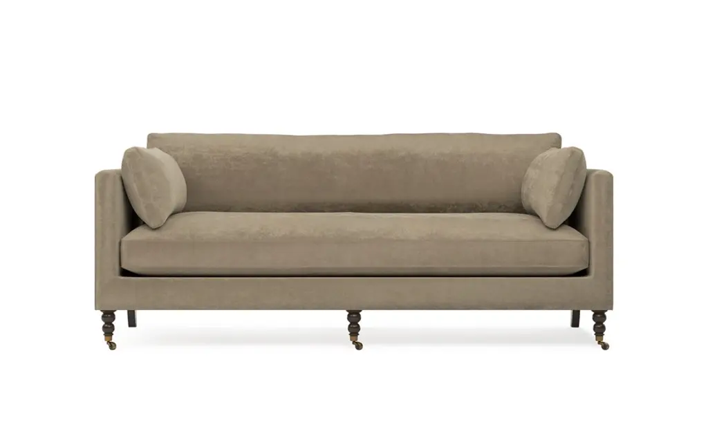 Looking for an upholstery collection with a nod to our vintage style and quality that will last for years to come? Look no further than our Greta collection. Every detail was designed to fit seamlessly into your home, from the clean yet comfortable lines of the frame to the turned washed oak legs with brass casters. Each Greta piece is meticulously hand-crafted to order in the U.S.A. using kiln-dried hardwood frames and the highest quality materials. And all that's offered in style and quality is matched in comfort, with a partial plant based high-density poly foam core wrapped in two softer poly foam layers for comfort, encased in a multi-channeled pillow-soft casing of poly and feather/down blend. This is sure to become the best seat in the house! Spot clean only with a water-free dry cleaning solvent. Pretest a small, inconspicuous area before proceeding. Do not saturate. DO NOT USE WATER. Pile fabrics may require brushing with a non-metallic, stiff bristle brush to restore appearance. Cushion covers should not be removed and dry cleaned. To prevent overall soiling, frequent vacuuming or light brushing with a non-metallic, stiff bristle brush to remove dust and grime is recommended. When cleaning a spill, blot immediately to remove spilled material. Clean spots or stains from the outside to the middle of the affected area to prevent circling. Overall cleaning by a professional furniture cleaning service only is recommended. Looking for fabric swatches? Please email swatches@chairish.com for availability