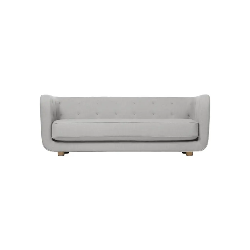 Grey and smoked oak Raf Simons Vidar 3 Vilhelm sofa by LassenDimensions: W 217 x D 88 x H 80 cm Materials: Textile, Oak.Vilhelm is a beautiful padded three-seater sofa designed by Flemming Lassen in 1935. A sofa must be able to function in several ways. It should invite calm and contemplation. Create a private space you can hide in and at the same time invite to life and play. It must be able to withstand sitting on the backrest or on the armrests and then it must be able to stand in the middle of the room if you want to.In addition to being aesthetically beautiful and harmonious, the design makes absolute sense in relation to these parameters.By Lassen is a Danish design brand focused on iconic designs created by Mogens and Flemming Lassen, founded by Lassens’ relatives in 2008. Brothers Mogens (1901-1987) and Flemming (1902-1984) Lassen are known as two of Denmark’s greatest architects and designers. Both were renowned pioneers of Danish functionalism and modernist architecture, honoured with numerous prestigious medals and awards. Headed by Mogens Lassen’s grandson Søren Lassen, by Lassen carries on the brothers’ design philosophy by manufacturing their iconic designs as well as products by other designers that complement the Lassen’s functionalist style. The company’s mission is to continue the tradition of timelessness, functionality and quality, and to introduce the Lassen’s design heritage to new generations.