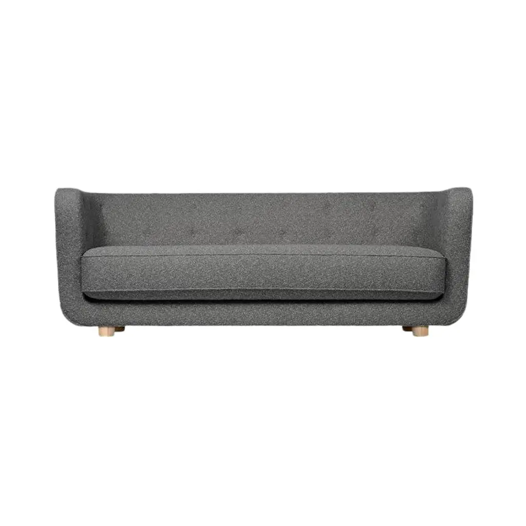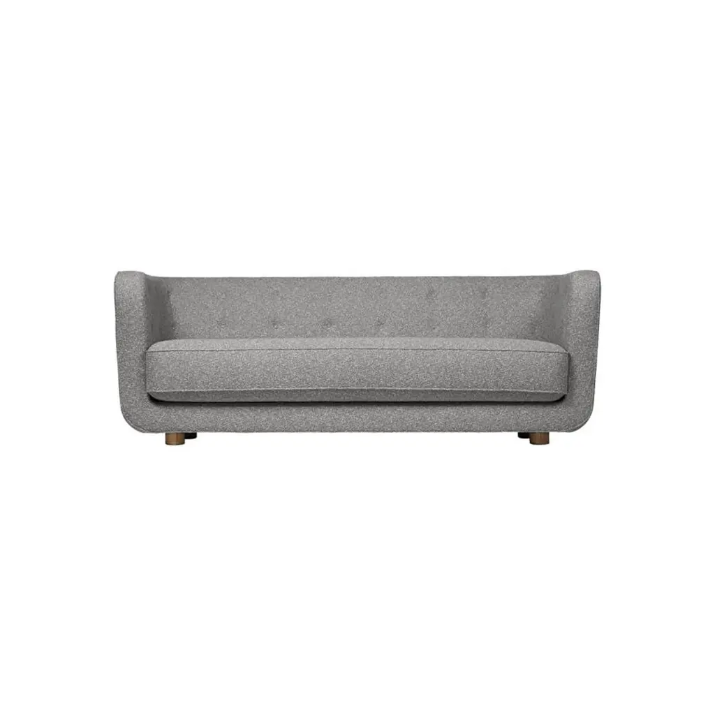 Grey and smoked oak Sahco Zero Vilhelm sofa by LassenDimensions: W 217 x D 88 x H 80 cm Materials: textile, oak.Vilhelm is a beautiful padded three-seater sofa designed by Flemming Lassen in 1935. A sofa must be able to function in several ways. It should invite calm and contemplation. Create a private space you can hide in and at the same time invite to life and play. It must be able to withstand sitting on the backrest or on the armrests and then it must be able to stand in the middle of the room if you want to.In addition to being aesthetically beautiful and harmonious, the design makes absolute sense in relation to these parameters.By Lassen is a Danish design brand focused on iconic designs created by Mogens and Flemming Lassen, founded by Lassens’ relatives in 2008. Brothers Mogens (1901-1987) and Flemming (1902-1984) Lassen are known as two of Denmark’s greatest architects and designers. Both were renowned pioneers of Danish functionalism and modernist architecture, honoured with numerous prestigious medals and awards. Headed by Mogens Lassen’s grandson Søren Lassen, By Lassen carries on the brothers’ design philosophy by manufacturing their iconic designs as well as products by other designers that complement the Lassen’s functionalist style. The company’s mission is to continue the tradition of timelessness, functionality and quality, and to introduce the Lassen’s design heritage to new generations.