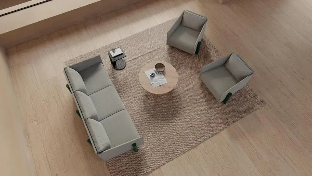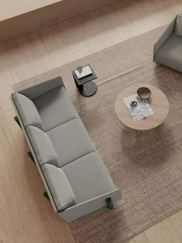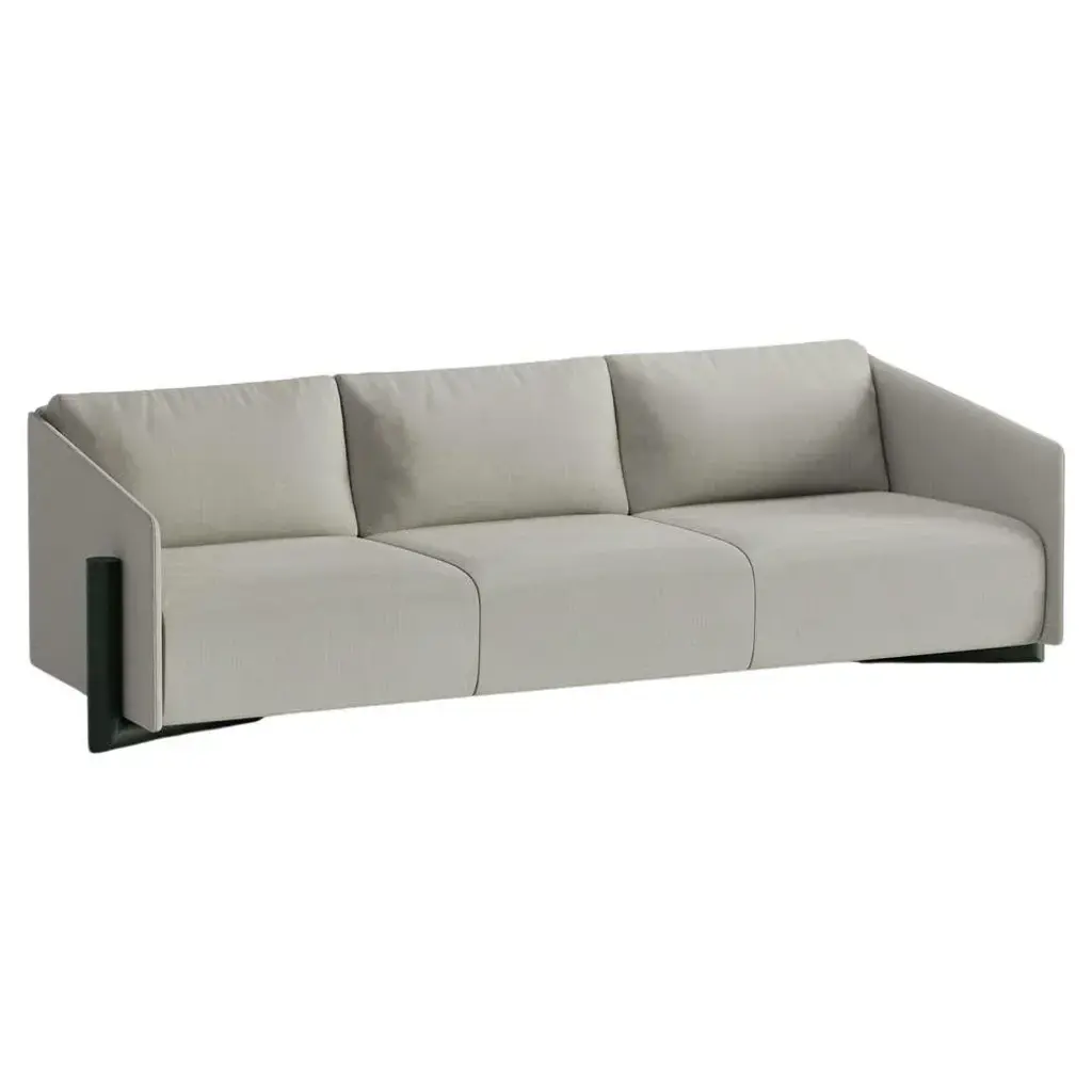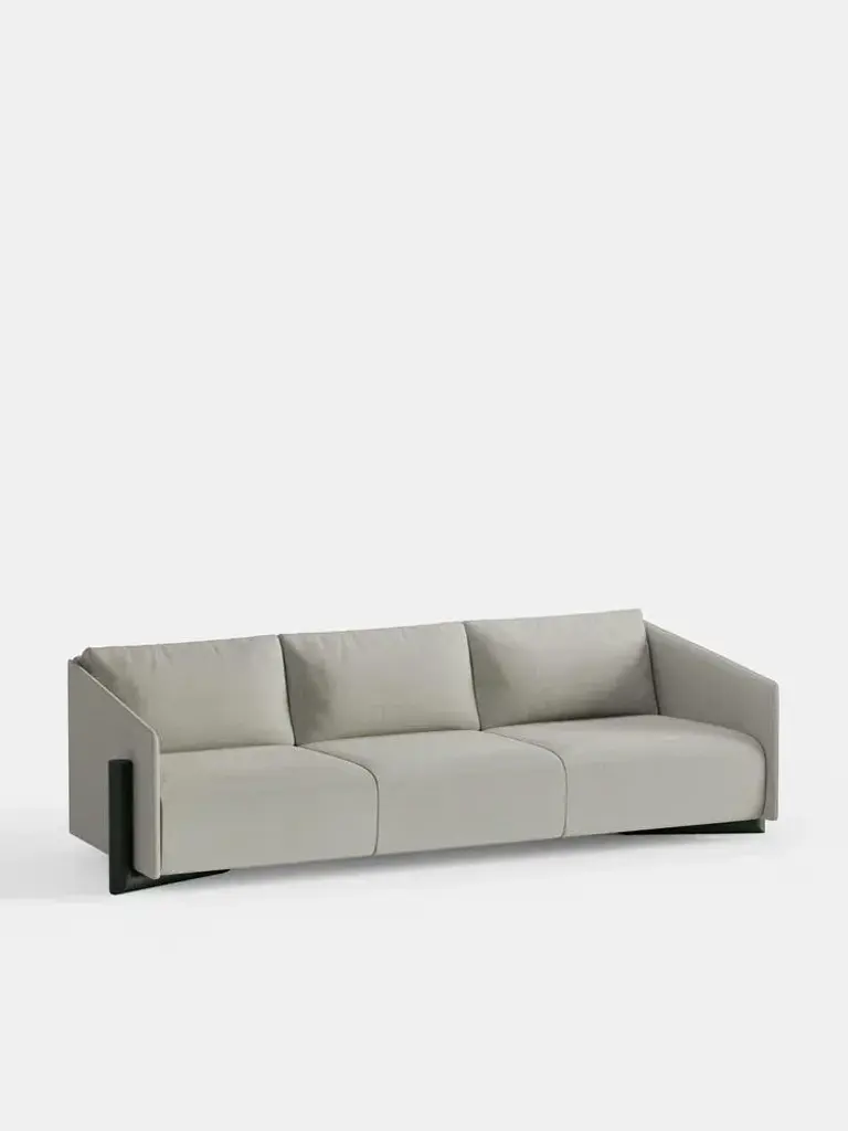 Grey timber 4 seater sofa by kann design dimensions: d 104.5 x w 260 x h 75 cm. Materials: solid wood, elastic belts, hr foam, fabric upholstery kvadrat remix 126 (90% wool, 10% nylon). Available in other fabrics. the strong presence of textile in the timber collection gives it the appearance of a comfortable cloud that seems to levitate above the ground. The wooden structure disappears under the furniture to appear only at the back and on each side of the armrests, playing on the resemblance to the roots of a tree. The character and dynamism of the furniture is reinforced by the choice of a two-color between the textile and the wood.