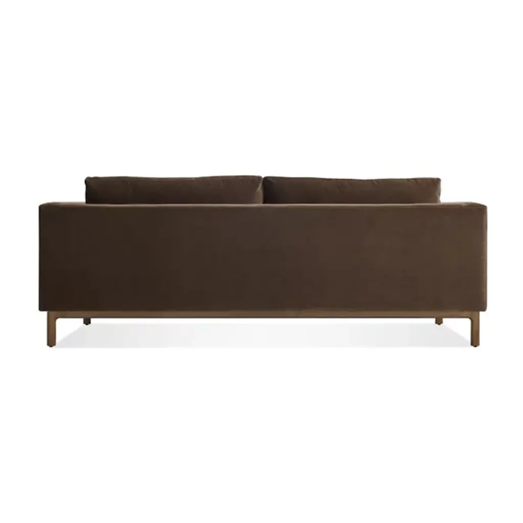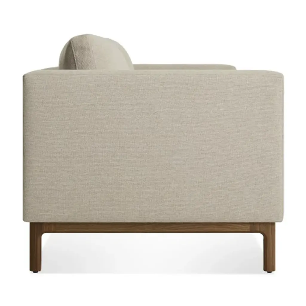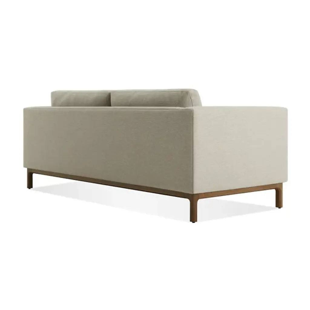 The Guide Sofa from Blu Dot leads a party into a time of pure relaxation with a balanced composition of firm and plush forms. This modern piece adds a handsome personality to the living room. It makes an elegant first impression with a low-profile wood base. The organic texture of the wood accentuates the pristine soft surfaces of the upholstery. The hardwood frame under the upholstery produces a sharp yet curvy silhouette. This frame receives back and seat foam cushions with springs for support. The cushions sit deeply for a true lounging experience.