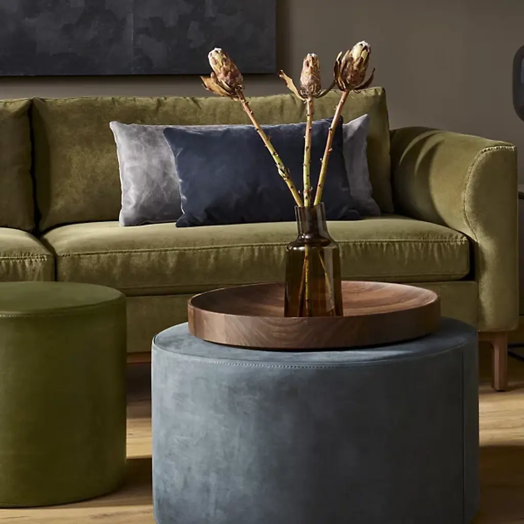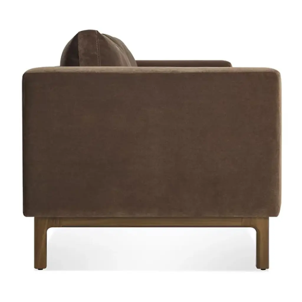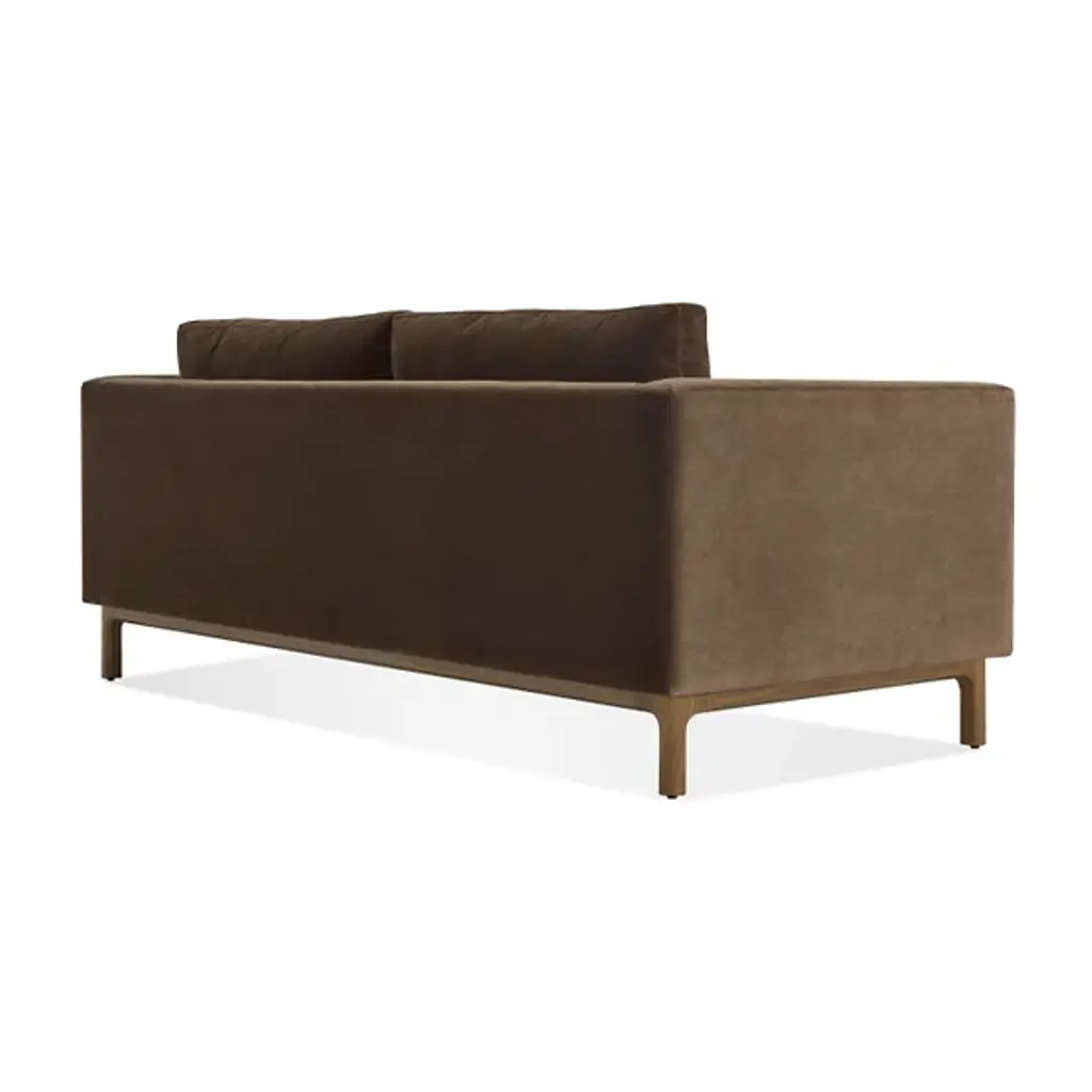 The Guide Sofa from Blu Dot leads a party into a time of pure relaxation with a balanced composition of firm and plush forms. This modern piece adds a handsome personality to the living room. It makes an elegant first impression with a low-profile wood base. The organic texture of the wood accentuates the pristine soft surfaces of the upholstery. The hardwood frame under the upholstery produces a sharp yet curvy silhouette. This frame receives back and seat foam cushions with springs for support. The cushions sit deeply for a true lounging experience.