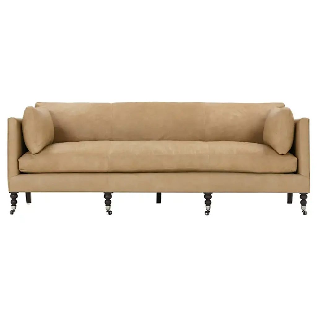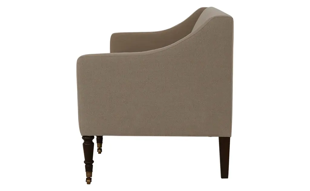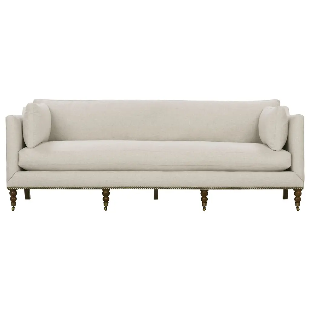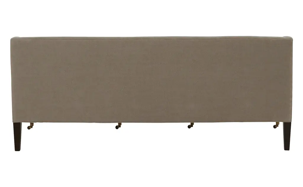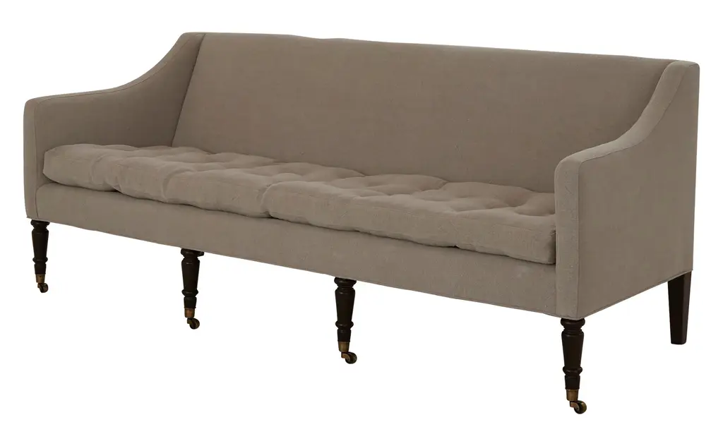 Our Gustav Sofa is the epitome of refinement. Handsome Gustav pairs a tight back with a firm tufted bench seat cushion for a comfortably upright sit. Gradually sloping arms, turned black walnut legs and antique brass casters add to its classic European feel. Perfect in a pre-war entryway, Gustav also works great in a sophisticated sitting room or a dressy living room. As Shown •upholstered in kitts-flax linen •ships in 6-10 weeks •fabric content: 100% linen•black walnut wood finish•antique brass casters•includes down and feather cushion upgrade•sustainable construction•made in the USA•JH web exclusive Dimensions •overall: 85"W x 31"D x 33"H•seat width: 79"•seat depth: 21"•seat height: 19"•arm height: 26"COM yardage needed is 12 yards. If using a patterned fabric please contact us at info@jaysonhome.com or 1-800-472-1885 for yardage requirements.