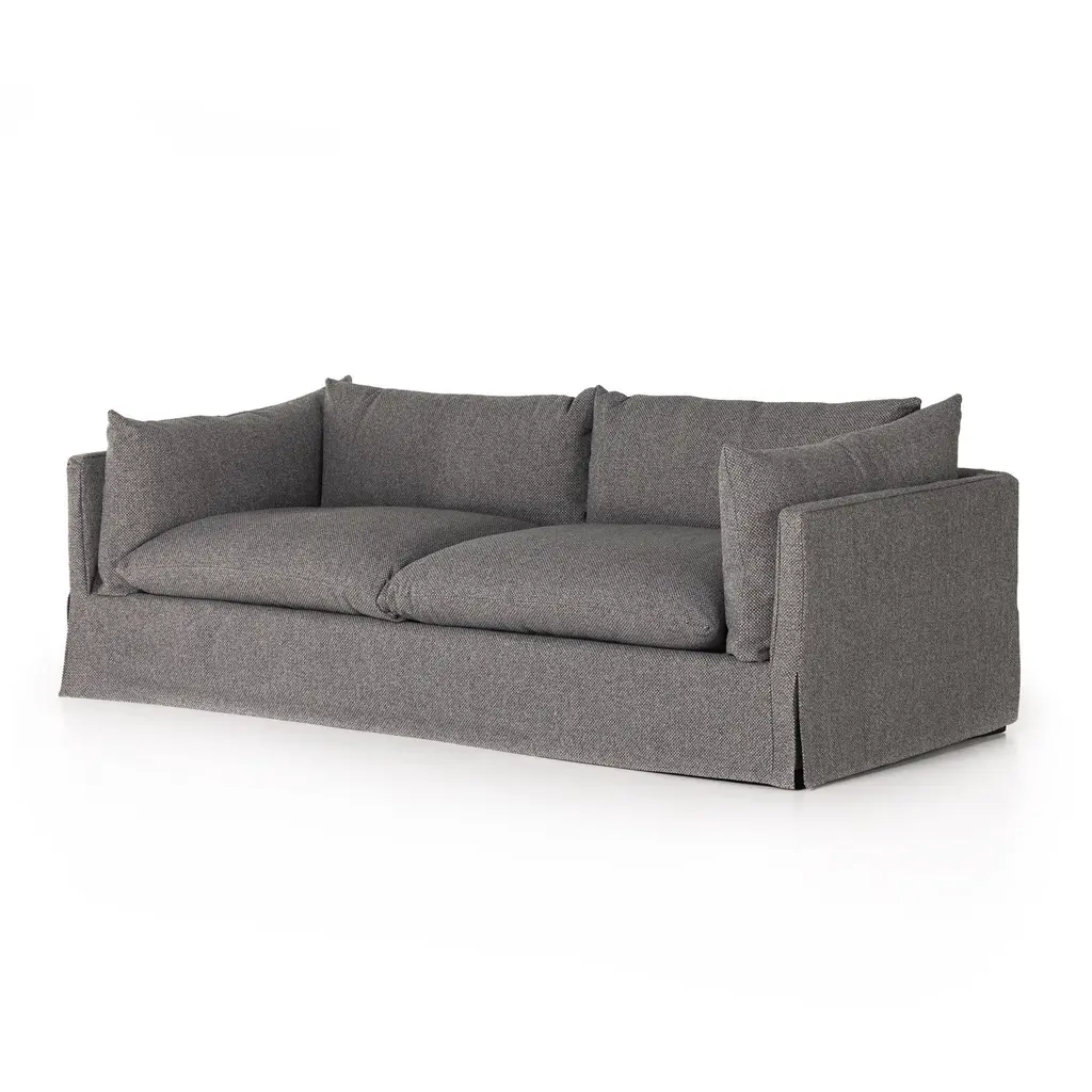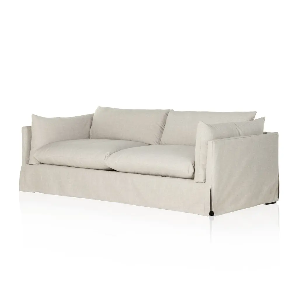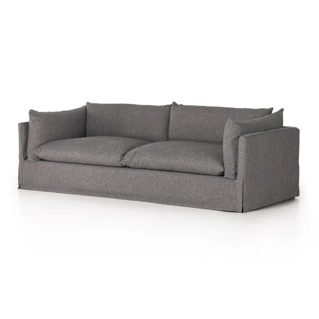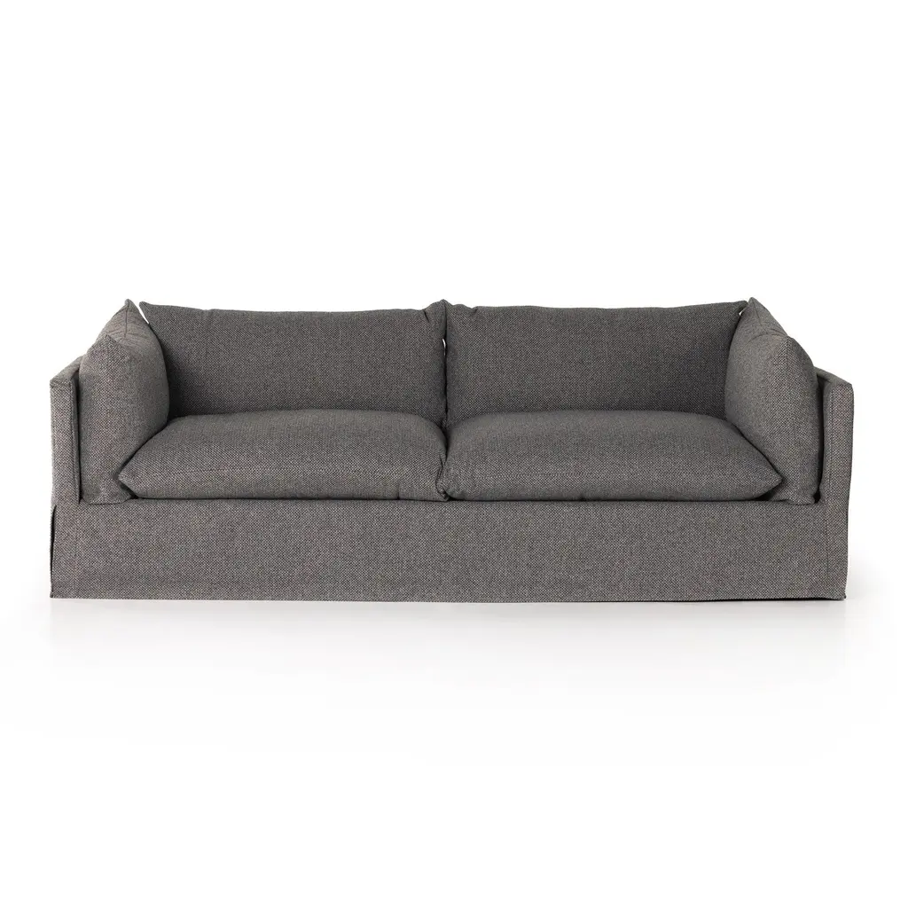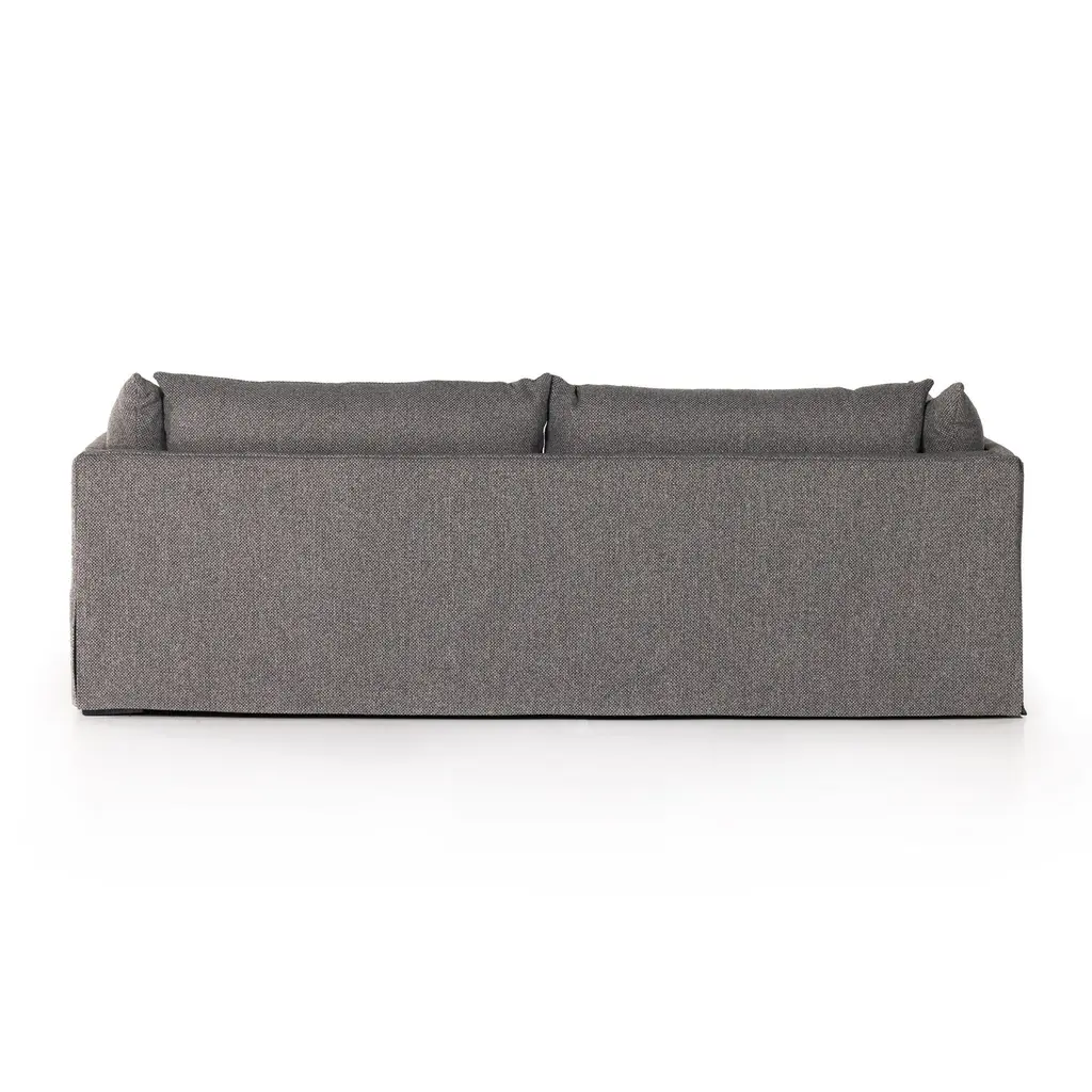 A loungey, slipcovered sofa, made for modern living. Shelter arms and pillow-inspired cushions are covered in textural fabric that's been mindfully made from landfill-diverted water bottles.