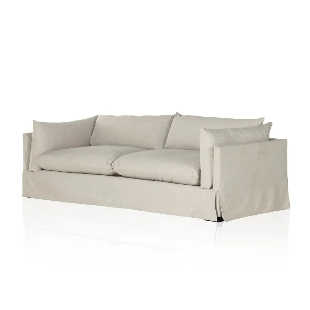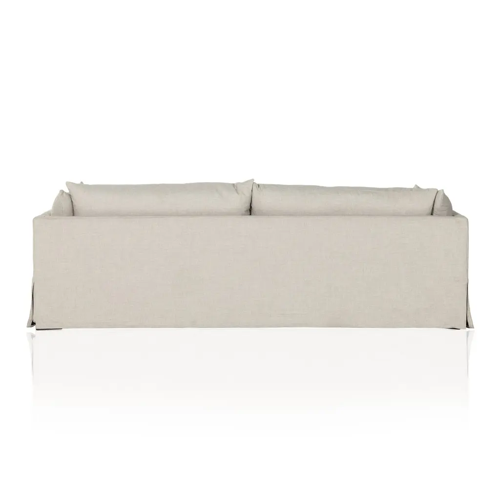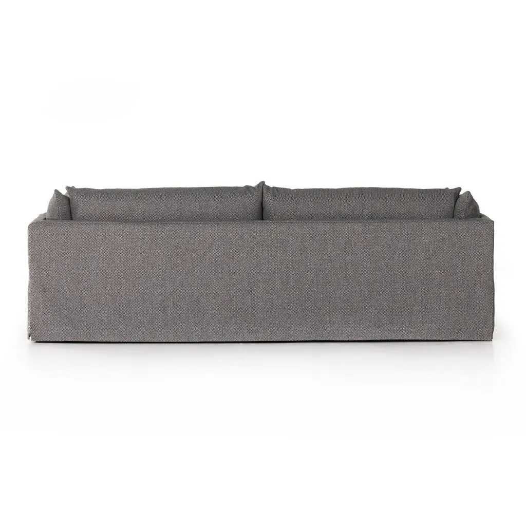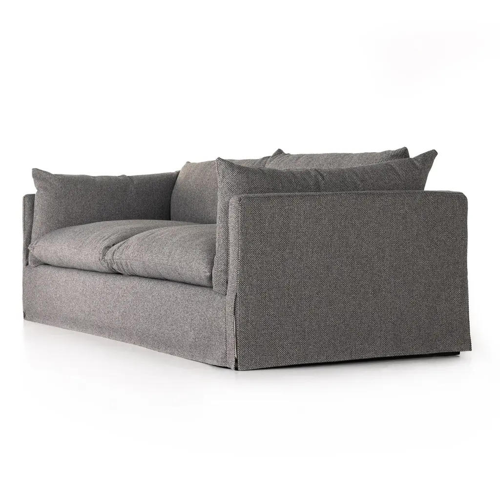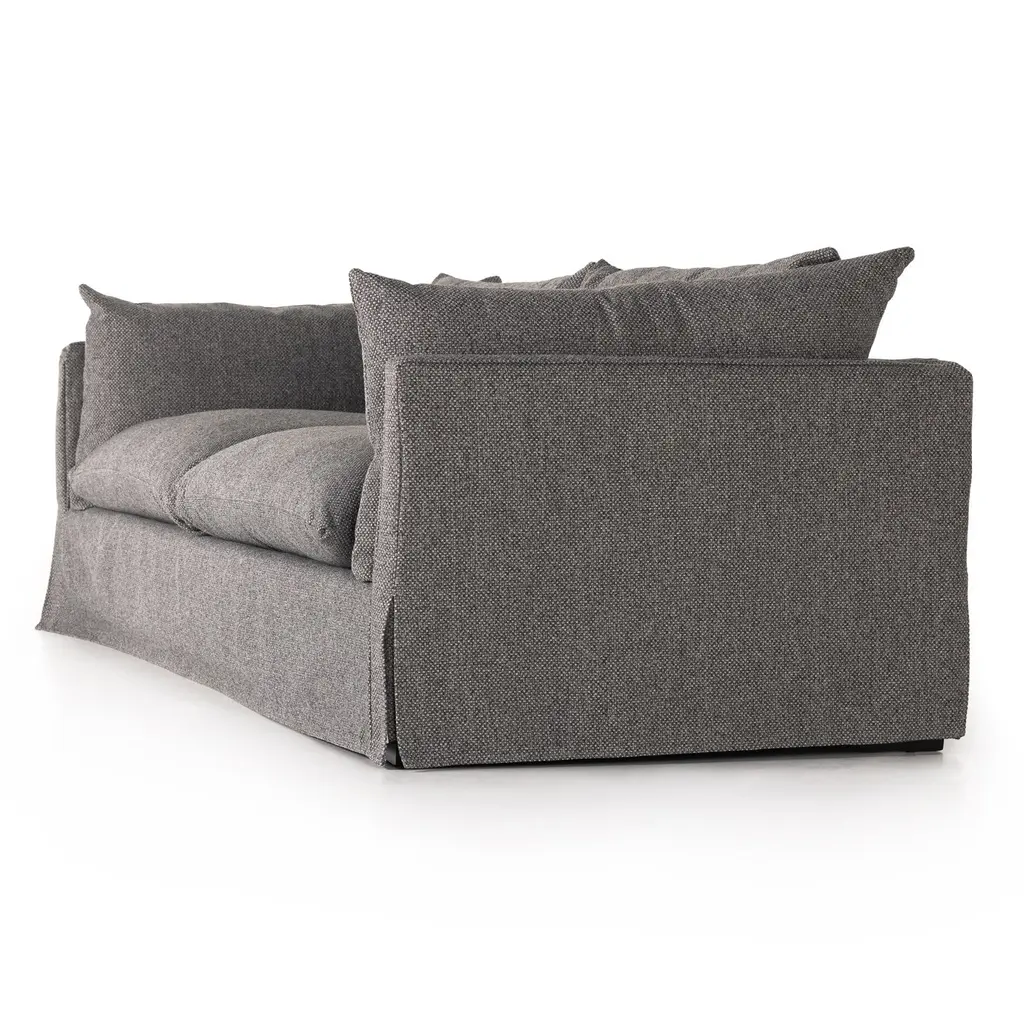 A loungey, slipcovered sofa, made for modern living. Shelter arms and pillow-inspired cushions are covered in textural fabric that's been mindfully made from landfill-diverted water bottles.