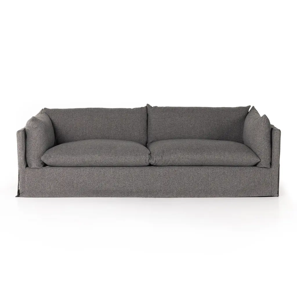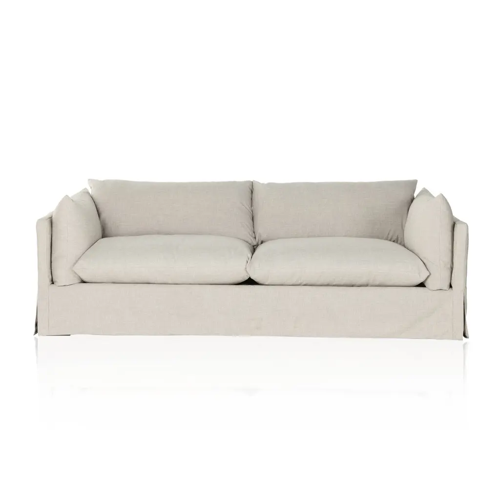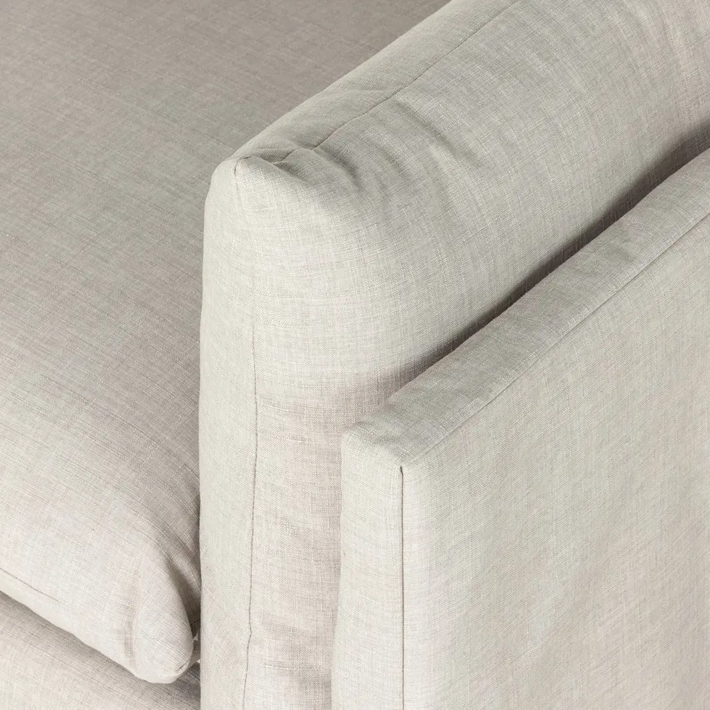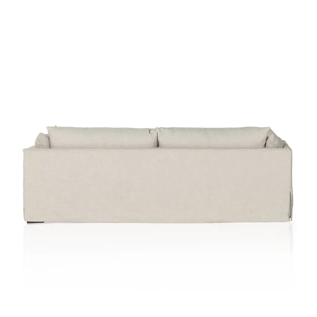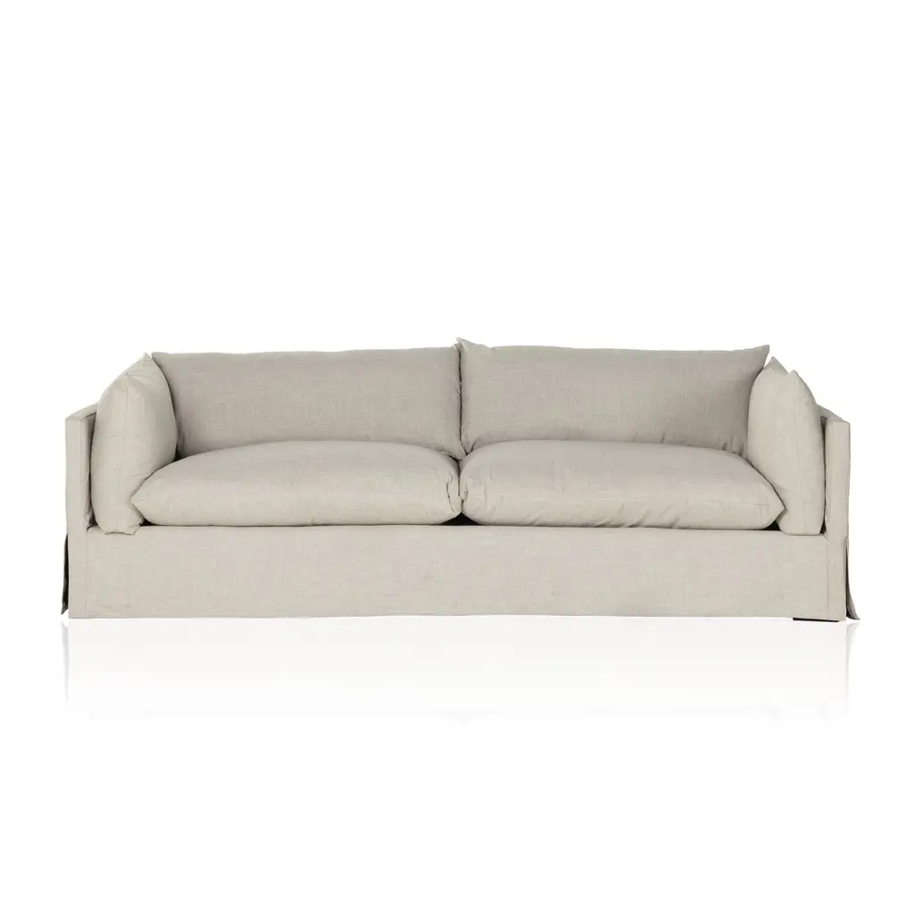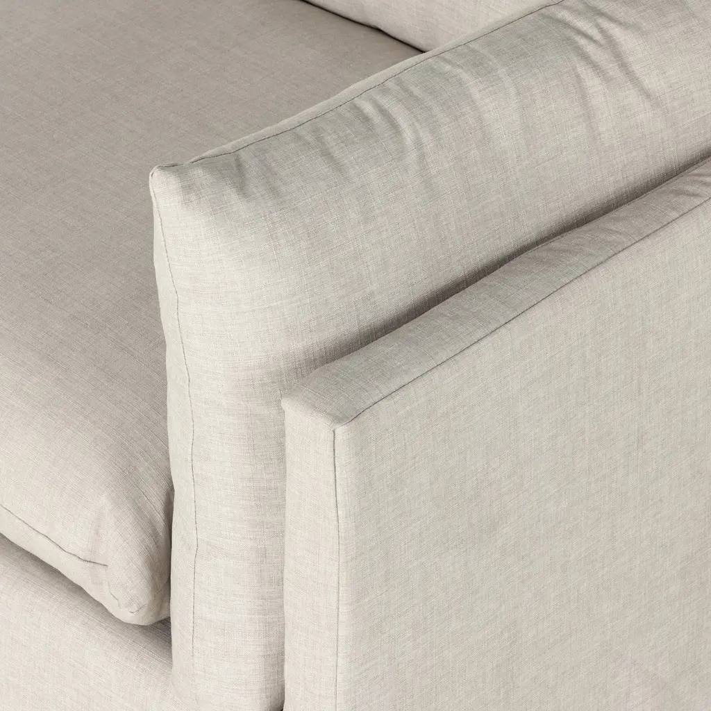 A loungey, slipcovered sofa, made for modern living. Shelter arms and pillow-inspired cushions are covered in textural fabric that's been mindfully made from landfill-diverted water bottles.