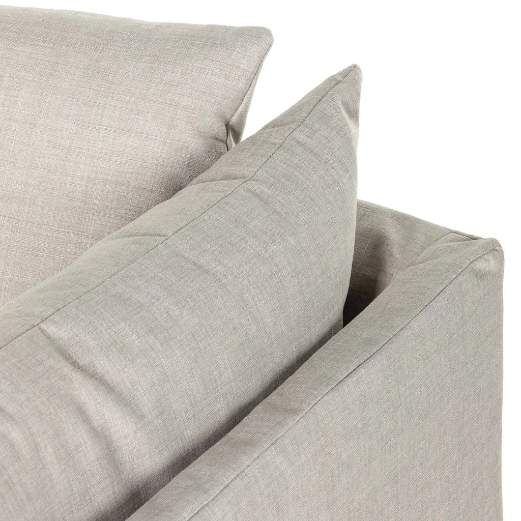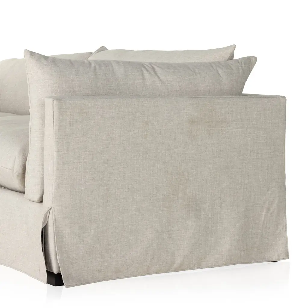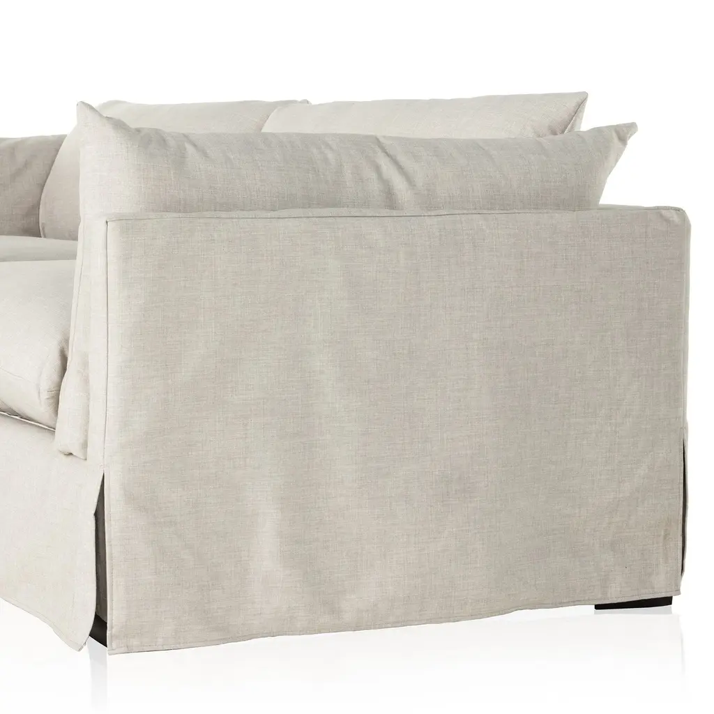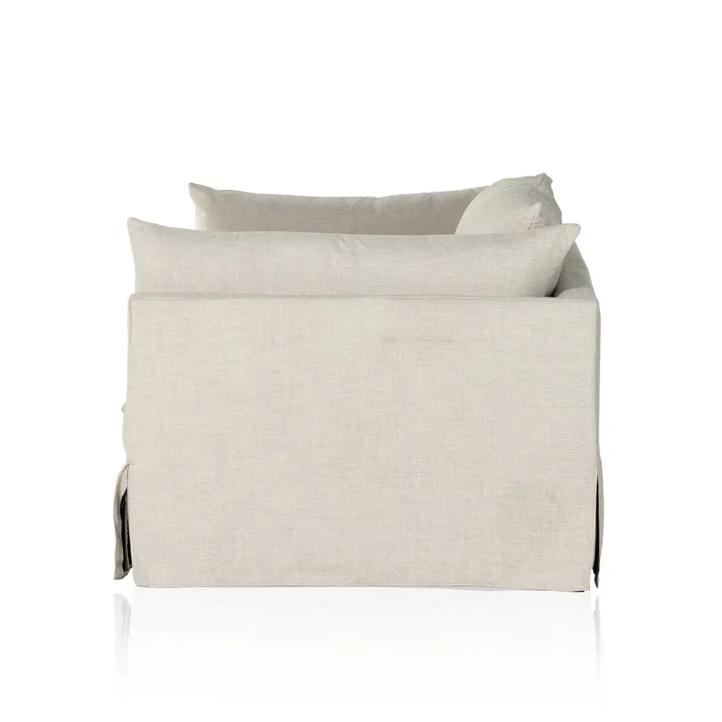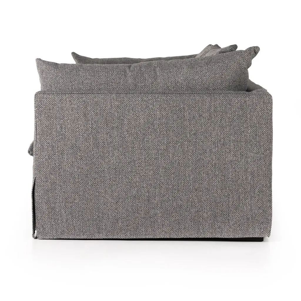 A loungey, slipcovered sofa, made for modern living. Shelter arms and pillow-inspired cushions are covered in textural fabric that's been mindfully made from landfill-diverted water bottles.