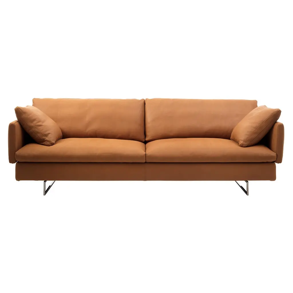Drawing on 1970s Italian modernism, armless leather sofa by Jannis Ellenberger has a voluminous look and firm sit made for socializing. Polished stainless steel frame complements buttery-soft Moore & Giles leather. Imported from New Zealand, the meticulously pleated leather will develop a beautiful patina over time. CB2 exclusive.