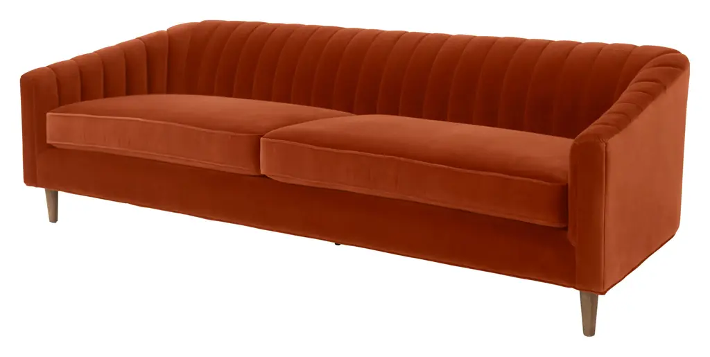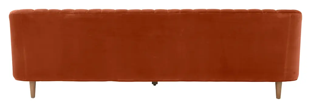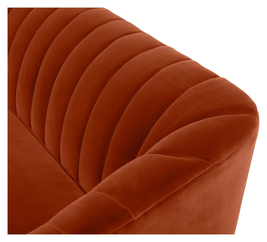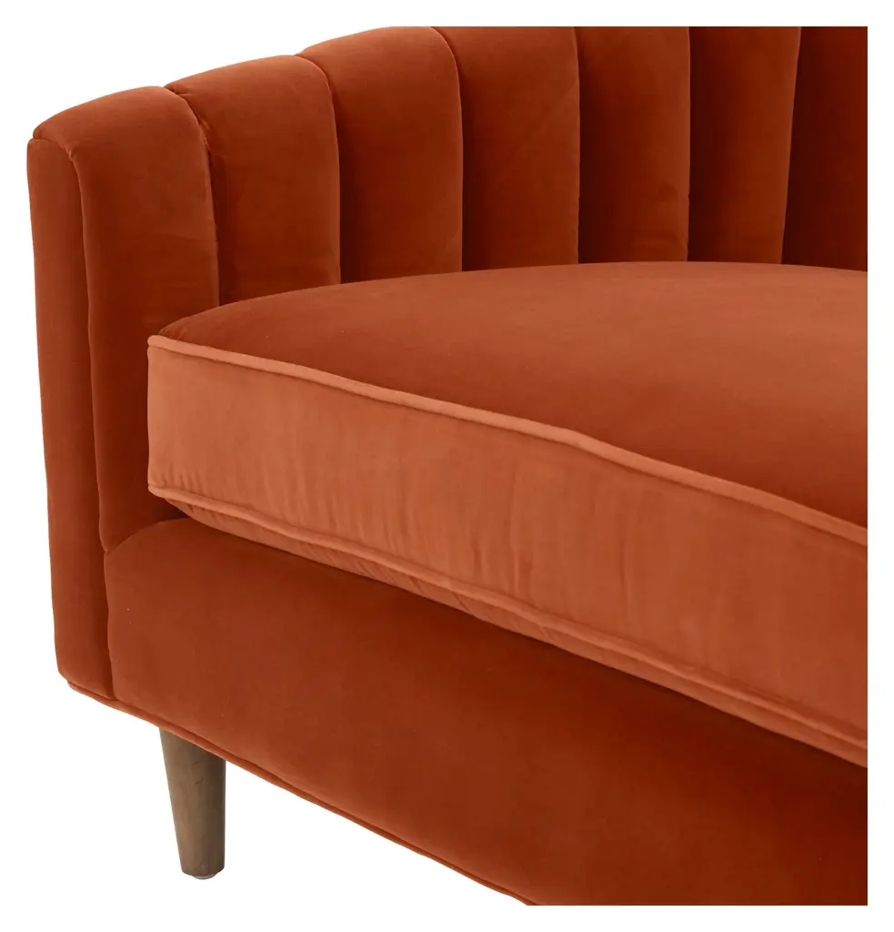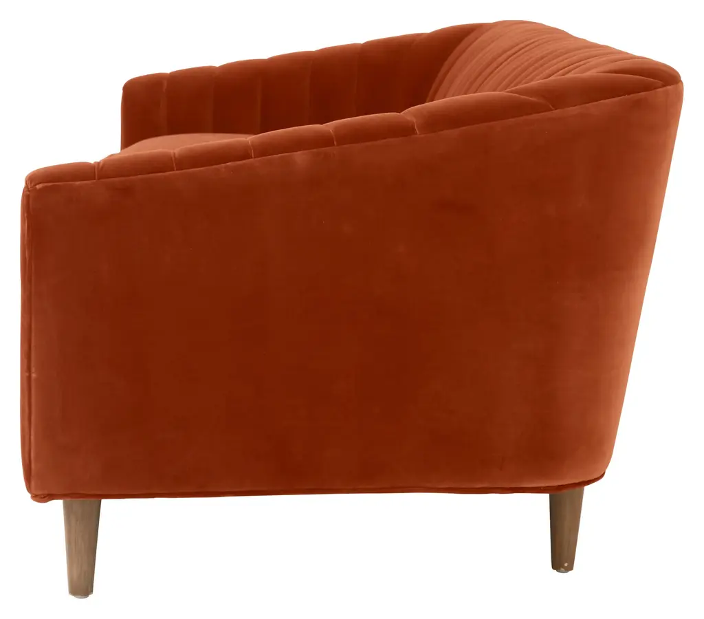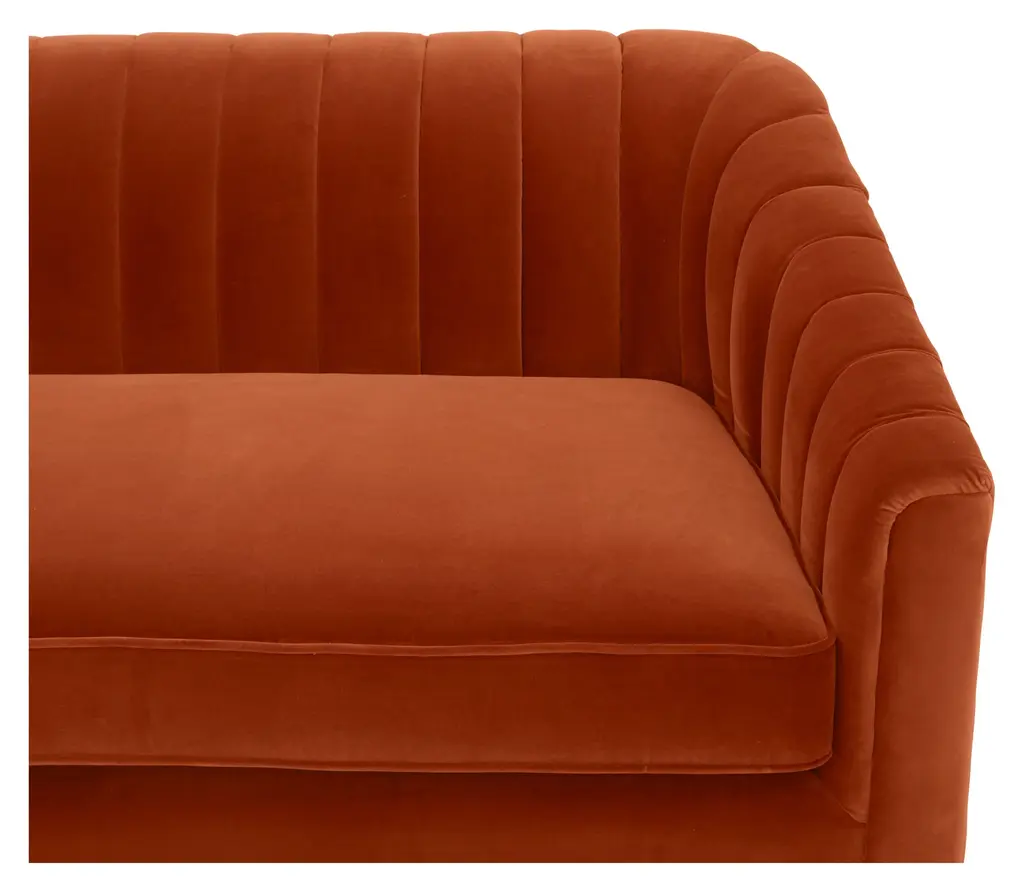 Bring a retro feel to your space with our streamlined Hadley Sofa. Inspired by mid-century design, this chic, low-lying sofa features rounded edges and sumptuous burnt orange velvet upholstery. Vertical channel tufting and tapered parawood legs complete Hadley’s vintage vibe. Along with its good looks, this perfectly p