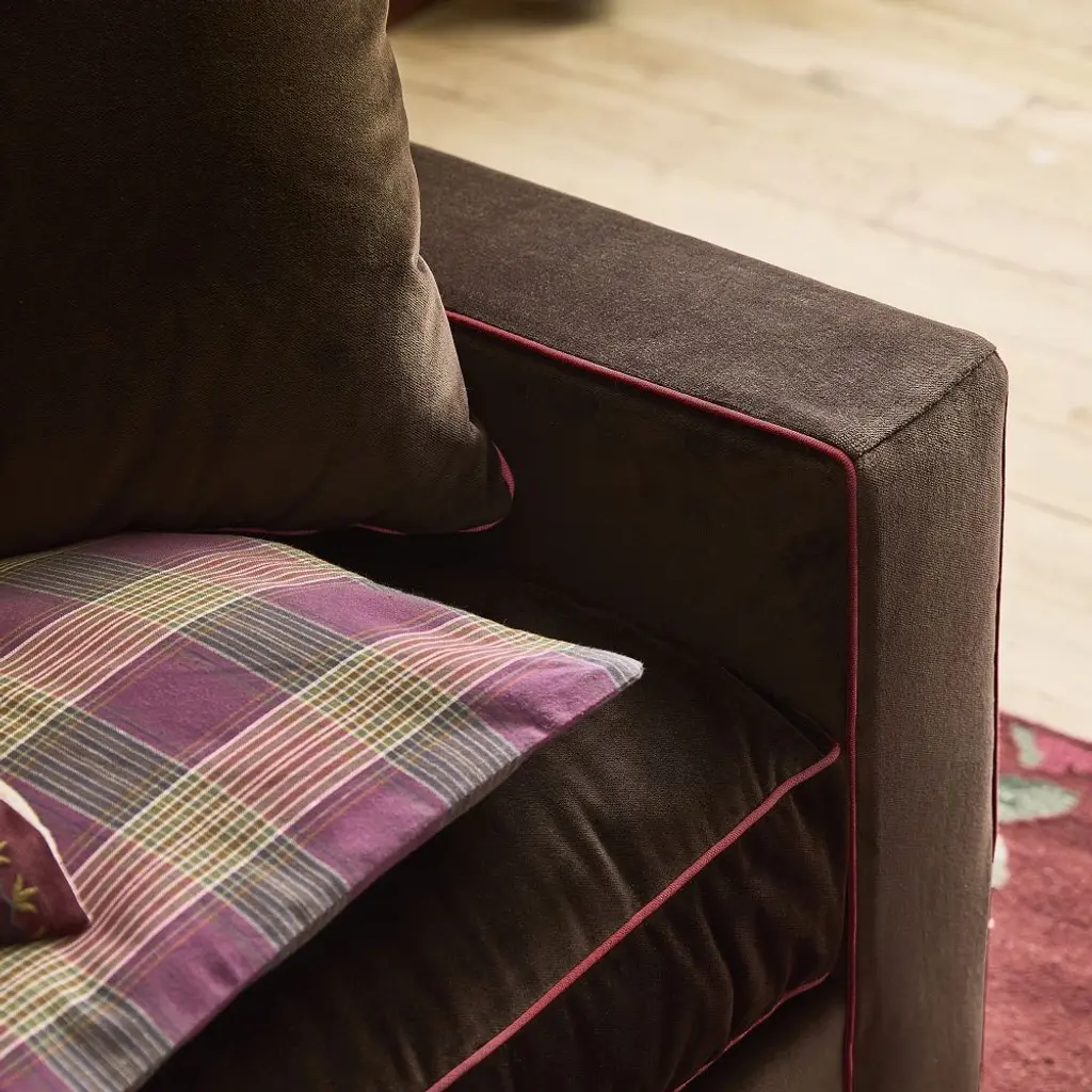 Piping hot chocolate and pink. From its brown velvet upholstery and mulberry piping by renowned passementier (trim-maker) Samuel & Sons, to its FSC®-certified frame and cushy natural padding, this sofa is a statement piece. Our 87" sofa is shown here with responsible down and feather cushions.