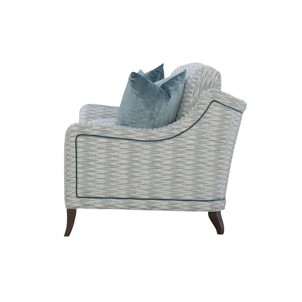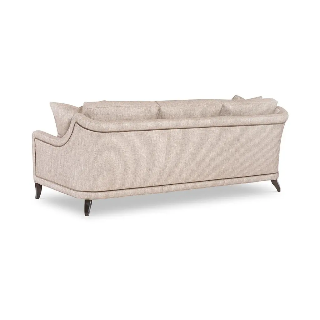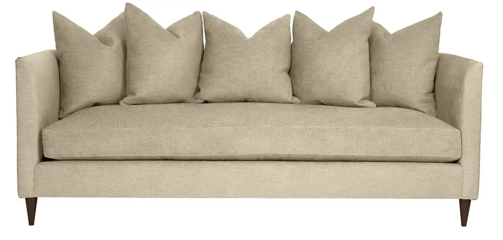 With three loose back cushions and boxed cushion seats, with low profile arms, raised on flared tapered legs, with framed trimwork to the sides.Proudly made in the USA, each piece boasts traditional 8-way hand-tied construction and toxin-free, kiln-dried solid Maple frames sourced from US-grown trees.The framed trimwork to the sides exudes elegance, showcasing the artistry behind this exceptional furniture. Included are two 21 x 21 throw pillows, providing the perfect finishing touch to your haven.Tailor your sofa to match your unique style. We offer a plethora of customization options, from a variety of fabrics and leathers to different leg finishes. This is not just furniture; it's a statement piece that reflects your personality.Dimensions: Outside: 88" W x 38" D x 36" HInside: 76" W x 22" D x 19" HSeat: 18" HArms: 24" HSeat cushion - Comfort DownBack cushion - loose pillow, blendownCurrent lead time is 20 weeks. Pricing below is for one of our common fabrics. Fabric shown may no longer be available.Please contact us for information and further details.Matching armchairs are also available.