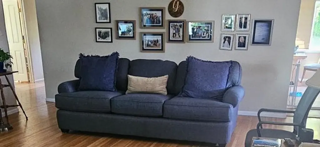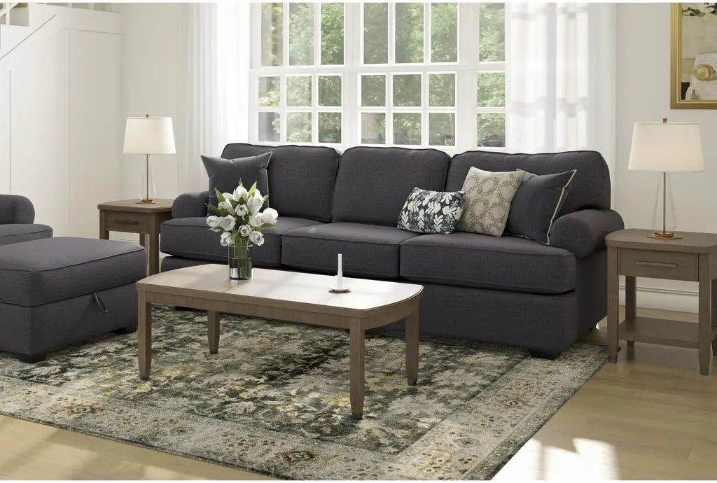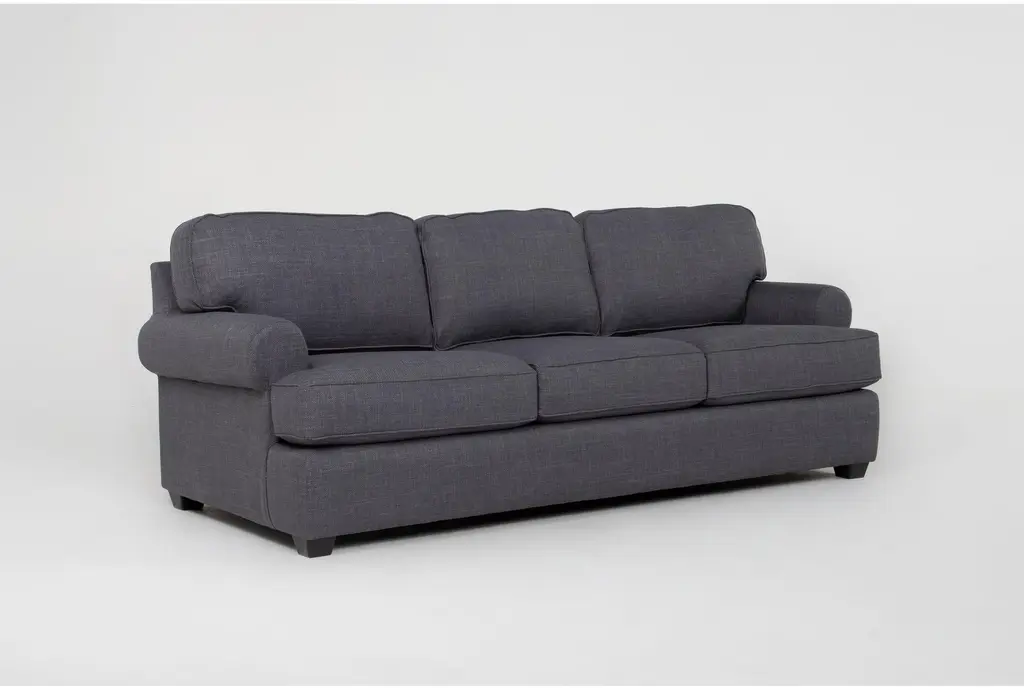 Hampstead II Blue 97" Sofa delivers spacious comfort with its clean, inviting design and durable blue-grey fabric upholstery for comfortable, carefree lounging in any space.